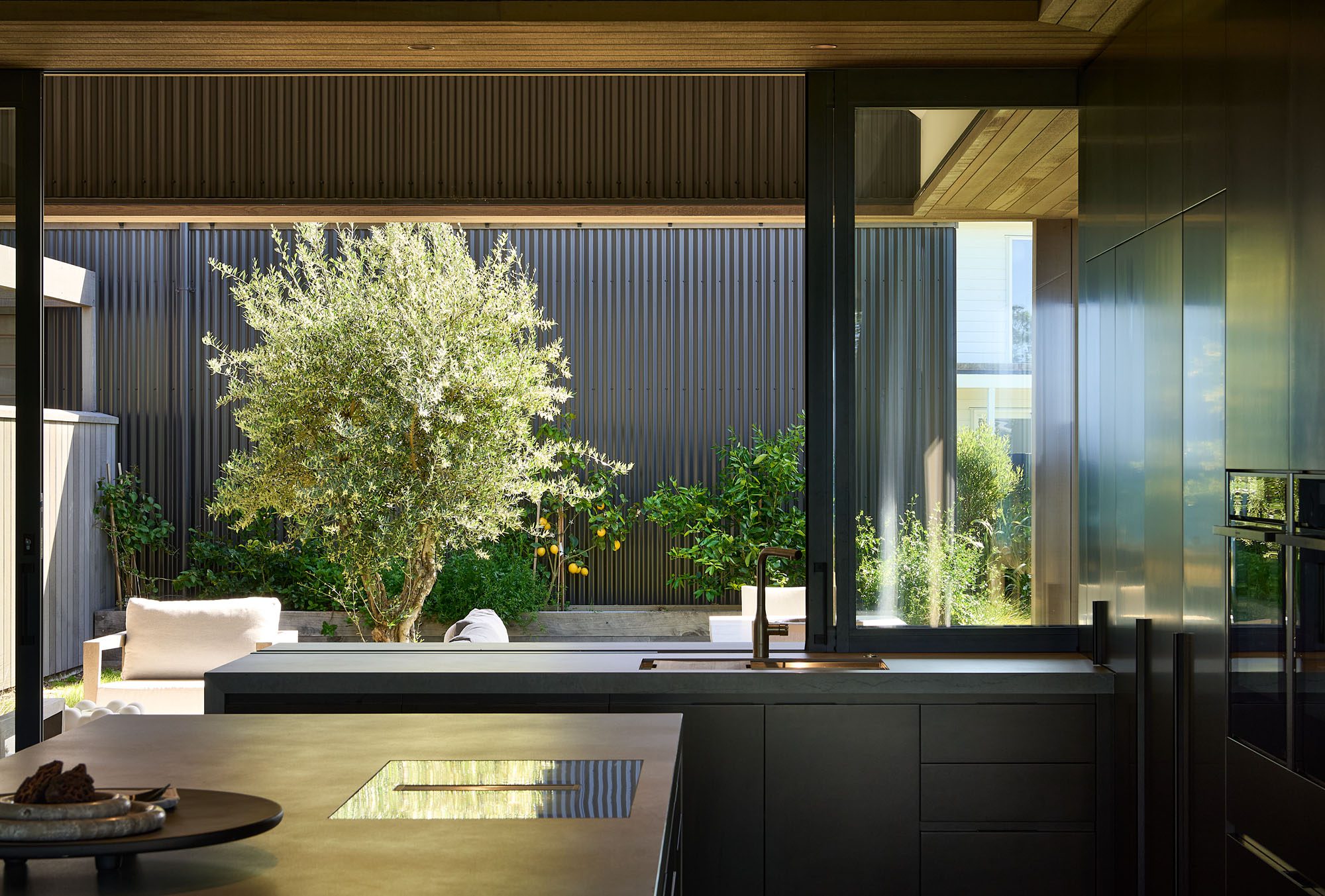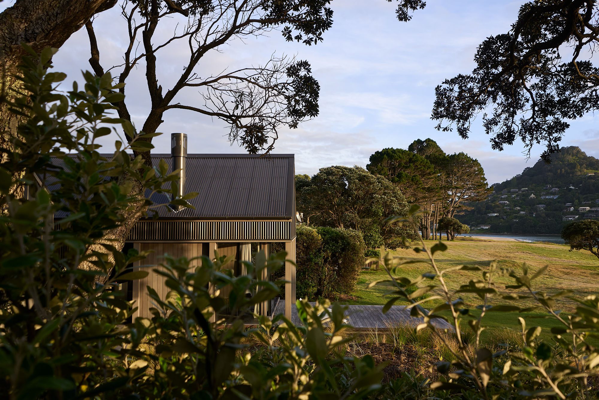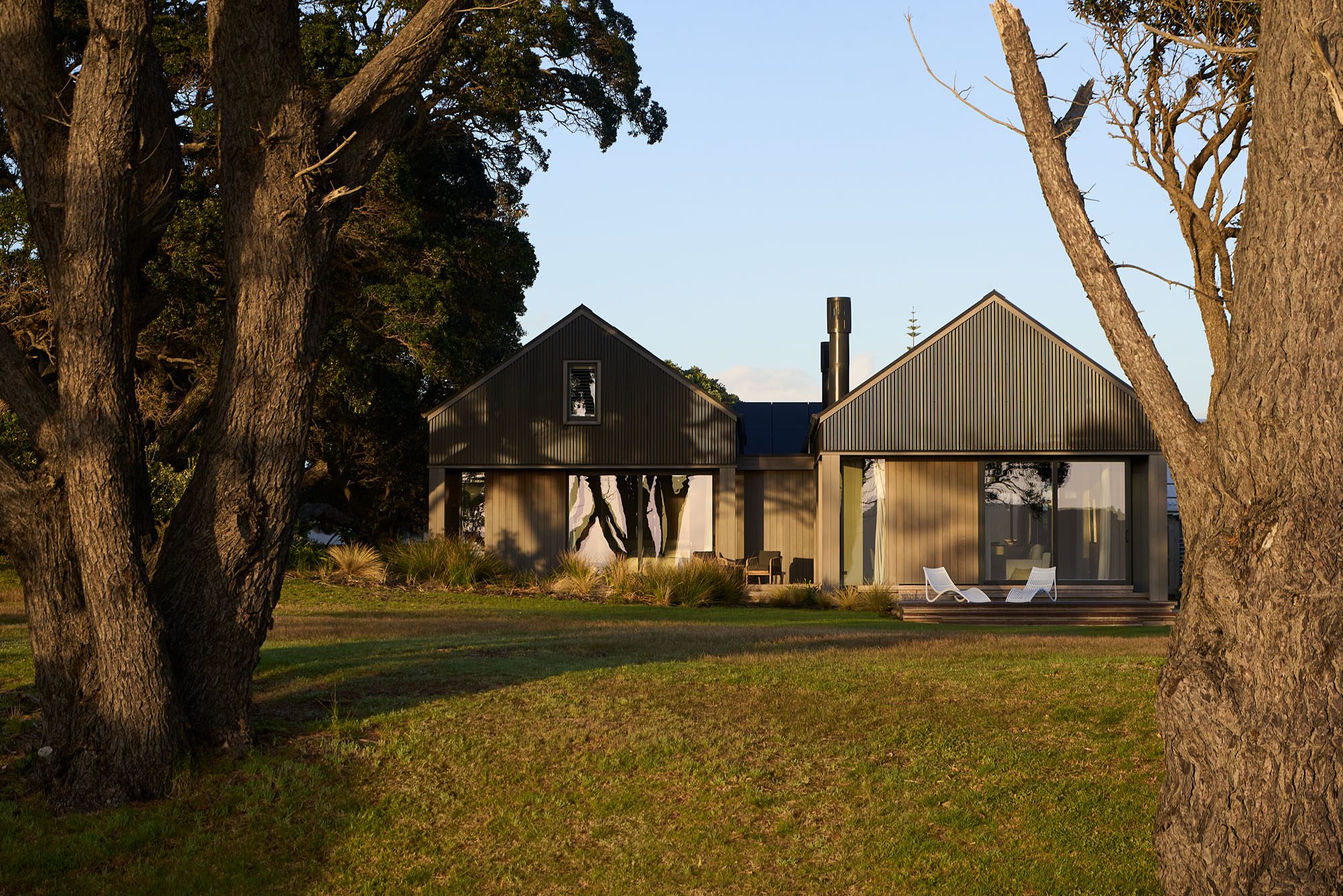 Outside, a pōhutukawa that drapes about 30 per cent of the site, Norfolk pines, and other evergreens provide further drama and contrast with the dunescape of Pauanui.