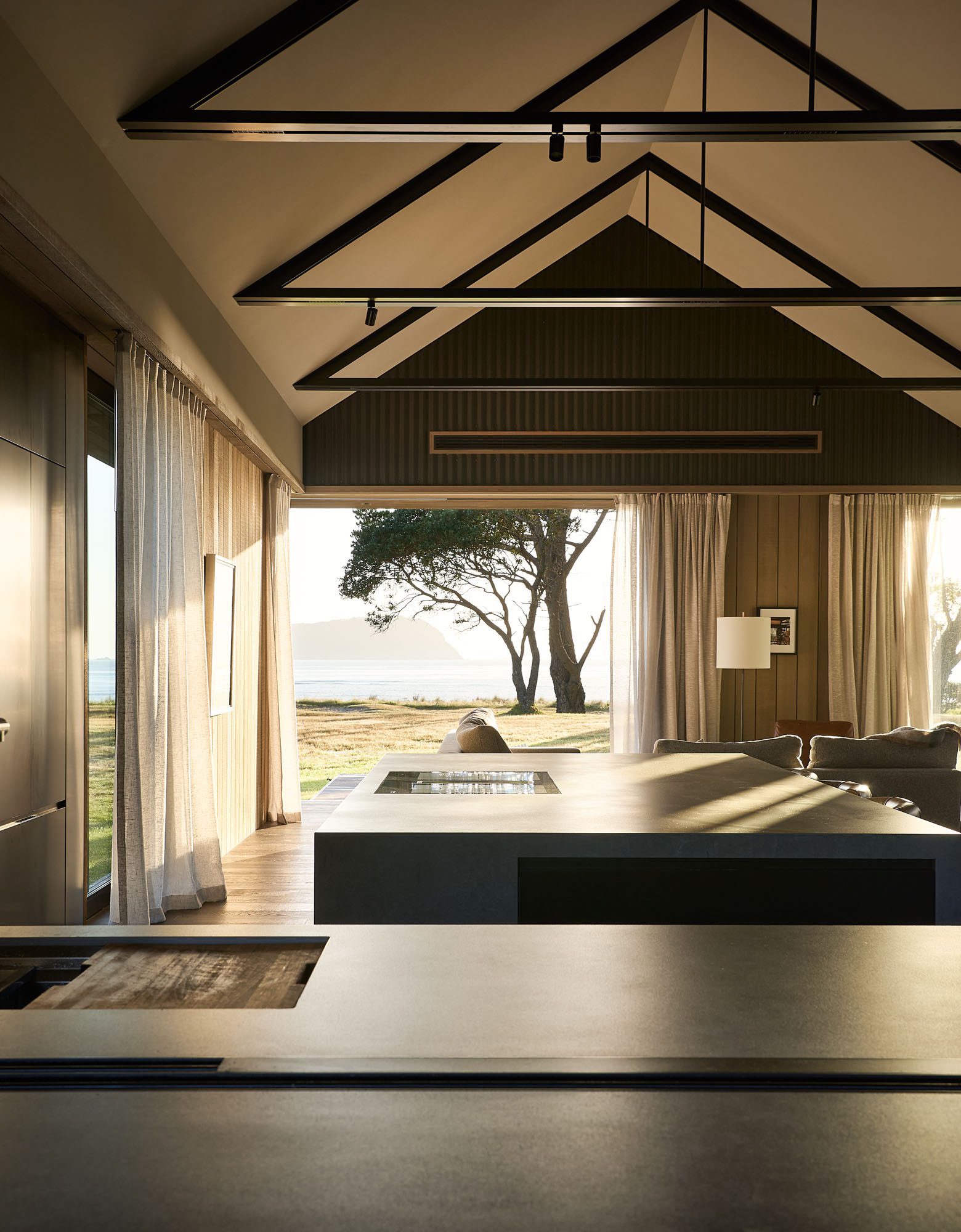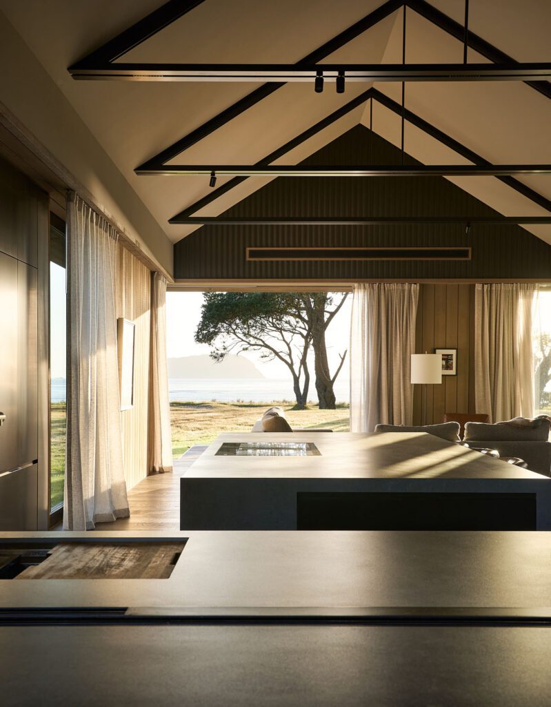 “There’s an ambience that’s quite special about this property,” Sam remarks, noting how the elongated, twisted limbs of the pōhutukawa cast shadows that at times turn pitch black against a burning sunset. Downlights articulating the generous island and textured floor, together with the orange glow of internal and external fireplaces and the oily sheen of the ocean beyond, create a layered and distinctive coastal mood.