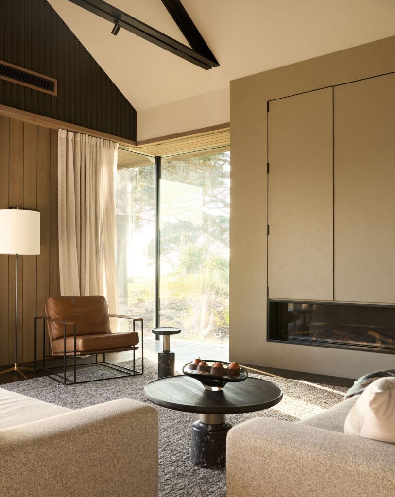 We decided to be a little bit creative,” says Sam Baxter, director at Sumich Chaplin Architects. “Driven by that Ghost Writer concept, we turned the house perpendicular to the beach with snippets and considered picture frame views, with big glass doors that took on angular aspects of the beach: the main room looks north-west and north-east, while the primary bedroom looks directly east or straight out onto the ocean.”
