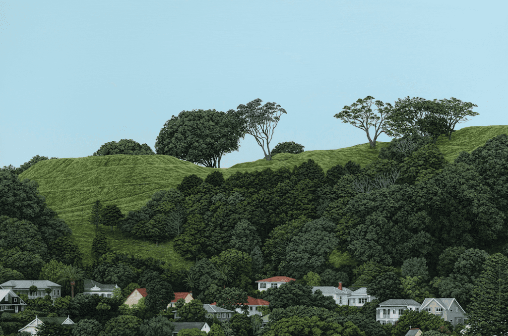 Is it beautiful? That’s the question Sara Langdon asks herself when composing portraits of Auckland’s volcanic peaks and the homes that appear to grow from their soils — built forms intricately woven into wide green canopies.