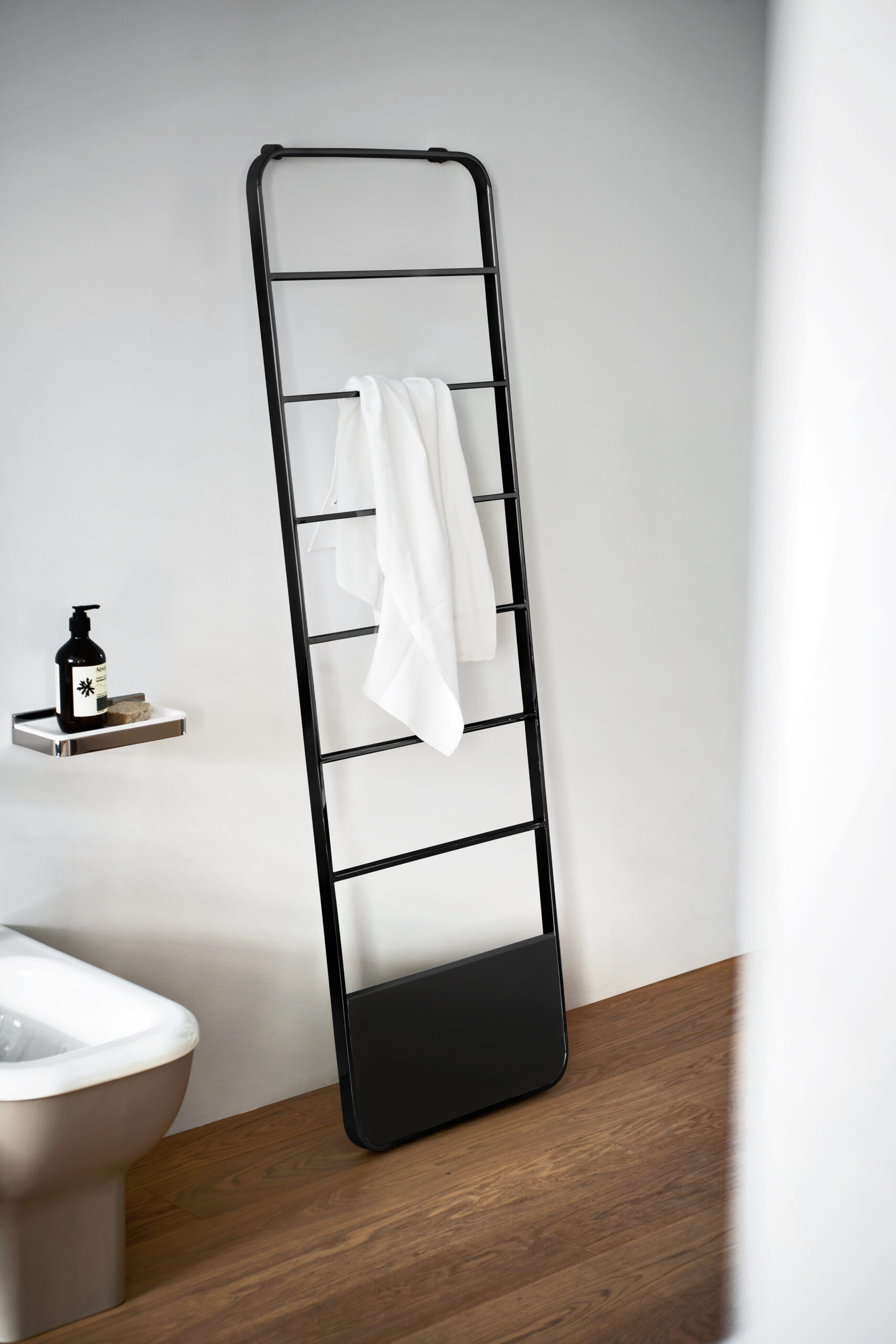 An elegant and convenient self regulating heated towel rail in steel with a polished chrome plated or black and white painted finish. It is attached to the wall through an invisible system.