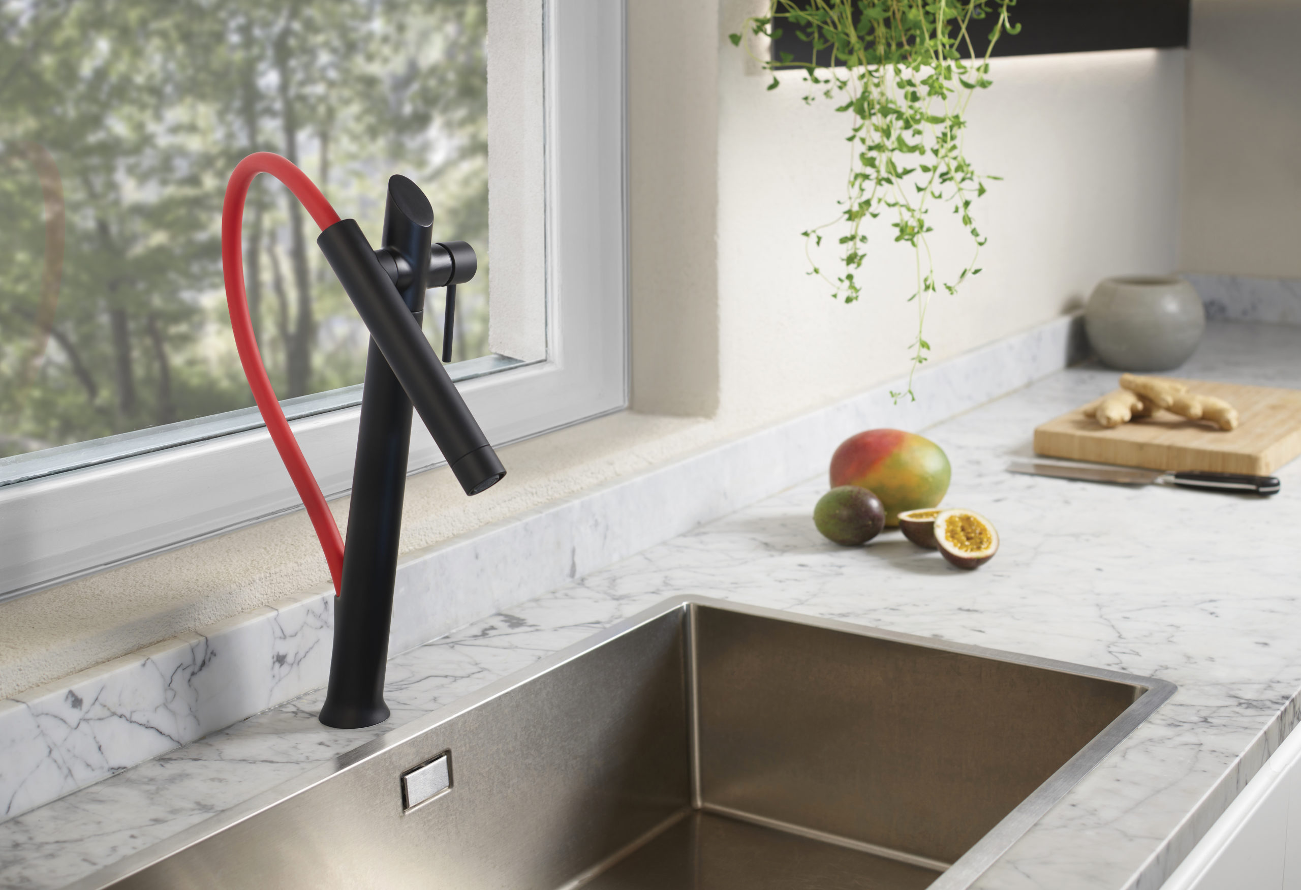 The swivelling spout is attached to the side of the core by means of an innovative magnetic system that allows a comfortable and safe inclination of the spout. Depending on the size of the sink and on its depth, the spout can be positioned to the best inclination for the best performance. The flexible hose gives an extended mobility to the removable spout. Its length is fixed but it can vary and be set based upon the wishes and the needs of the consumer during installation, improving once again the performance and the comfort.