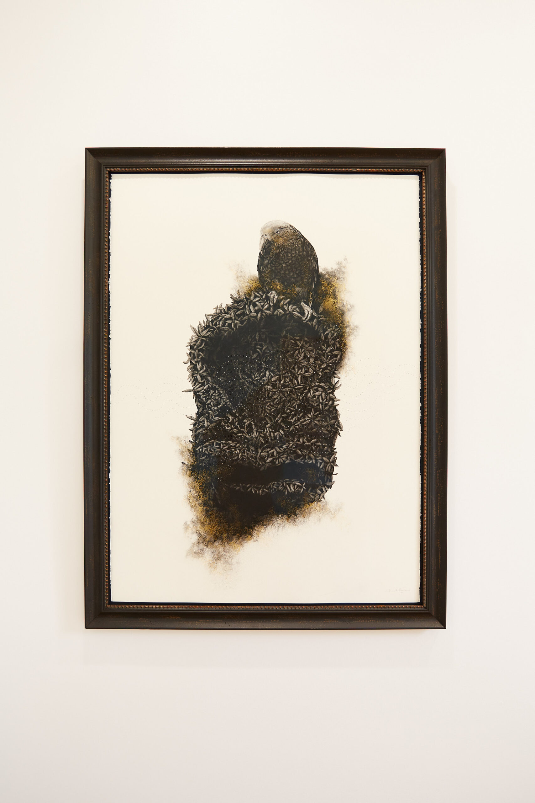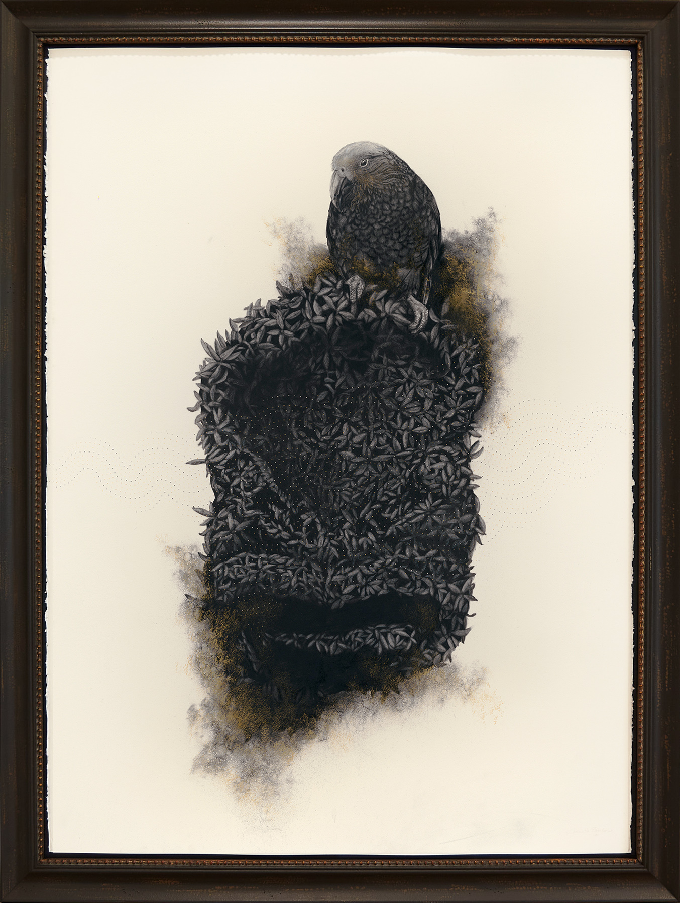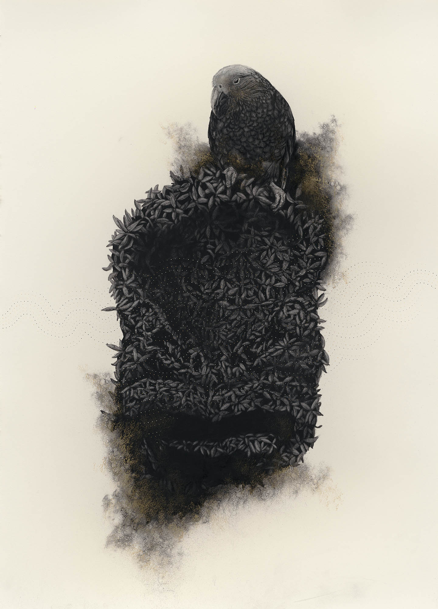 We are delighted to share this poignant, engaging, and captivating work from Gareth Barlow’s ‘Aranga’ series, ‘Shadows Of The Ashes’. Created in acrylic and charcoal on paper, includes charcoal from the burnt taonga the work is based on.