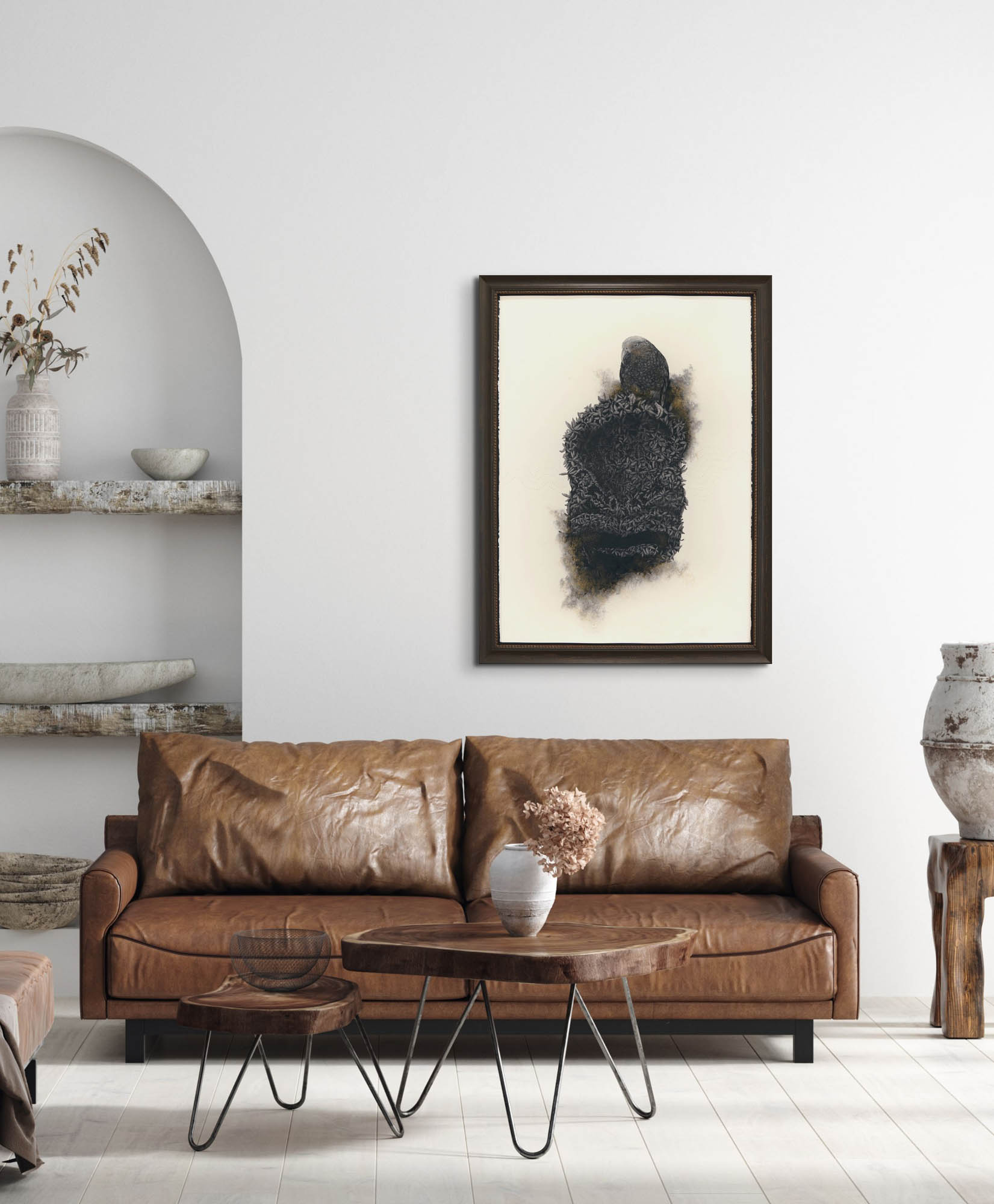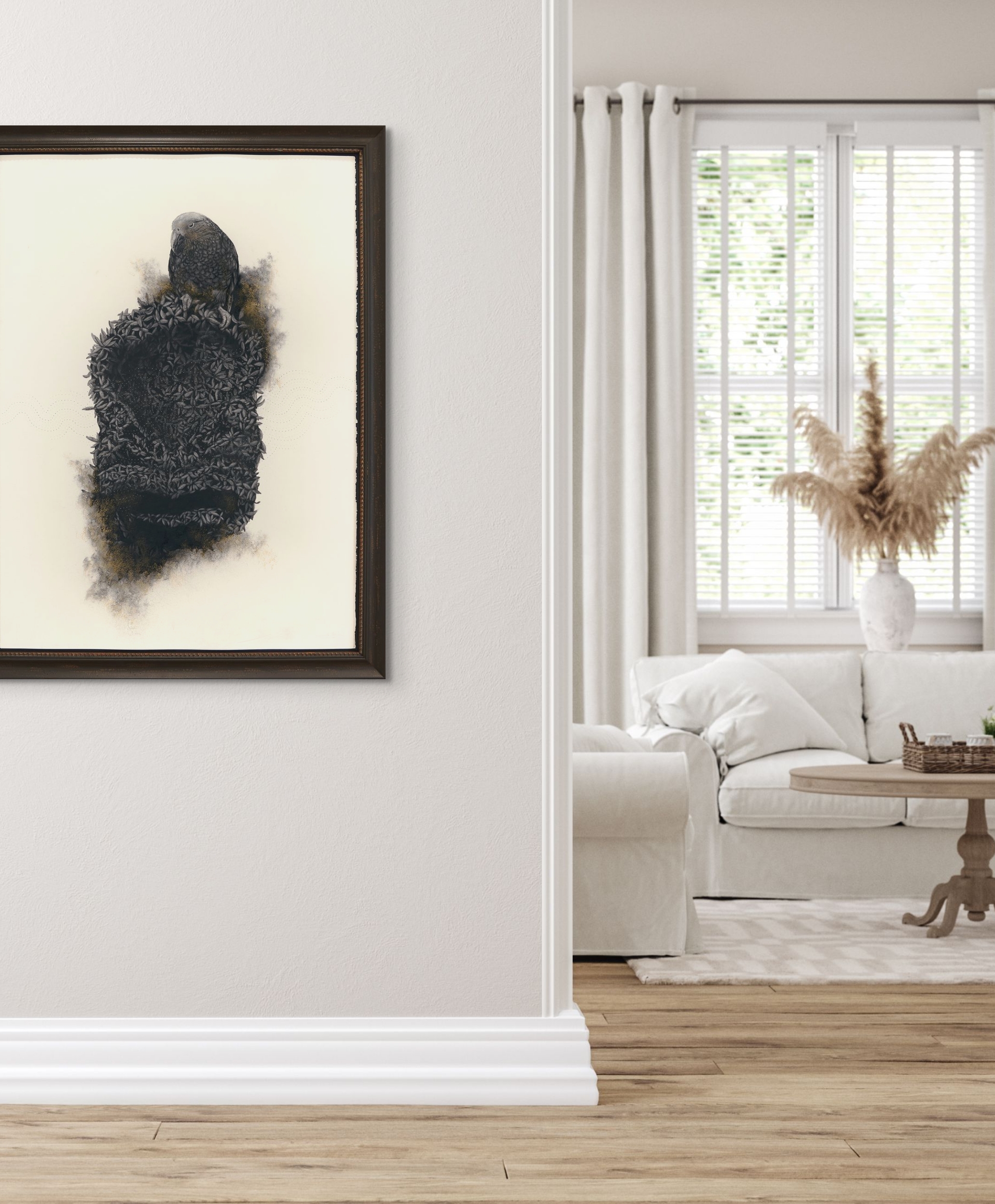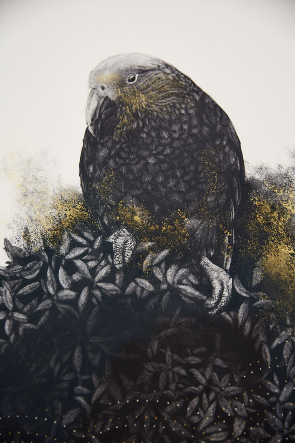 We are delighted to share this poignant, engaging, and captivating work from Gareth Barlow’s ‘Aranga’ series, ‘Shadows Of The Ashes’. Created in acrylic and charcoal on paper, includes charcoal from the burnt taonga the work is based on.