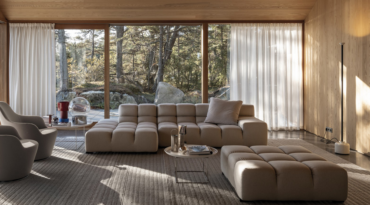 An interpretation of the Chesterfield and Capitonné style, Tufty-Time modernises them for a free and casual lifestyle. This versatile system finds effective answers to the themes of modularity, comfort and removable covers by forming the various elements that create traditional linear sofas, corner sofas, peninsula-shaped compositions and island elements allowing 360-degree seating. The upholstery in fabric or leather is subdivided into large squares that are joined by pleats and are perforated in the leather version.