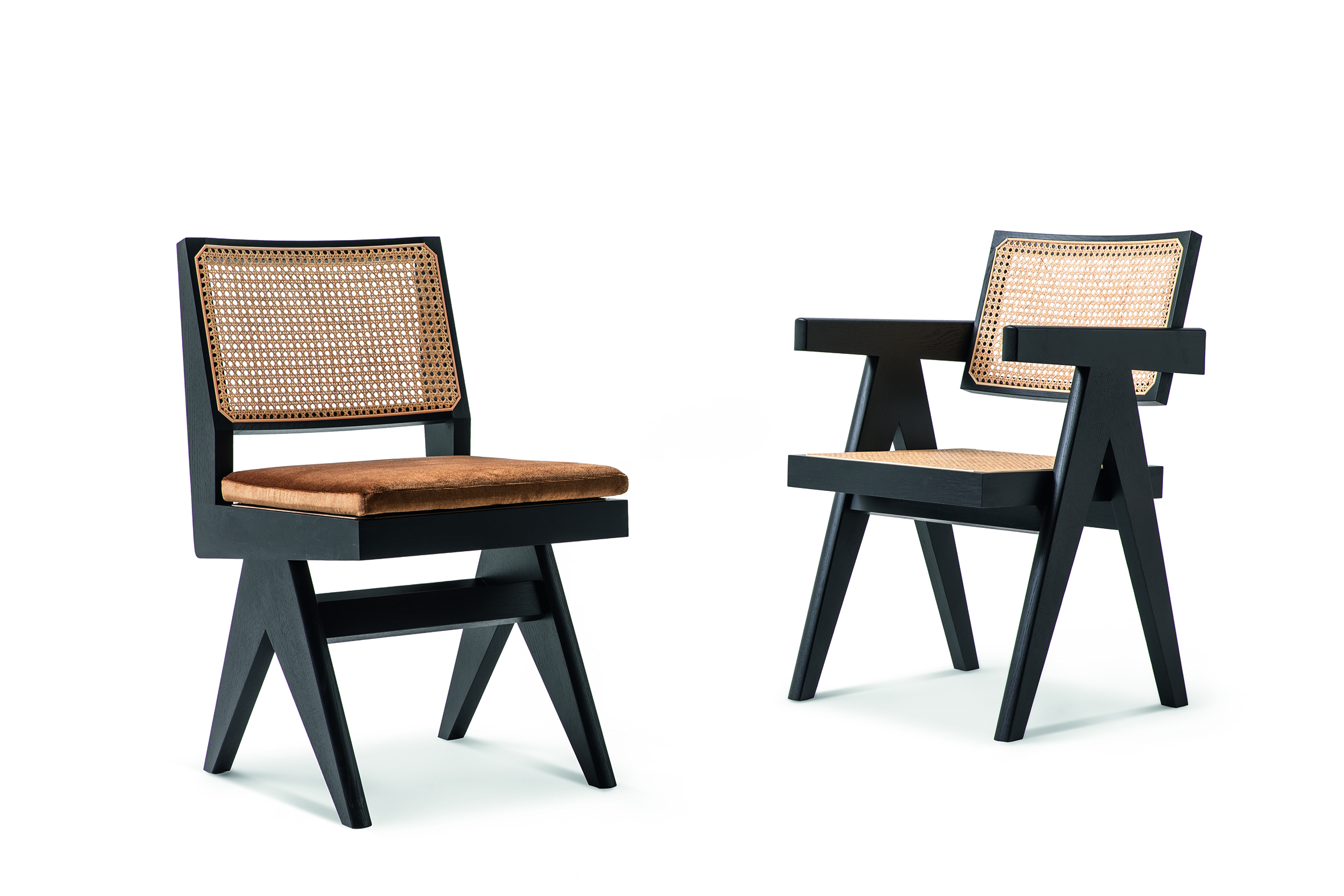 This chair is one of the most recognisable in Chandigarh’s Capitol Complex, found throughout the offices of the Secretariat. The independent pieces, including the side bars in an inverted “V” supporting the armrests, are all made of solid wood. The woven backrest and seat, stretched across a wooden frame, are elements common in the area, much like the use of local woods like teak. Similar to the better-known office chair, this armless chair also uses the “V” approach to sidebars, in this case shorter as they do not extend to the arms. Importance, instead, is given to the seating/ backrest sequence in Viennese woven cane, connected with an immense geometric section supported by two wooden profiles, and coplanar legs, that together, are simple and yet, powerful at the same time. Cassina’s reissue offers the classic version in teak, and two versions in natural and stained black oak.