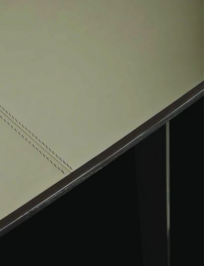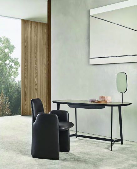 Mathieu, a desk with a slender silhouette, where the gentle curves of the top are in complete harmony with the elegance of the decided lines of the structure. The mix of materials (emery-leather, wood, and metal) are enhanced by their very contrast. The drawer conceals itself quite discreetly A refined design solution yet that doesn’t lack functionality, also thanks to the drawer that conceals itself quite discreetly.