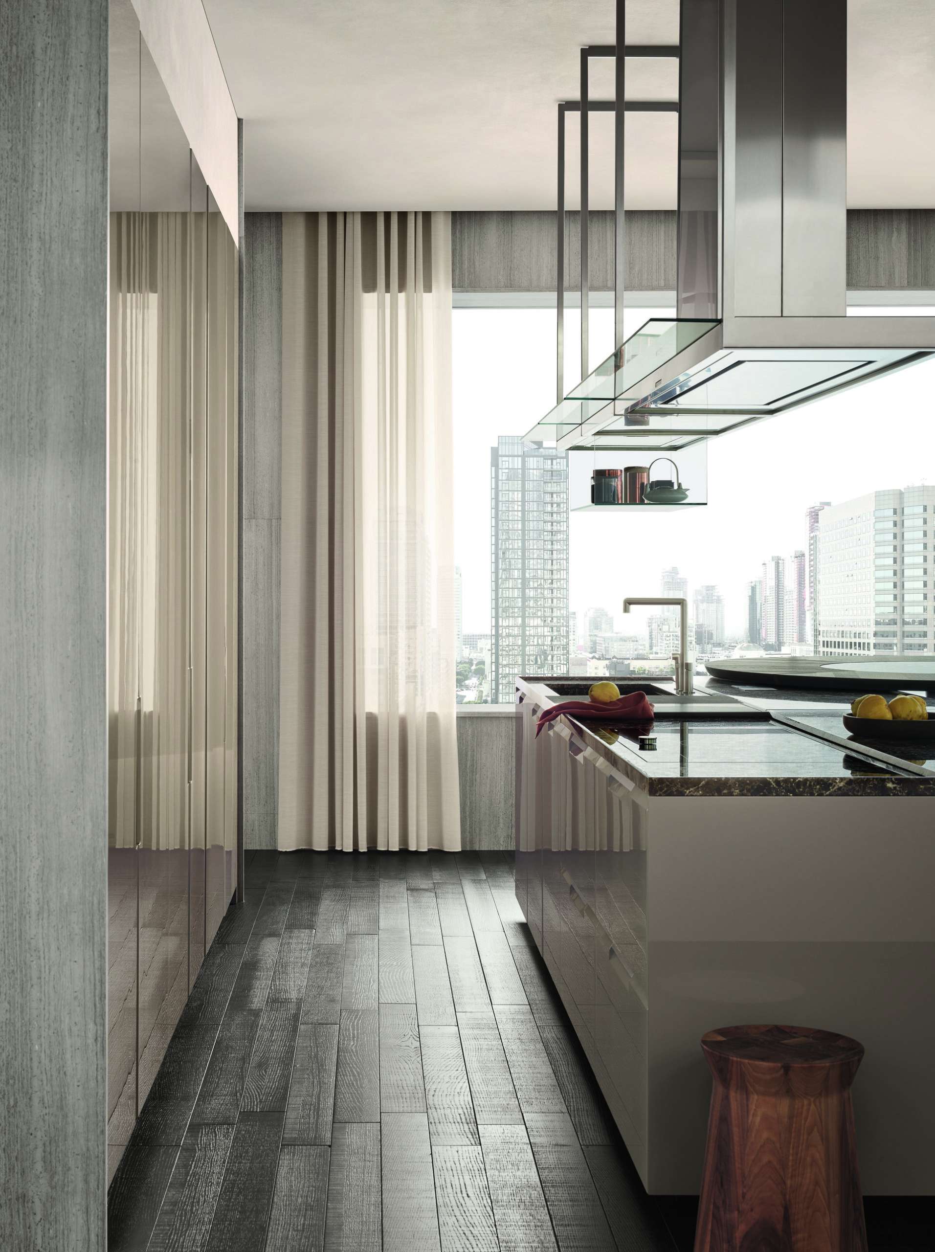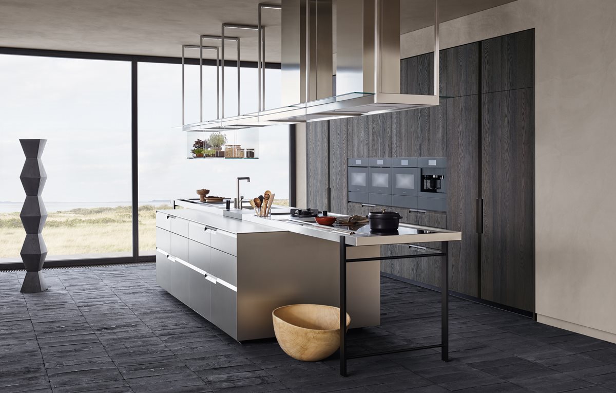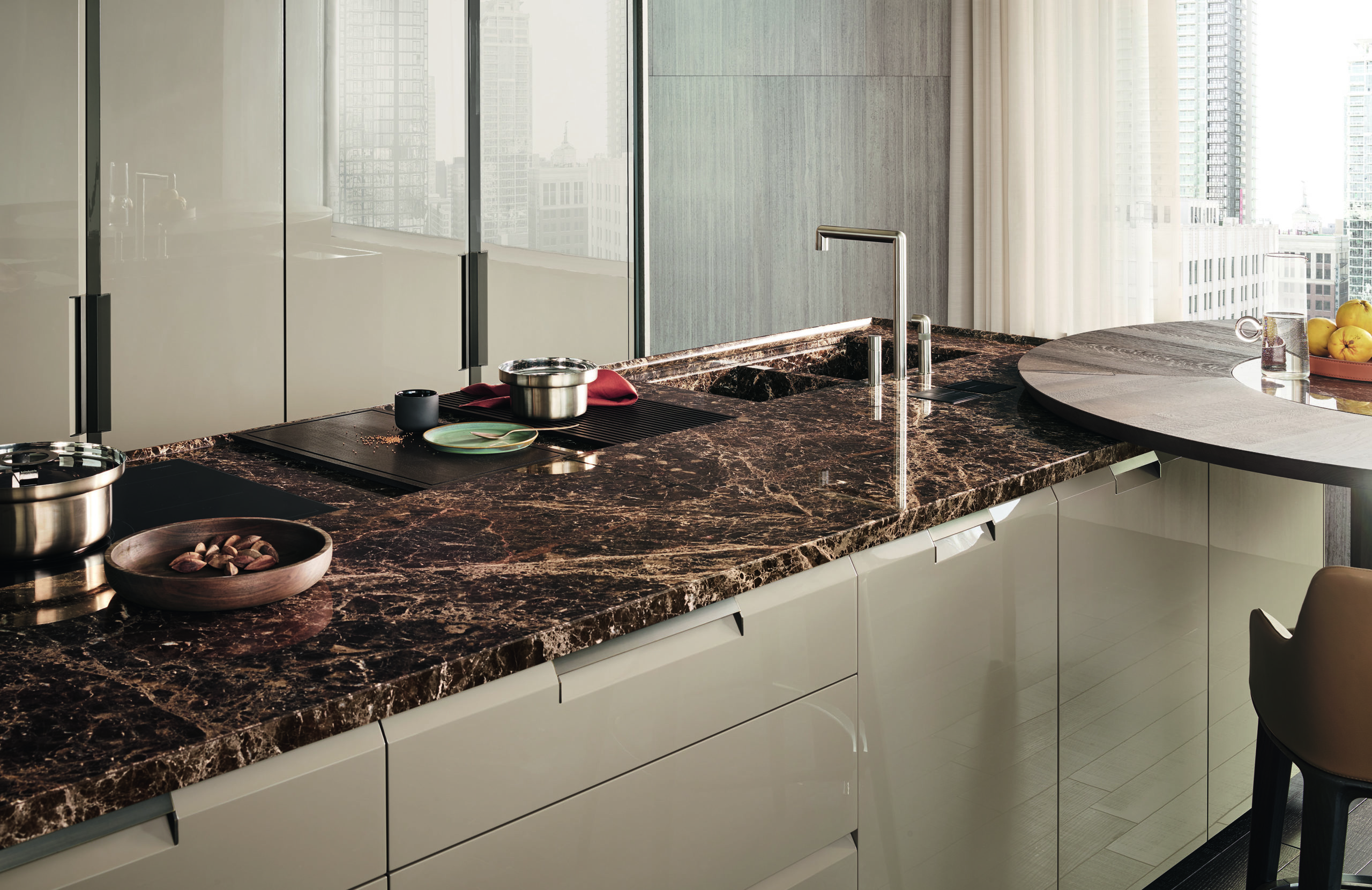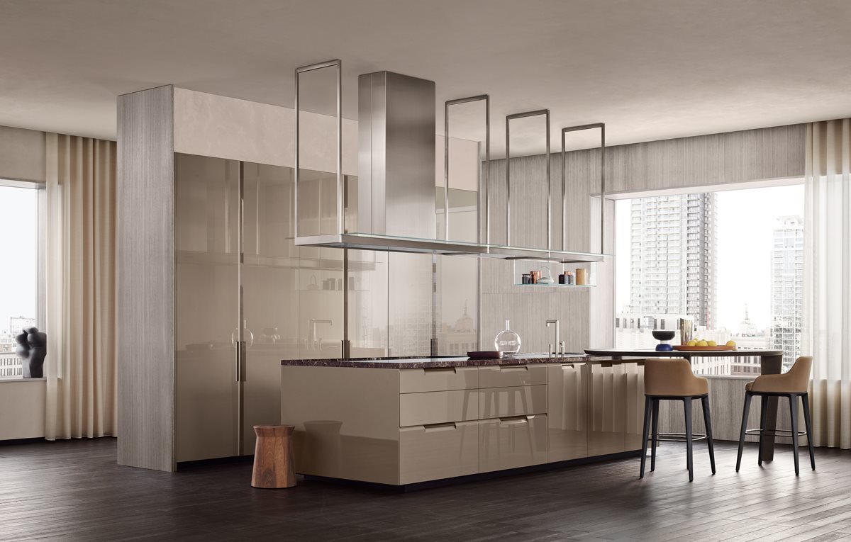 A model that is inspired, for practicality, to kitchens without handles, with a new and contemporary design, where a molding runs through bases and columns, resulting in a tapered cut, within which the characteristic built-in integrated handle is inserted.