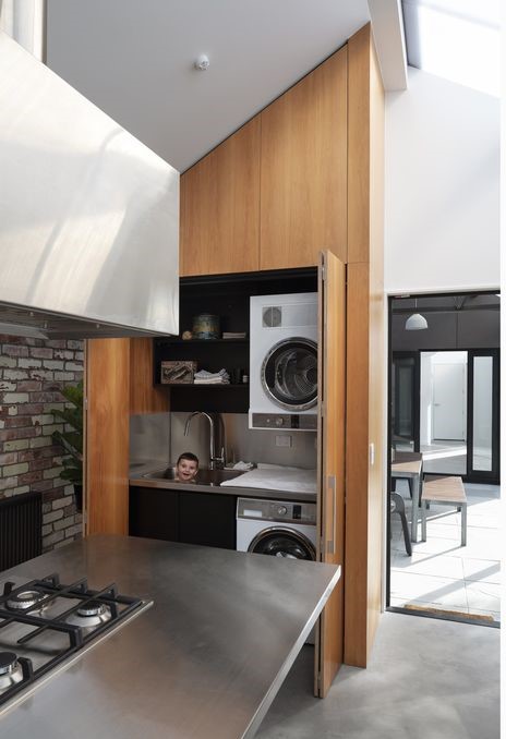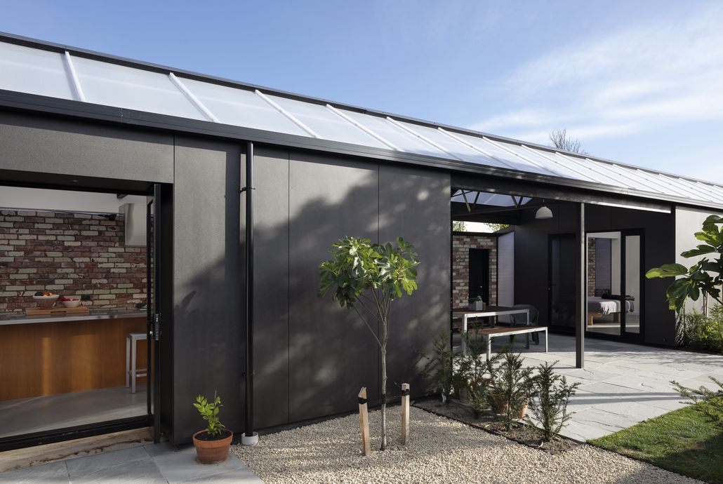 The addition is clad in steel plate cladding panels so that the greenhouse form of polycarbonate and steel is a foil to the weatherboard materiality of the cottage.