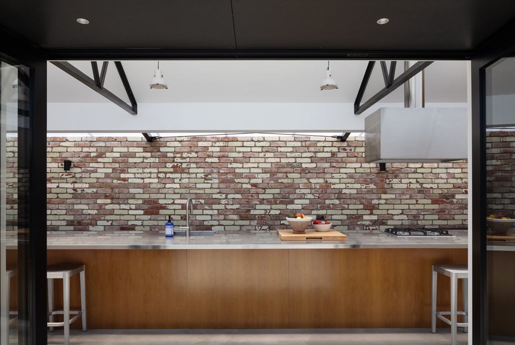 In the context of a greenhouse form, (the client’s grandparents and family were greenhouse growers) north face of the gable roof is clad in polycarbonate to allow daylight and warmth into all new spaces. A recycled brick wall runs the entire length of the south side of the lean-to to provide a strongly insulated spine to the neighbour’s boundary. The original cottage has been refurbished and living space expanded into the original bathroom and kitchen areas.