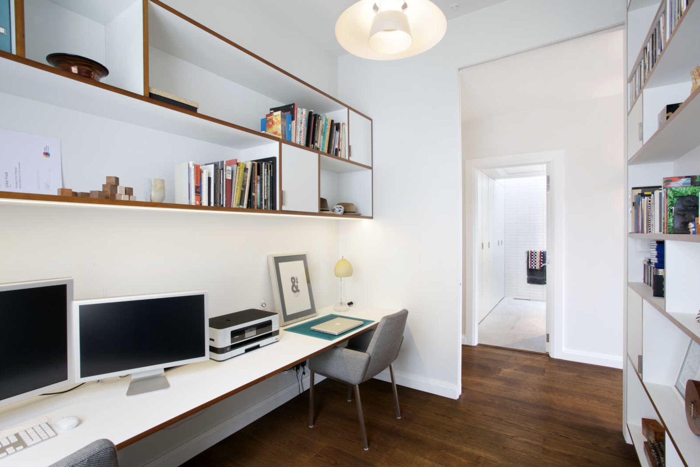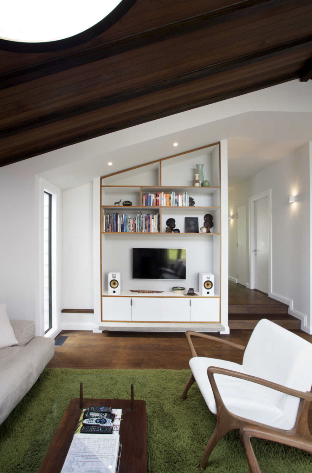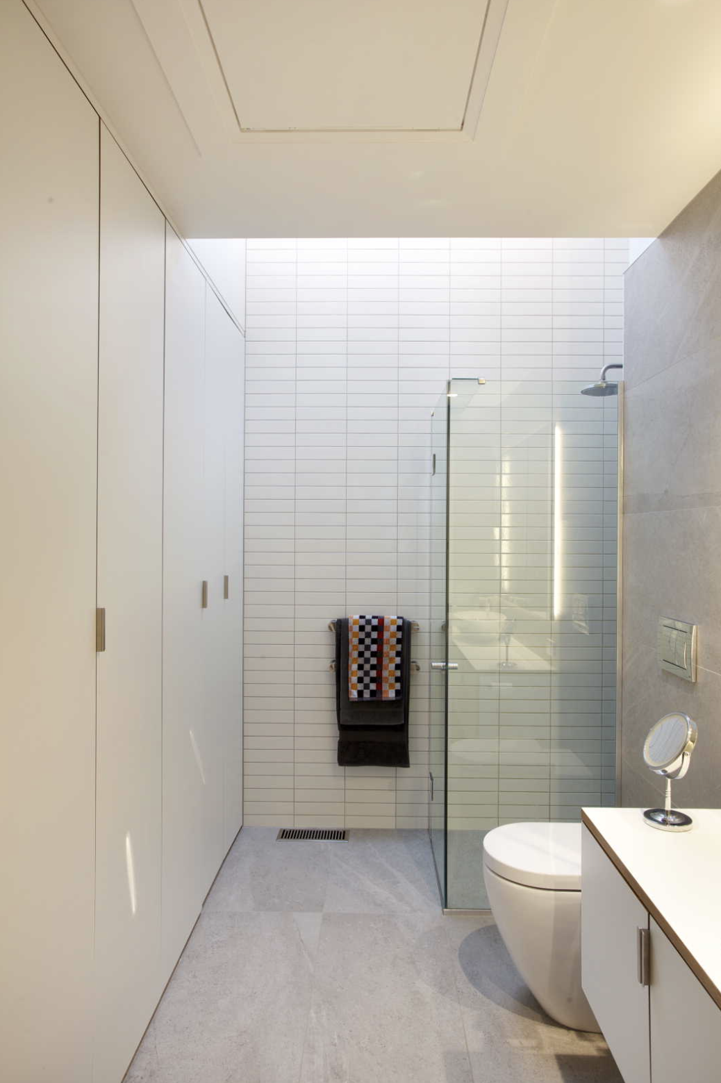 Our design referenced the traditional villa layout by arranging rooms either side of a central hallway leading to a new addition at the rear of the house, which in turn opens out to a new deck and rear garden. The ensuite & bathroom make efficient use of the limited space in the compact house, while built-in cabinetry maximizes storage opportunities throughout.