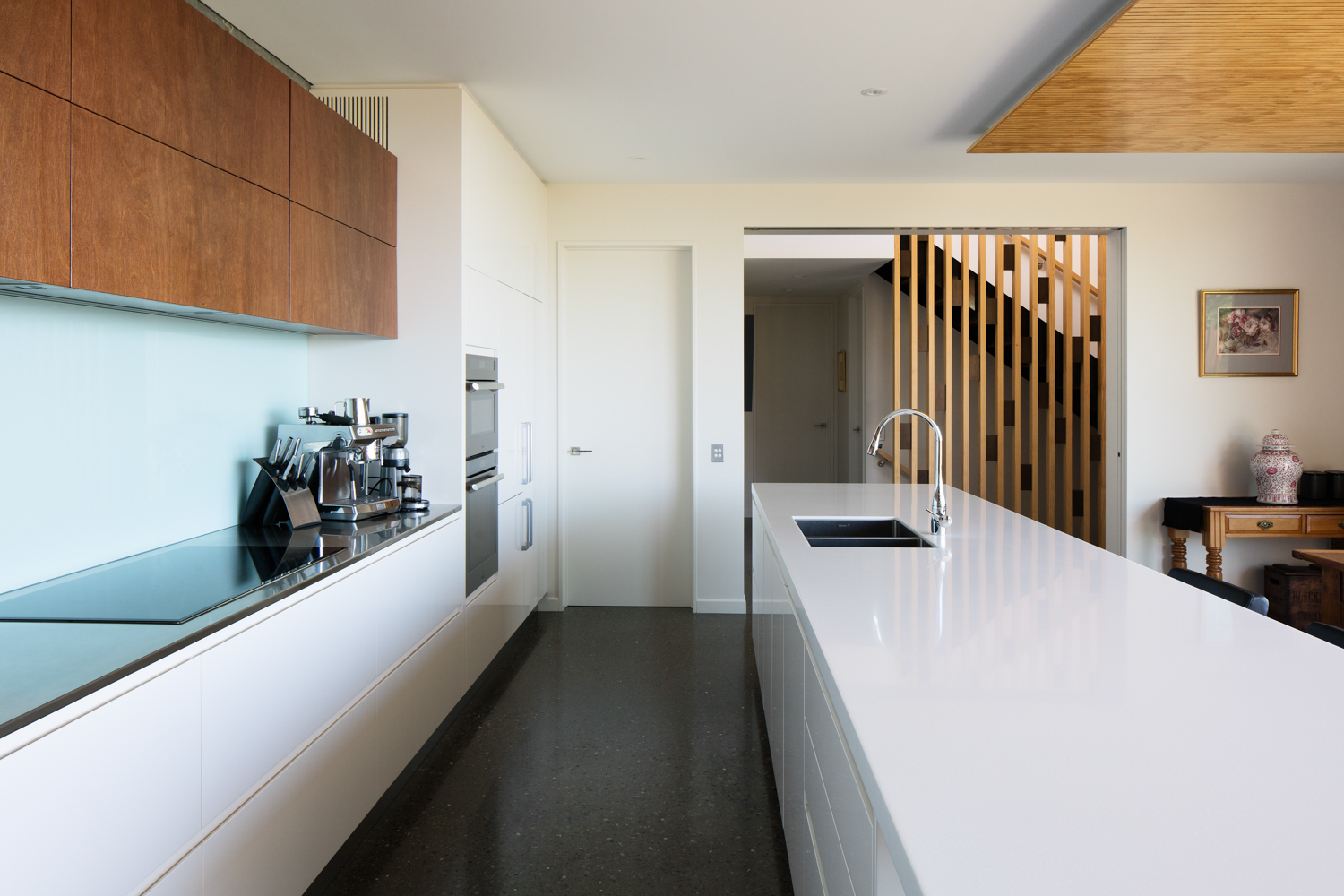 Interior joinery is designed to complement the exterior elements, including the use of gabbon and radiata timber finished in various stains. A central joinery unit in the main living area provides partial separation between the living and kitchen dining areas.