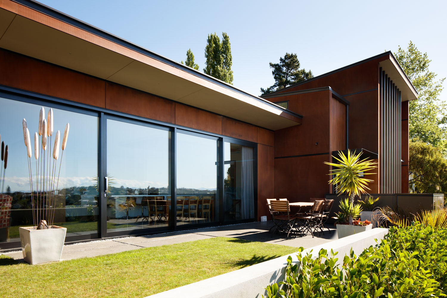 The cladding is a combination of cedar faced band sawn plywood and specialist potter ‘liquid iron’ paint. This complements the vegetation on the surrounding hill and avoids a monotone of colour to help the building to recede into the site.
