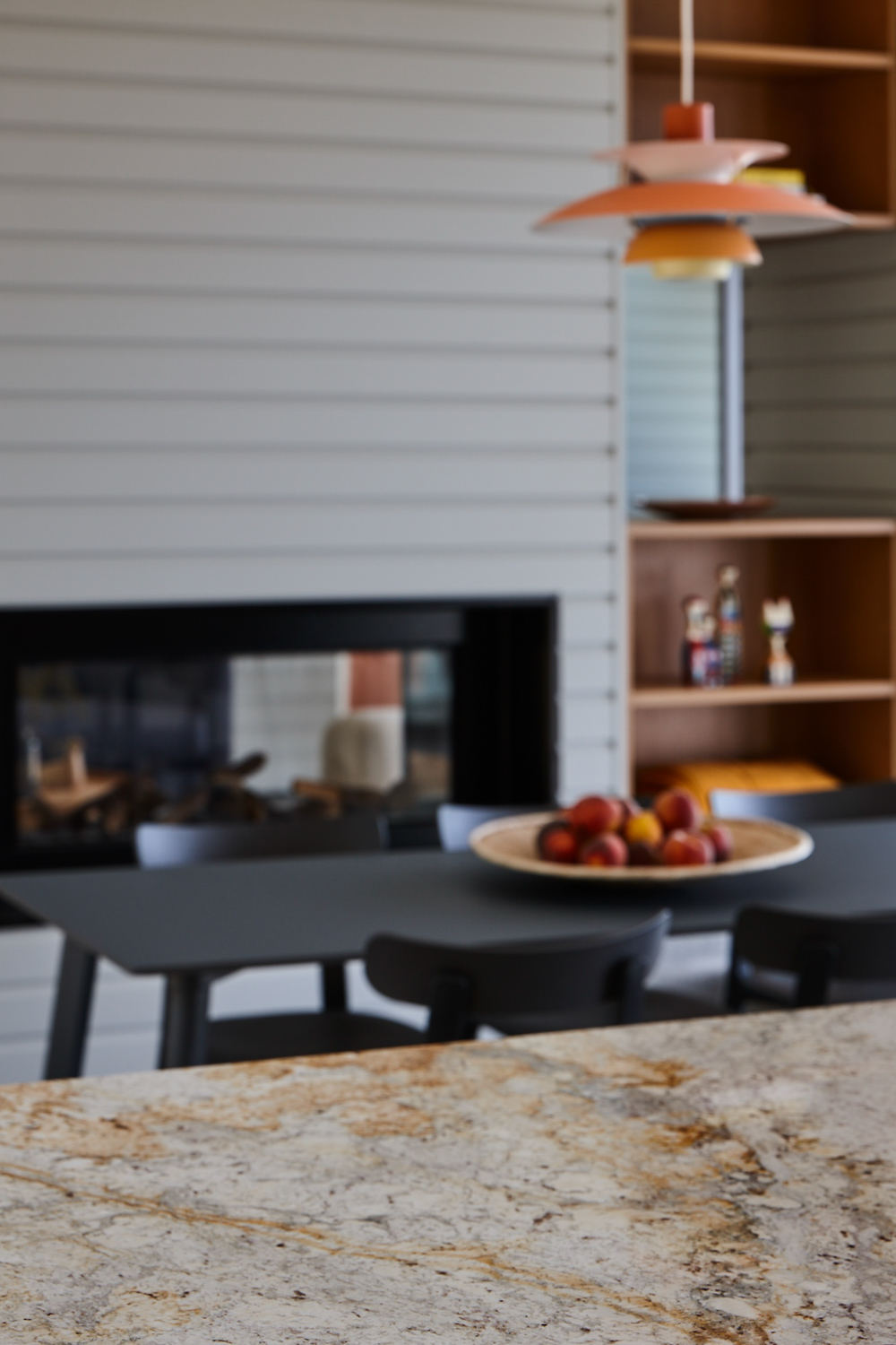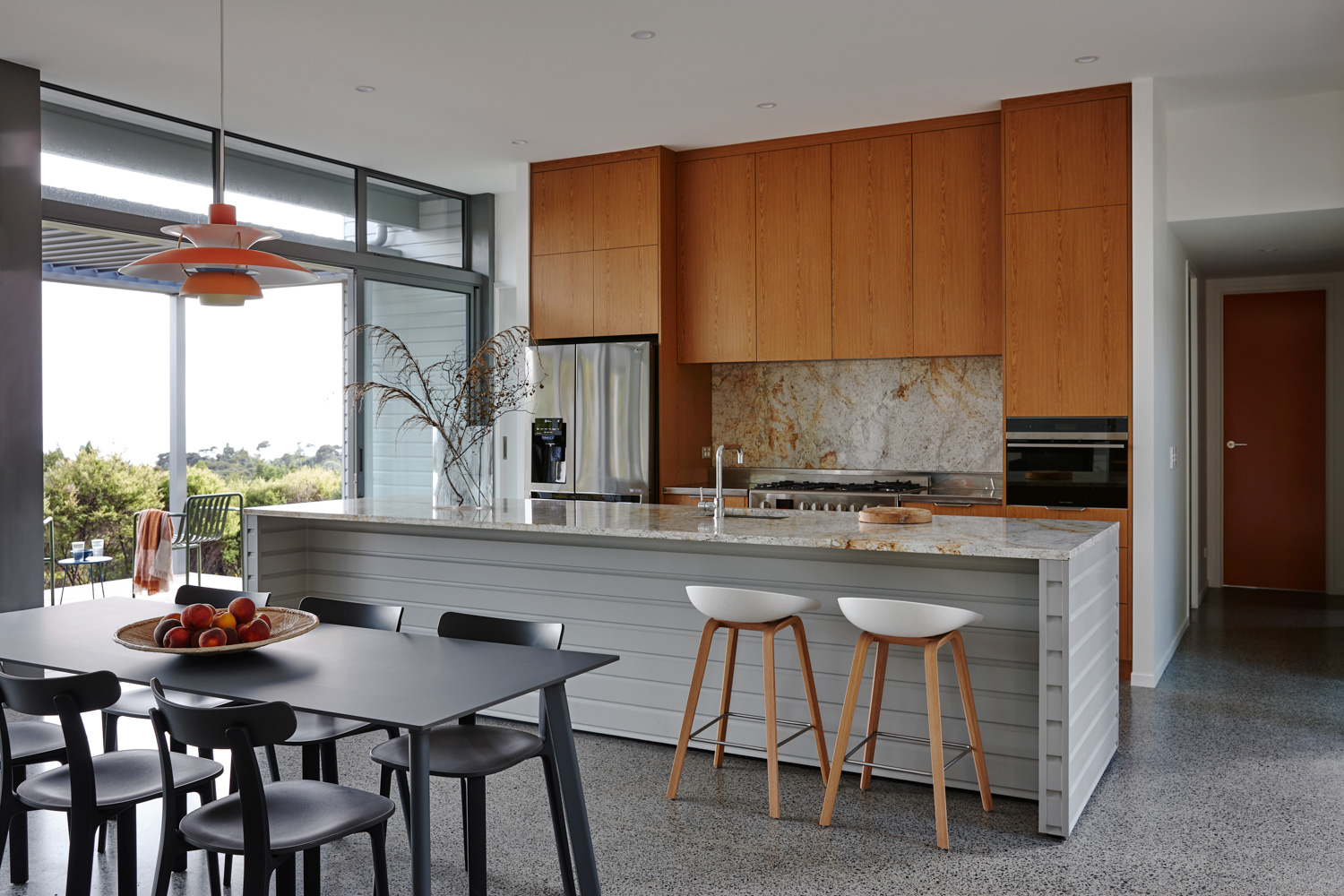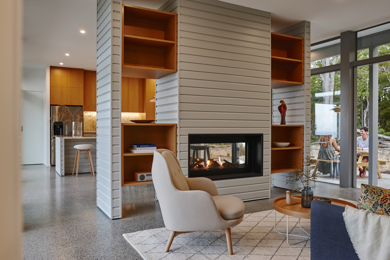 The opposite wing accommodates the entry, garage and guest/family bedrooms and bathrooms. Connecting the wings is a large kitchen, dining and living area which separates into cosy, well-defined spaces around a double-sided fireplace. It’s comfortable for two people or 20. The house nestles into its native bush setting offering distant ocean views. Exteriors reflect the tones of the surrounding landscape in the greys and greens. Yet inside, we added some vibrancy with bold shots of red, blue and orange, balanced with beautiful oak timber throughout.
