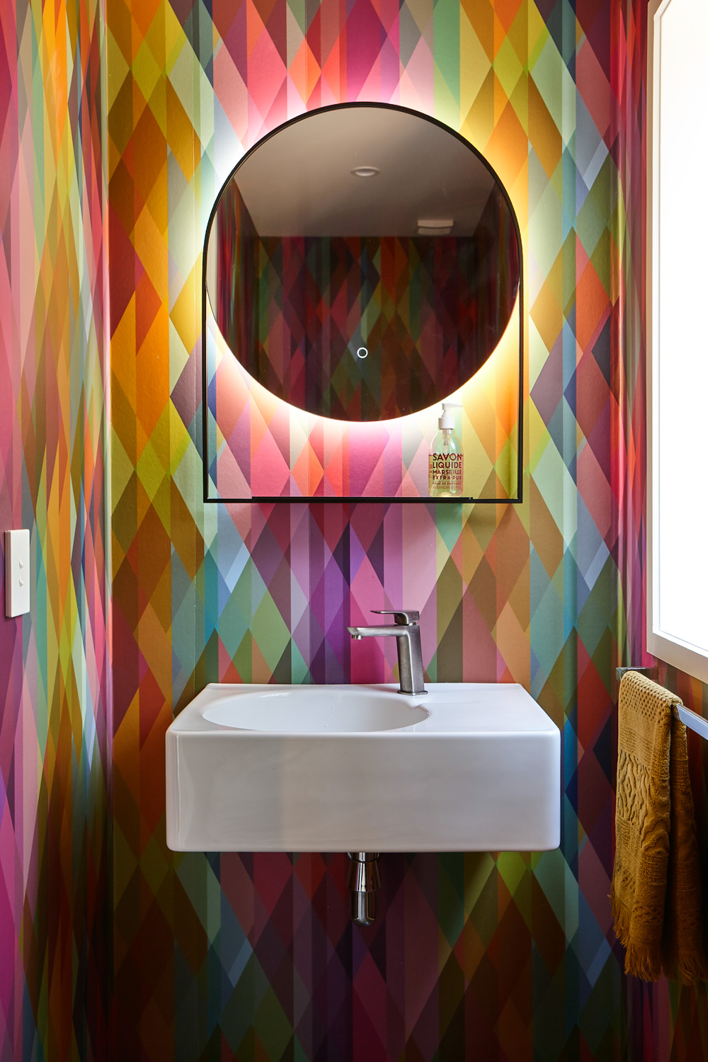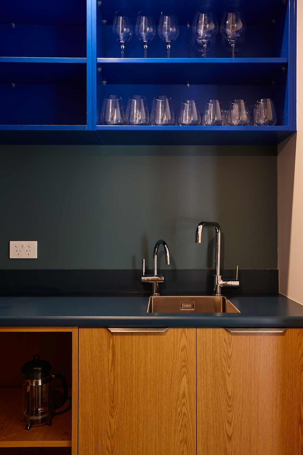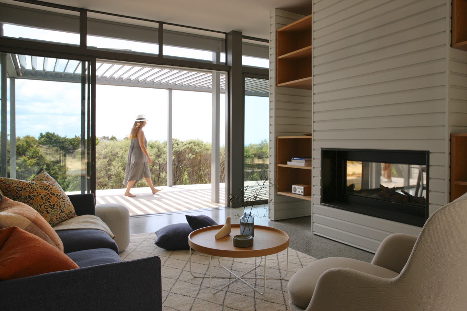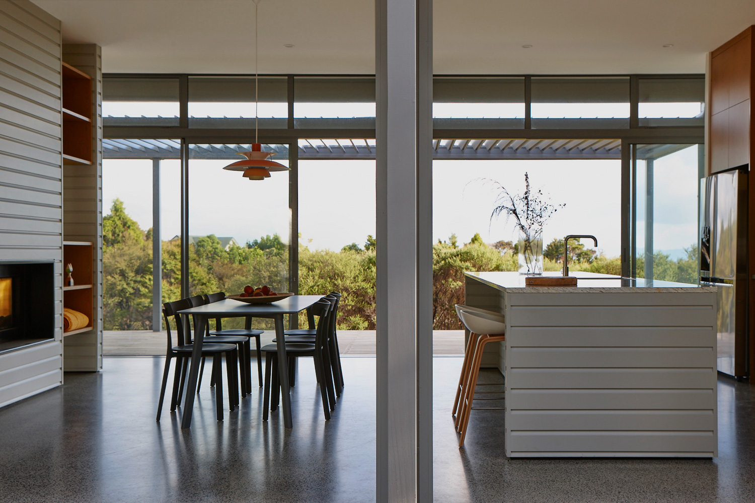 The opposite wing accommodates the entry, garage and guest/family bedrooms and bathrooms. Connecting the wings is a large kitchen, dining and living area which separates into cosy, well-defined spaces around a double-sided fireplace. It’s comfortable for two people or 20. The house nestles into its native bush setting offering distant ocean views. Exteriors reflect the tones of the surrounding landscape in the greys and greens. Yet inside, we added some vibrancy with bold shots of red, blue and orange, balanced with beautiful oak timber throughout.