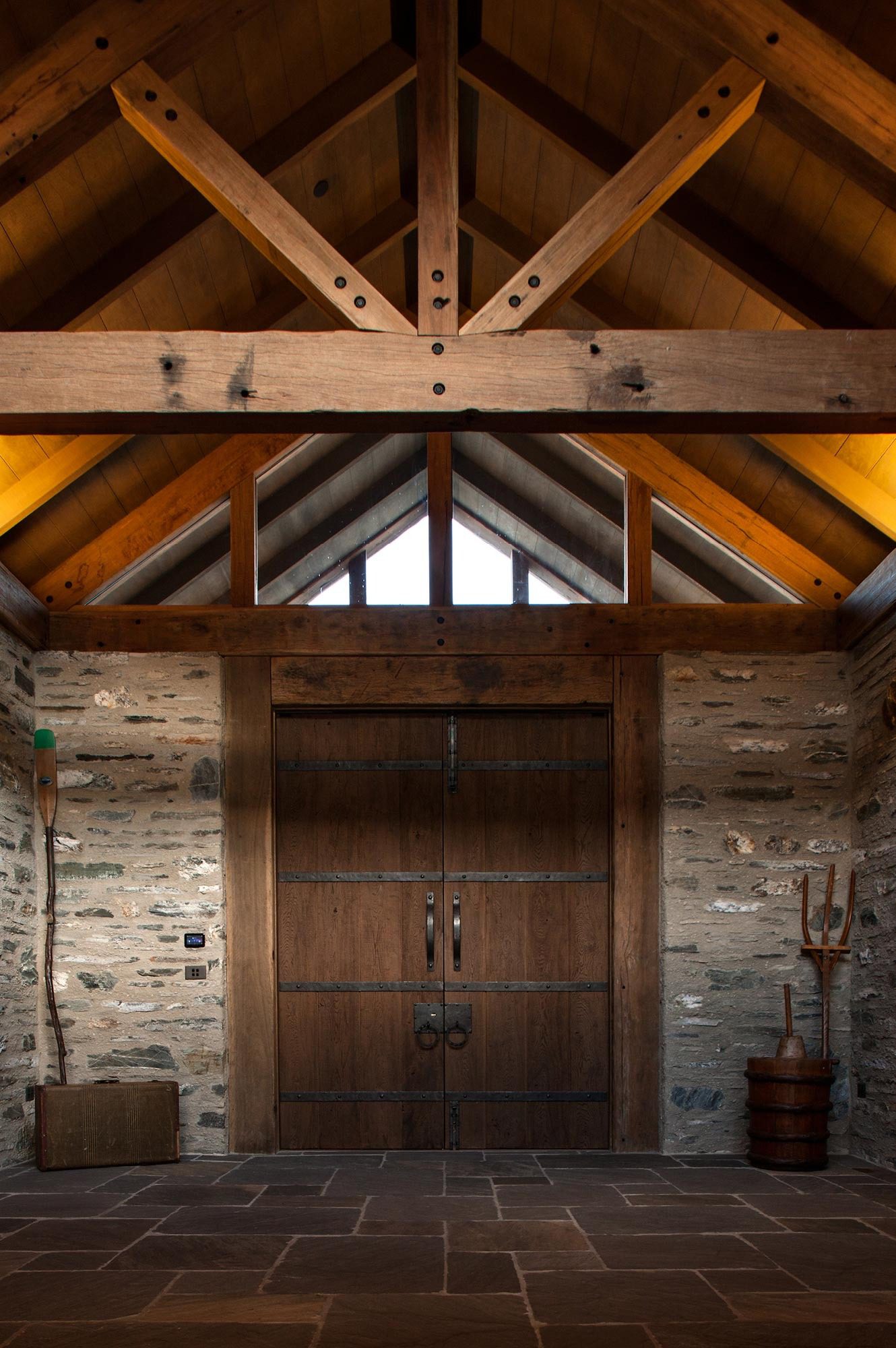 The house reflects traditional gable building forms, reminiscent of this South Island region. These forms are complemented by a series of large stone walls. The landscape runs up and over these walls forming green roofs. Bedrooms and related spaces are set behind the walls with deeply recessed openings.