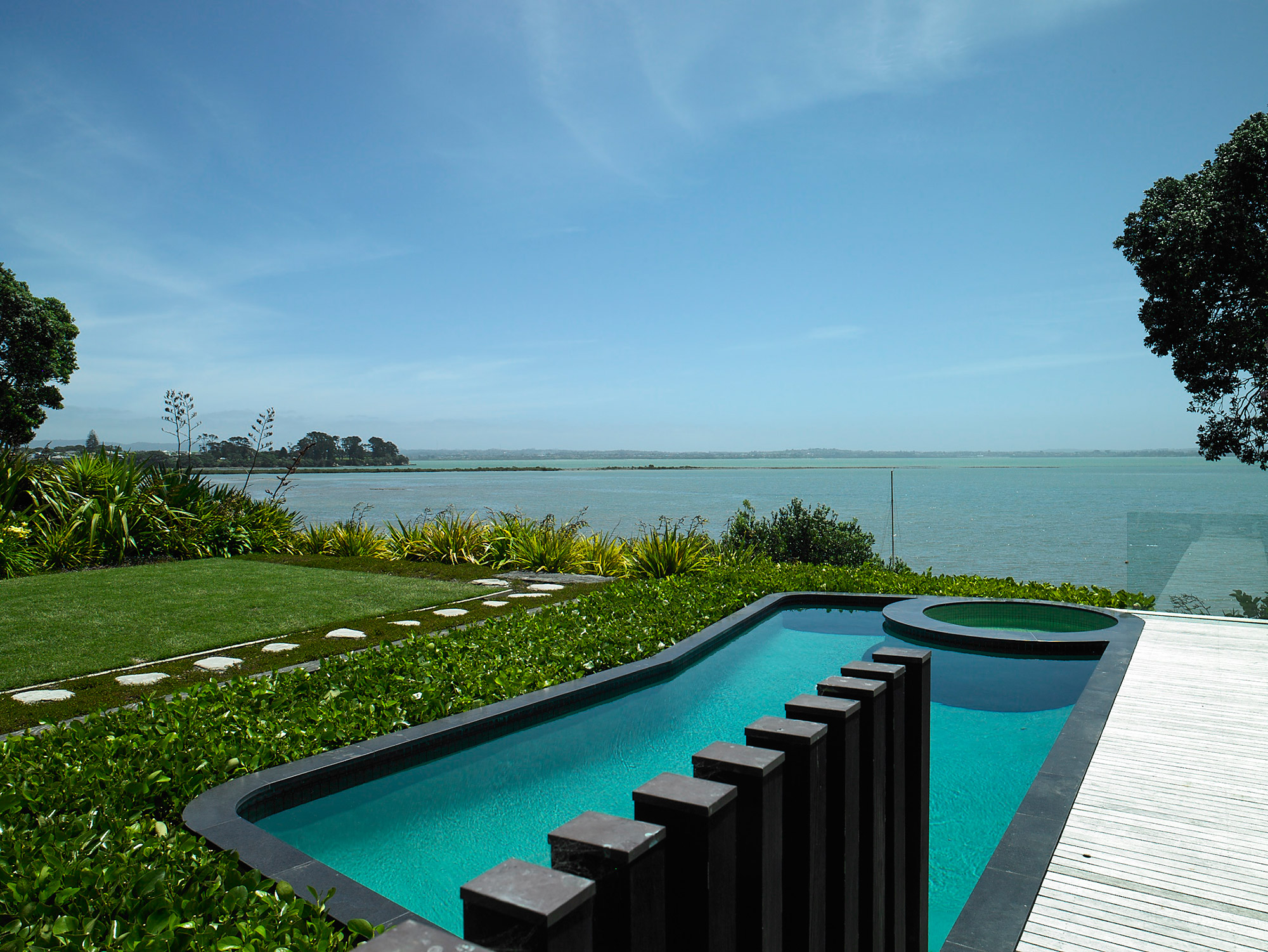 Stretching out along the narrow site and opening onto a series of intimate courtyards the house stops short of the sea to form a private waterside oasis, featuring a clifftop spa and swimming pool, sunken outdoor lounge, decks, and extensive lawns and garden.