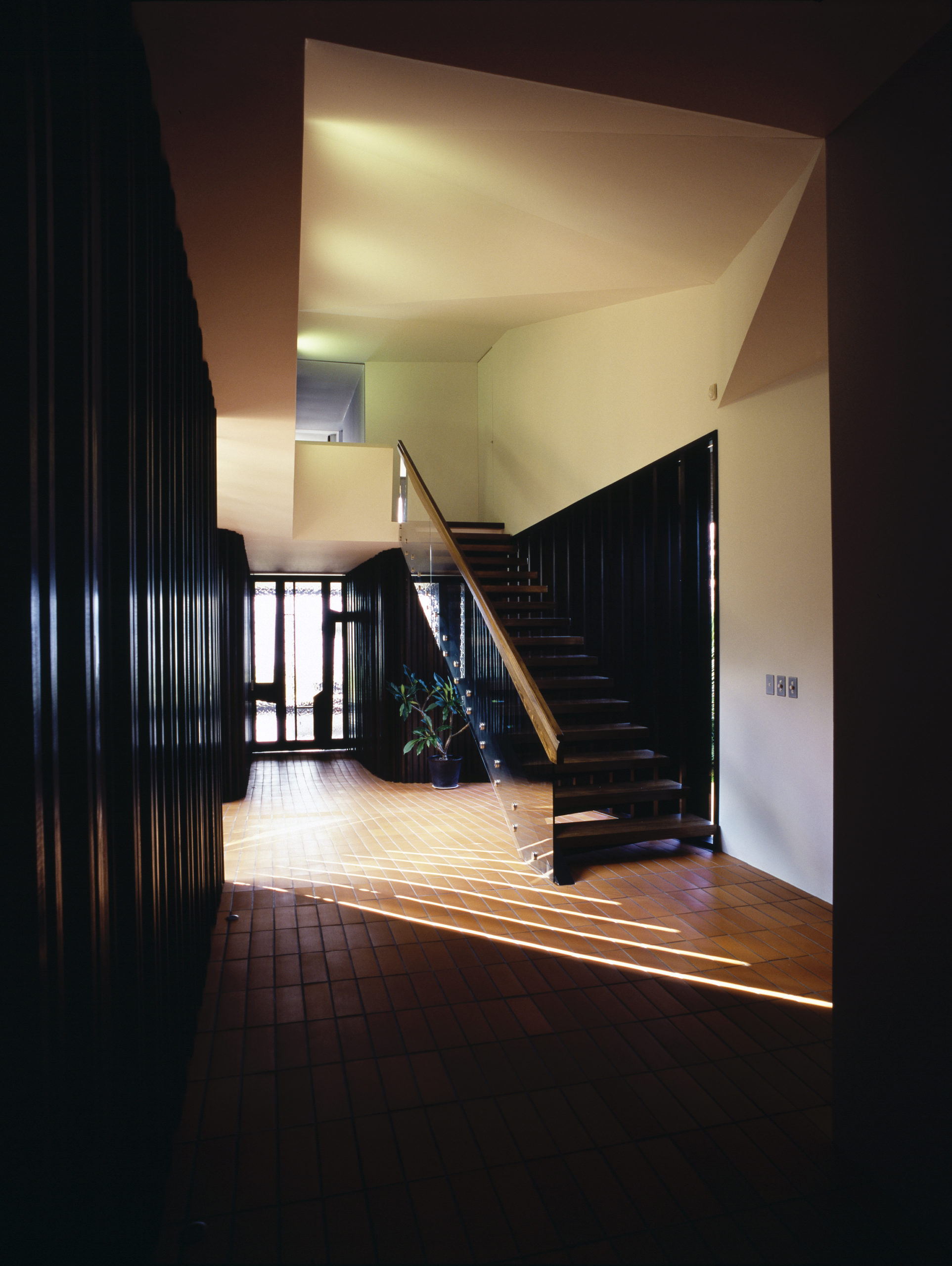 The sculptural main form twists and ramps up from the discrete street frontage over a cluster of organic ‘pod’ forms containing bedrooms, a lounge, and kitchen. The main living spaces and circulation areas are seemingly held between these pod forms giving a relaxed air and fluidity to the spaces. Dark timbers and terracotta combine with ramping floors, sunken seating areas, and hidden doors to offer a rich, playful interior. The home also features extensive built-in furniture, shelving units, and a sculptural cantilevered staircase.