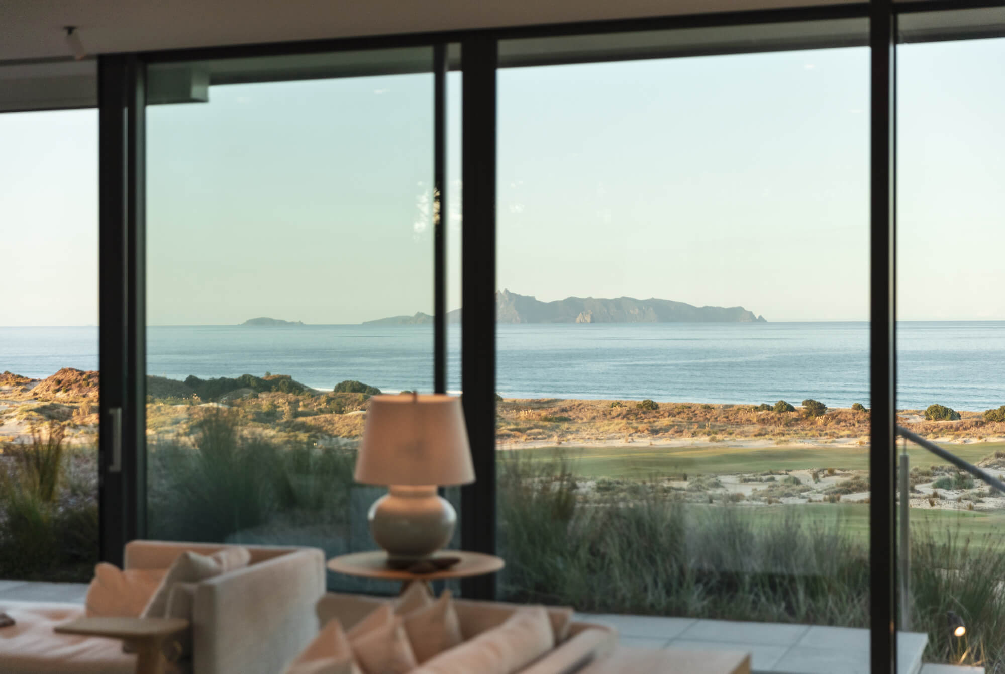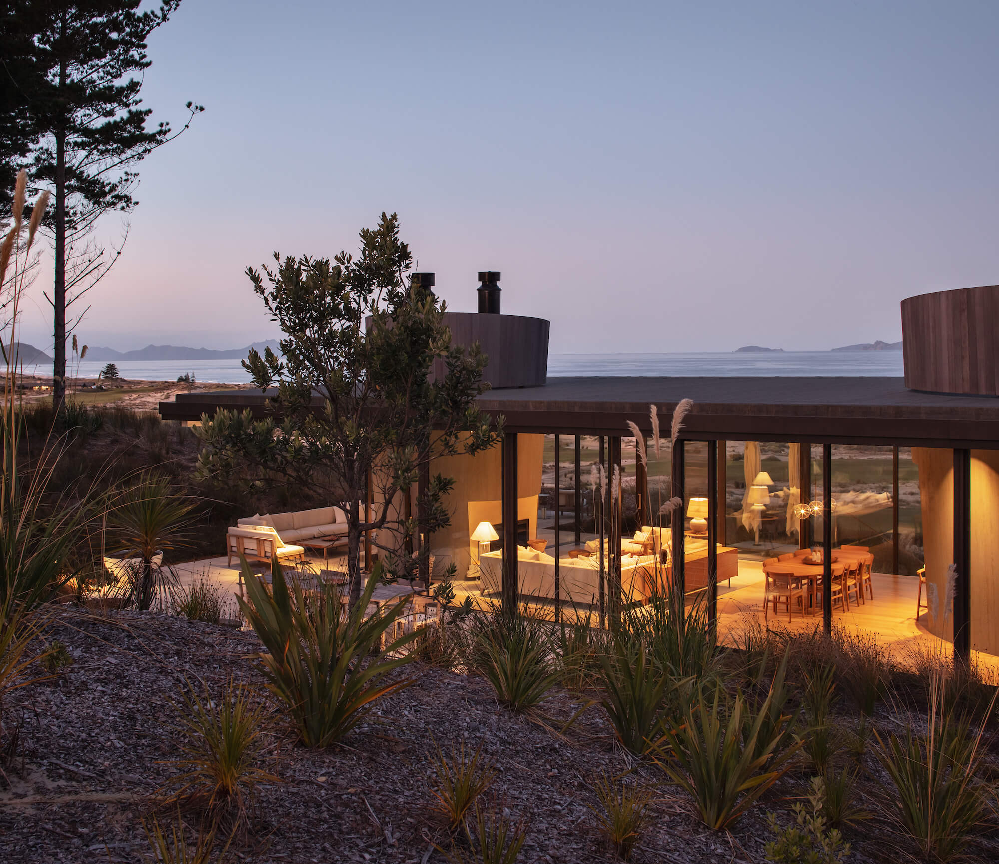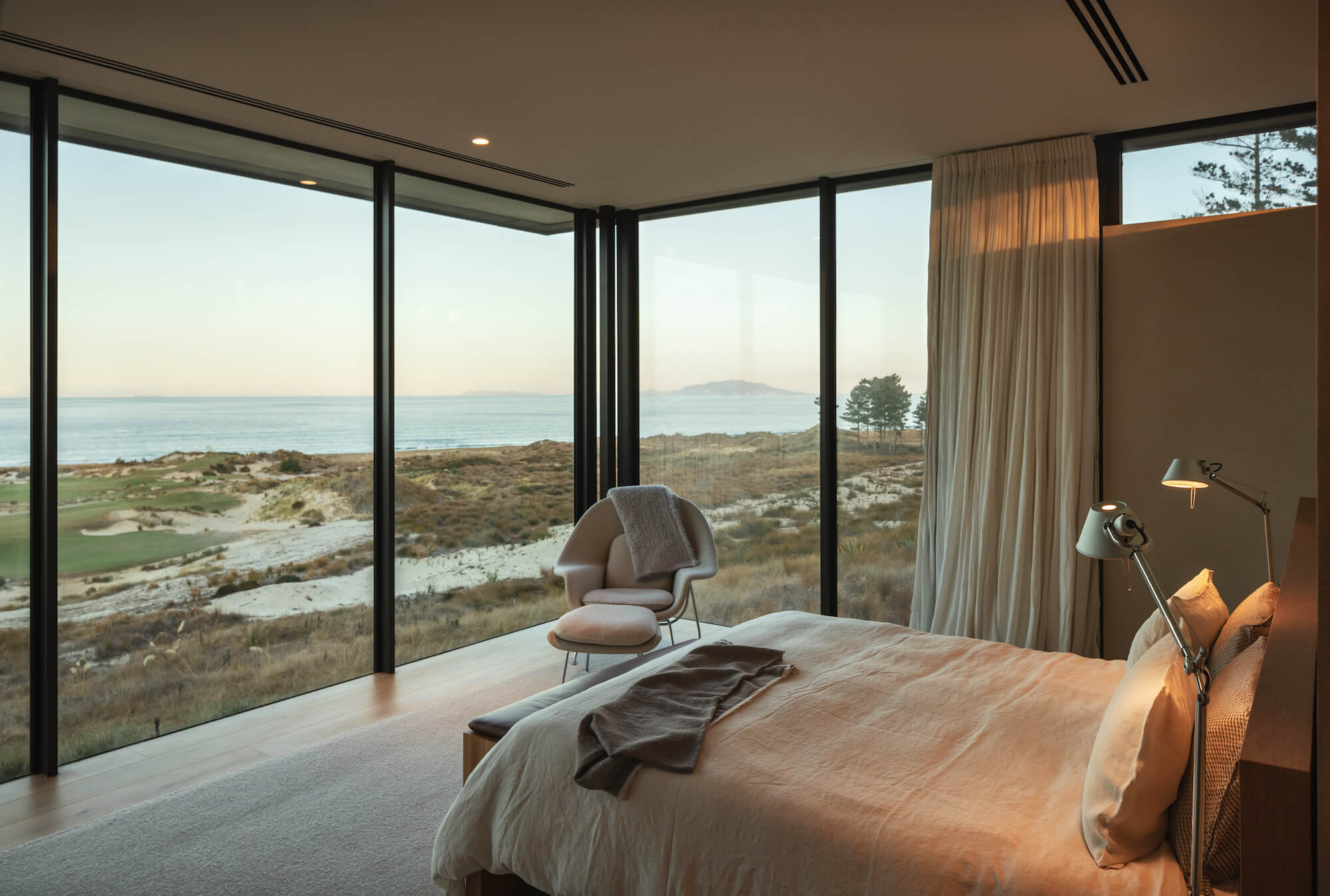 The house is a glazed pavilion sitting in the dunescape above a coastal golf links.