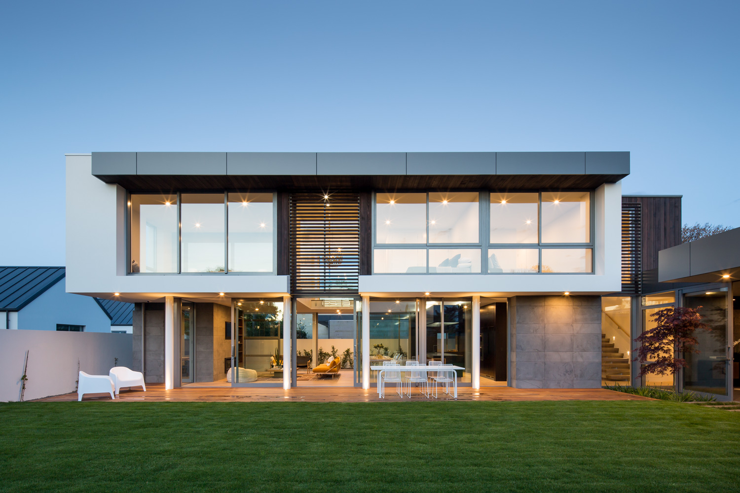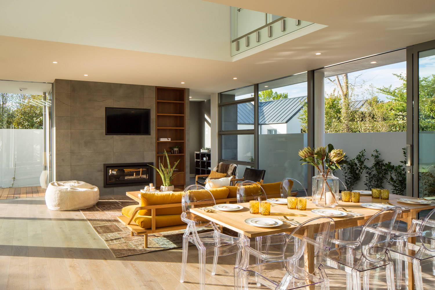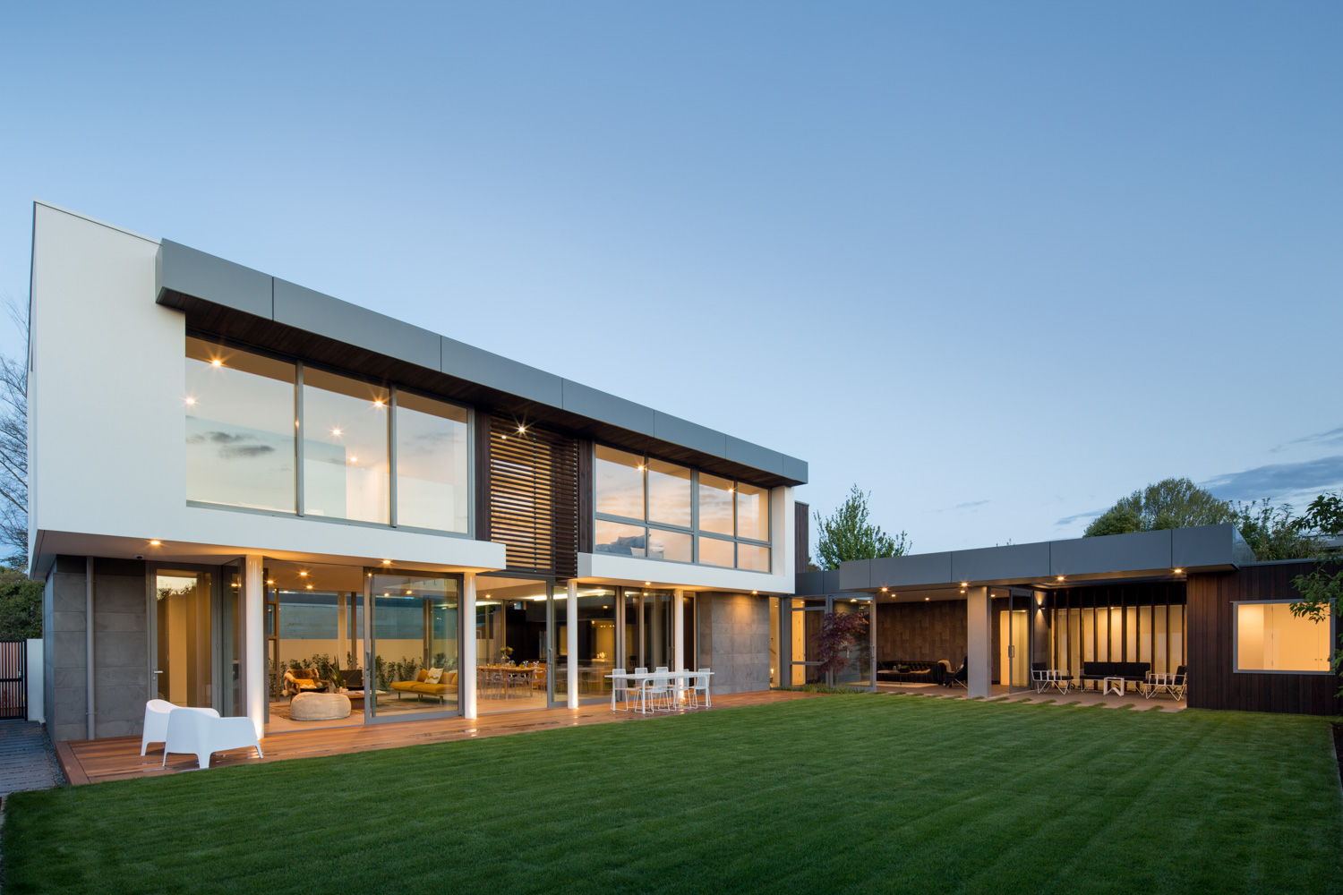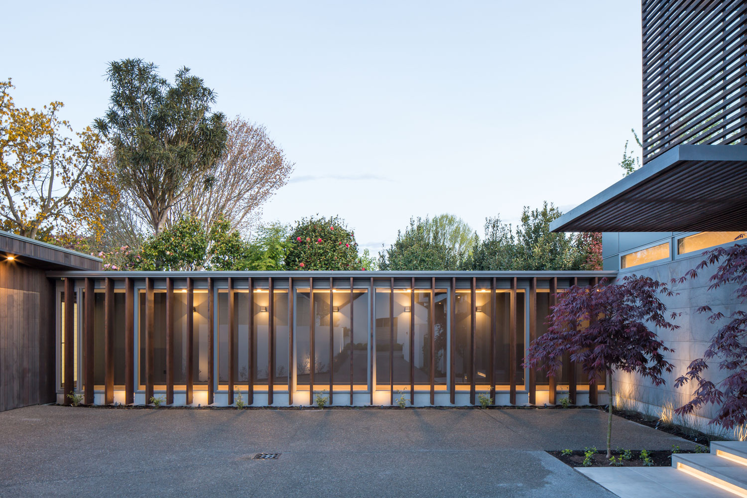 Following the site’s shape, the building unfurls in a series of enigmatic light-filled spaces within a logical building plan composed of courtyards and outdoor zones, each positioned to follow the sun’s path. The formal entrance is bordered by a concealed garage, connected to the house by a ‘zen’-like covered link. Opposite is the core of the home, featuring Timaru bluestone walls at the ground floor level, anchoring the house to the ground. Inside, firm materiality gives way to light and openness where entertaining is made easy with a well-appointed kitchen and seamless indoor-outdoor flow; typified by the interconnected living room and louvered outdoor room. Though warm and inviting, the living-dining area features full height glazing on two sides and a double-height atrium above to enhance the garden connection at both levels. The dramatic upper floor floats neatly above, containing bedrooms and attached bathrooms. Despite its striking proportions the building remains a truly liveable family home, with comfortable spaces, warm materials, and textured finishes throughout.