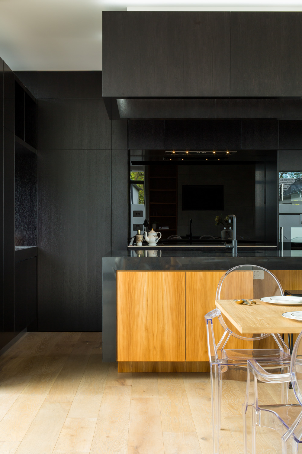 The dark colour of most of the cupboard fronts was chosen to create the feeling of intimacy in the kitchen area, while still being part of the large, open and airy living and dining space.