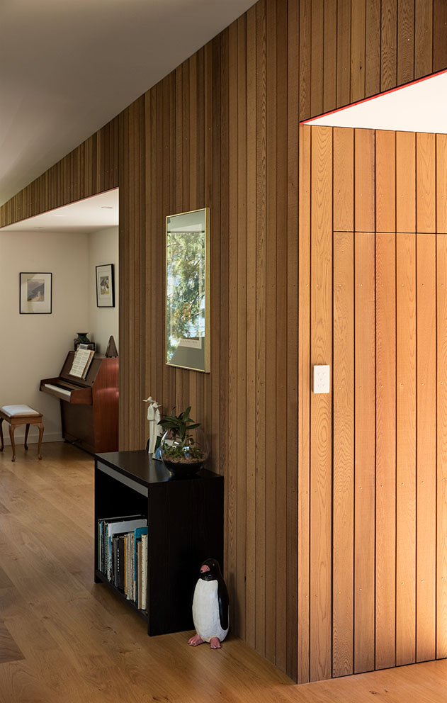 Two wings -private and public are offset to set up exterior courtyards forming morning & evening areas – with the southwest courtyard offering shelter from the lake wind while retaining a view through the house.