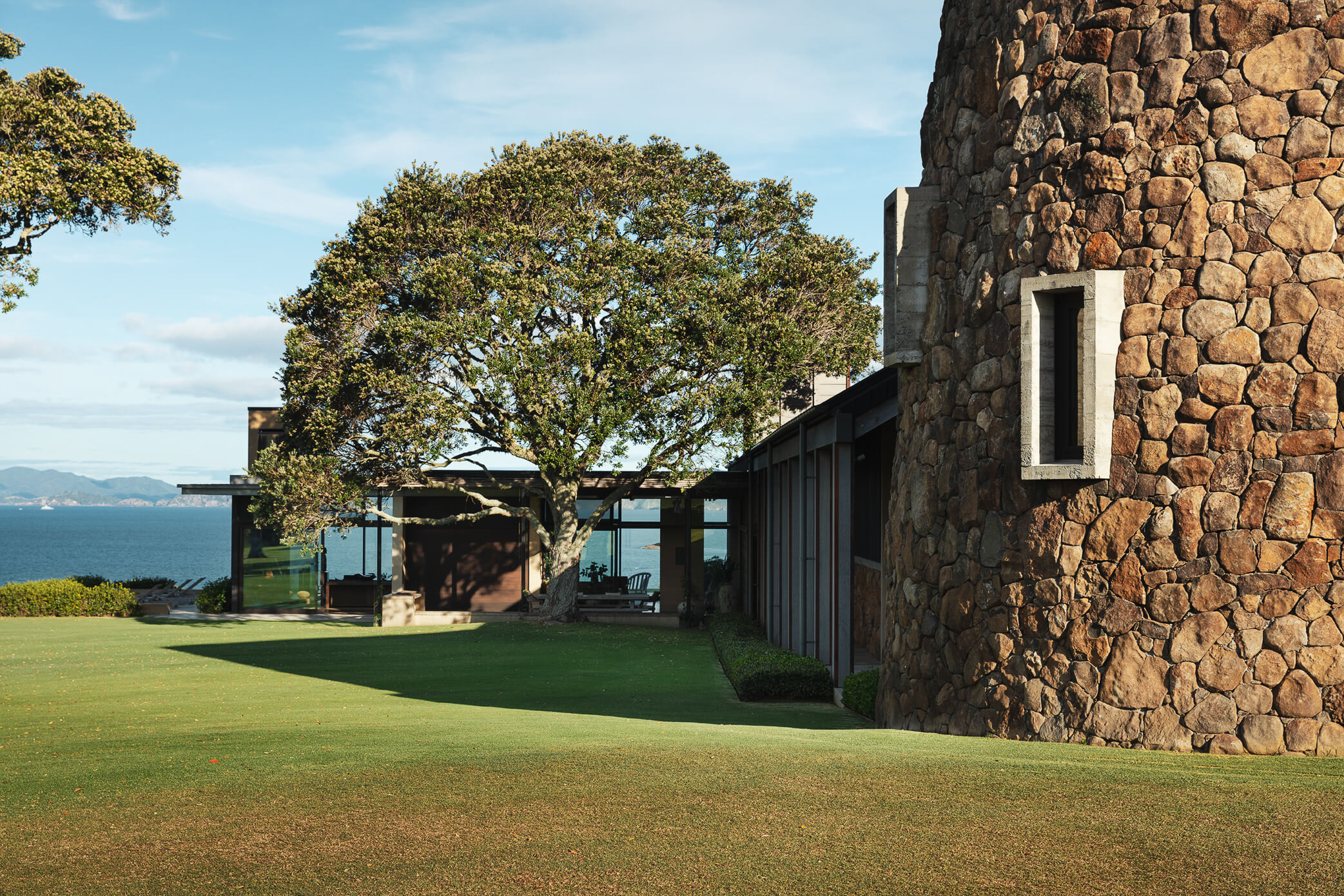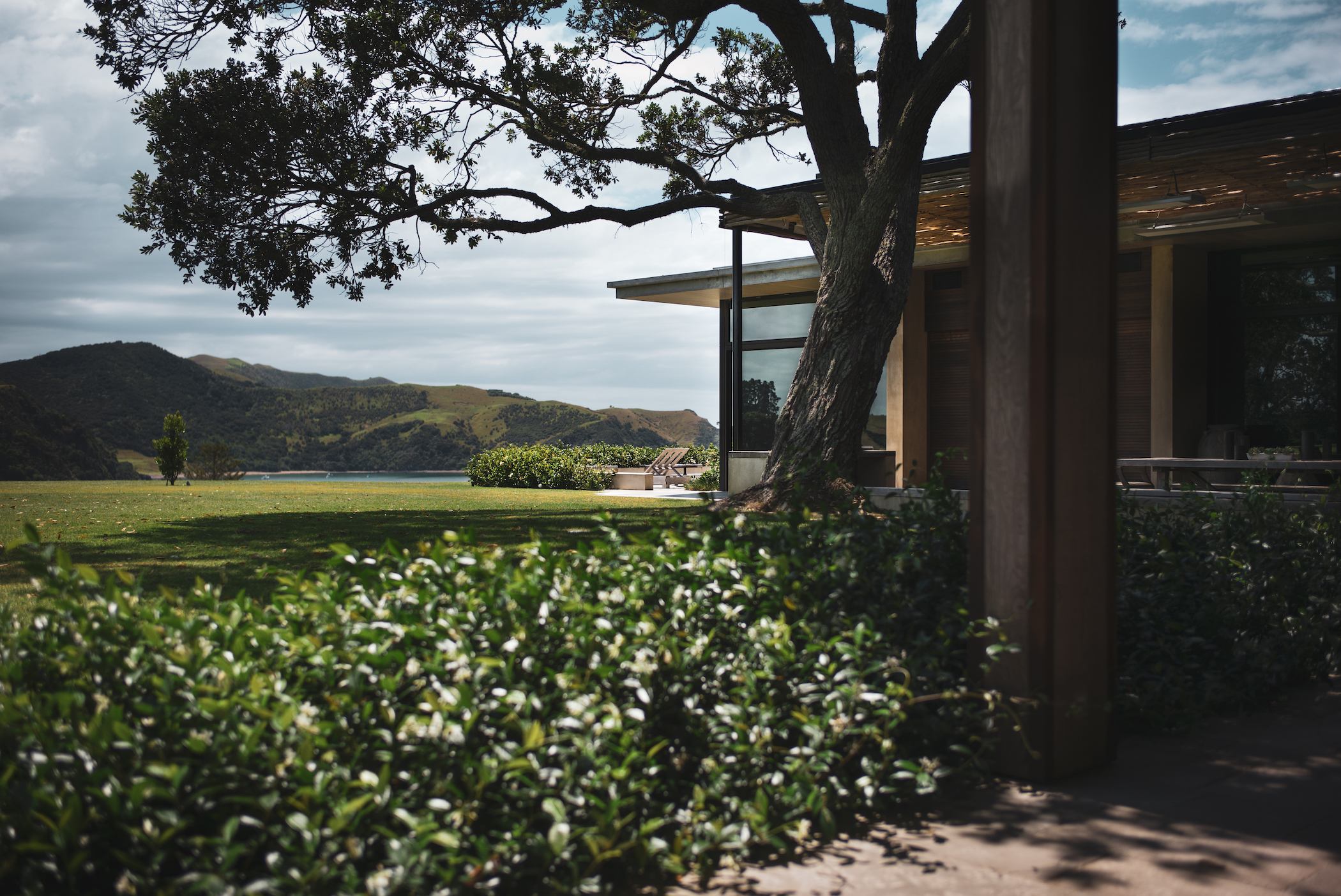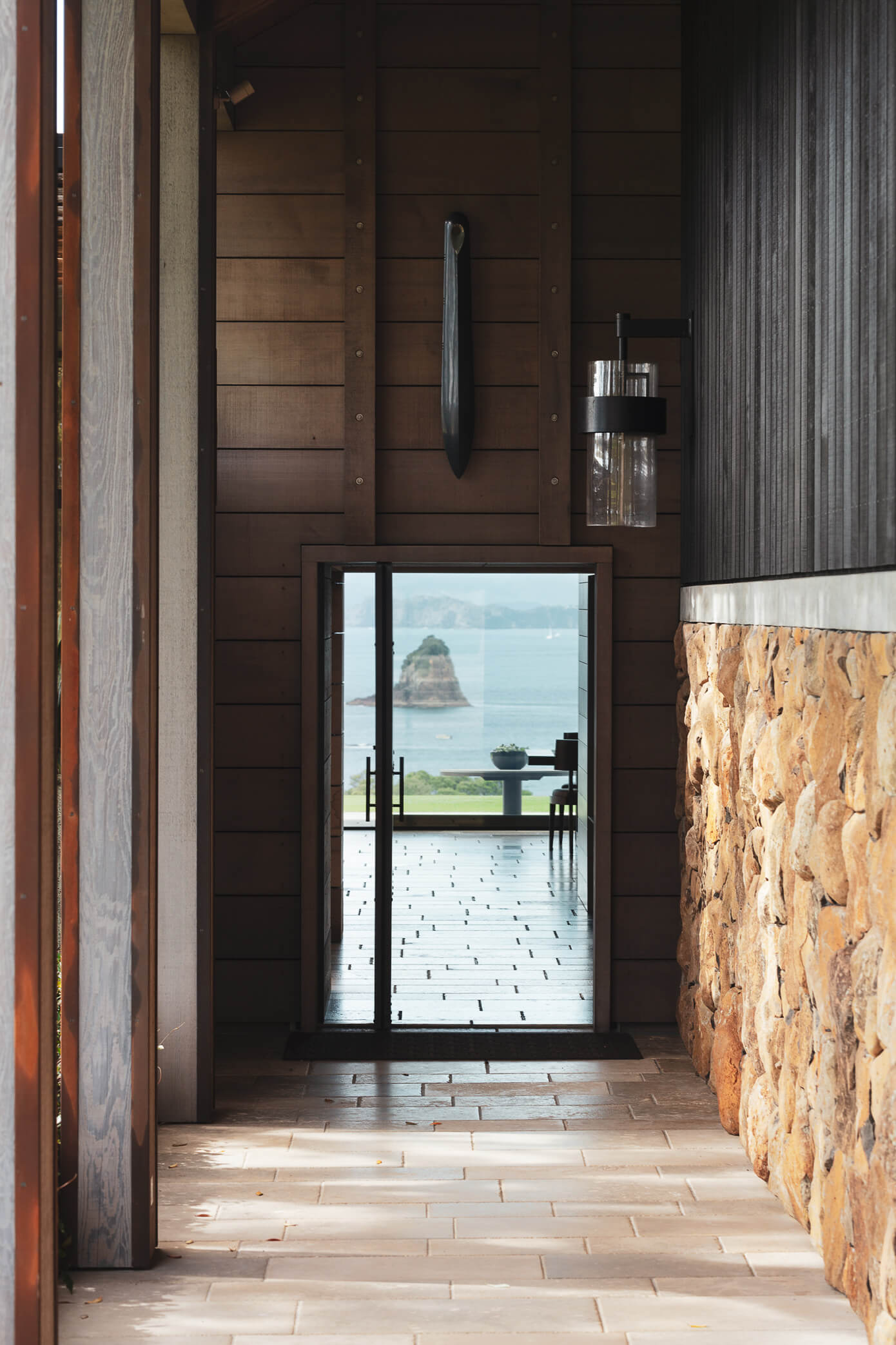 The project uses a number of materials found elsewhere at Mountain landing: in-situ concrete, weathered timber, raw steel and volcanic stones harvested from adjacent farmland.