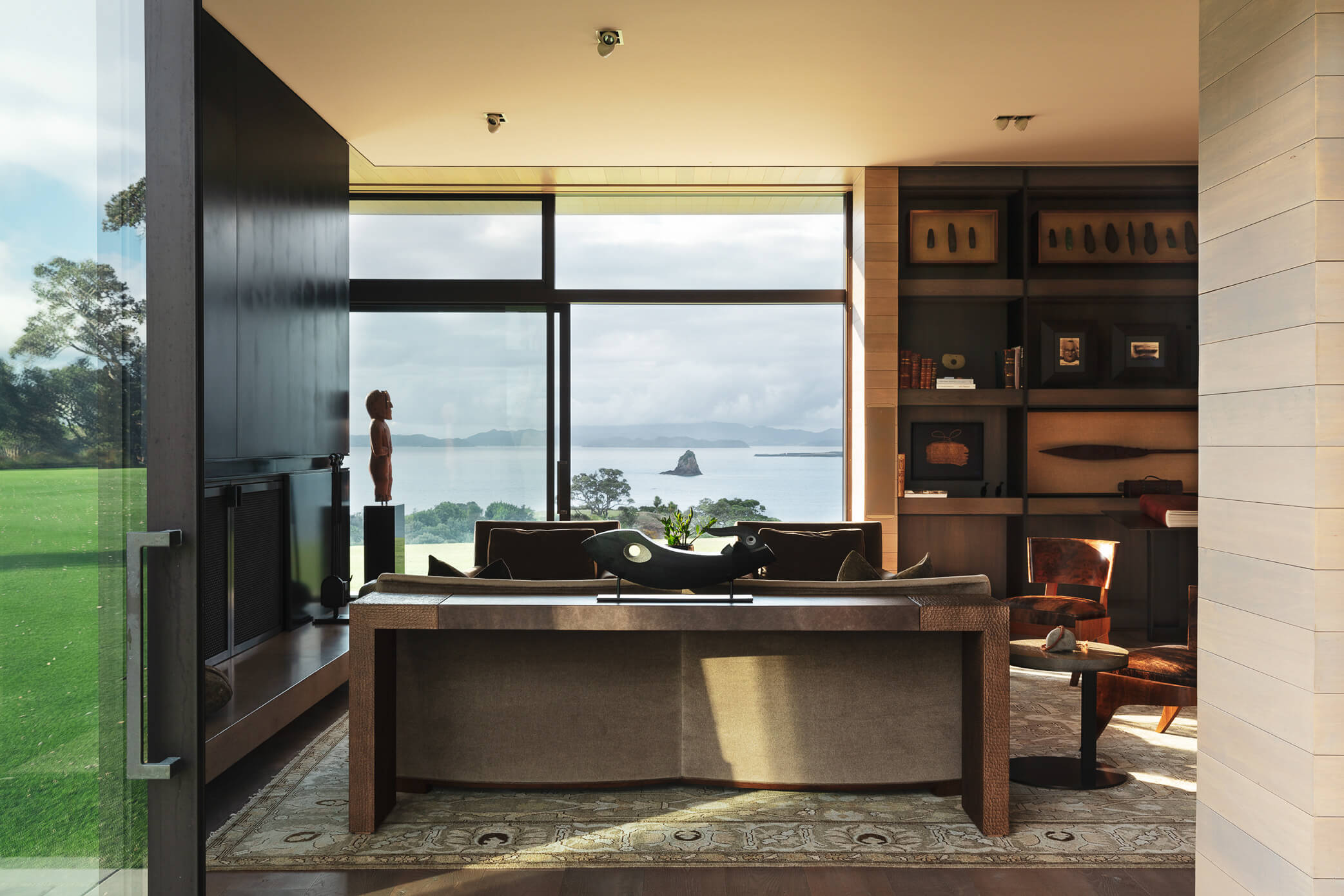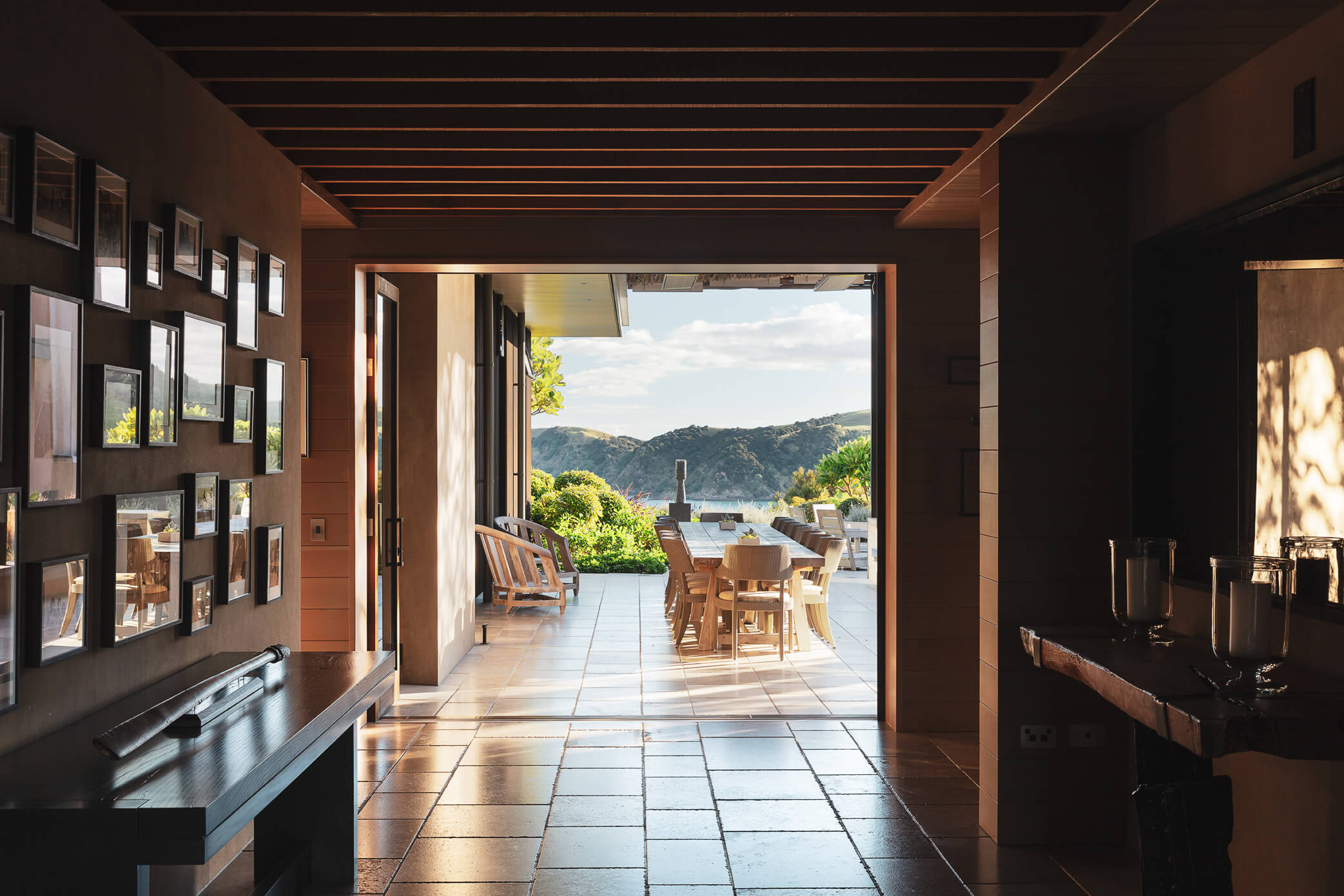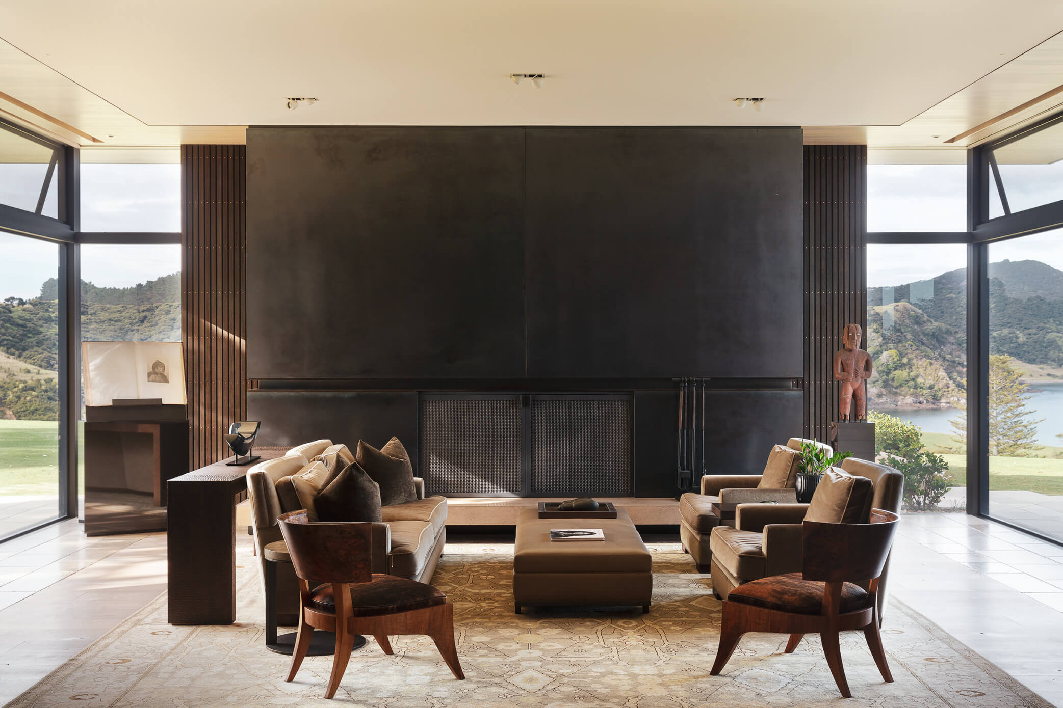 The project uses a number of materials found elsewhere at Mountain landing: in-situ concrete, weathered timber, raw steel and volcanic stones harvested from adjacent farmland.