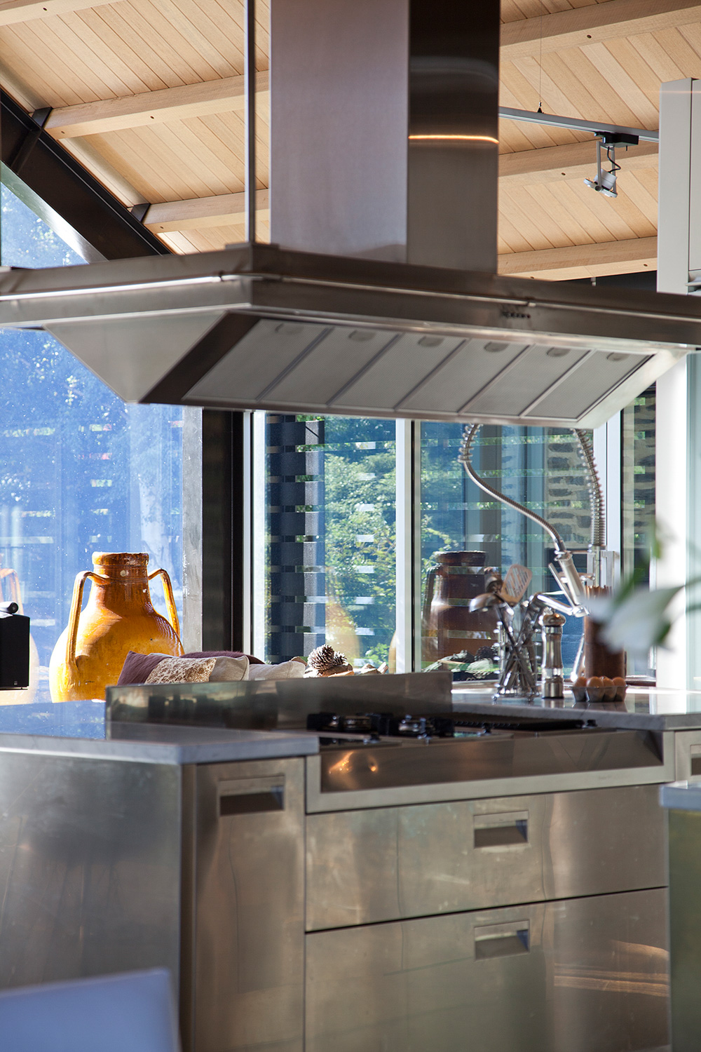 The new plan provides a series of private spaces inside and out, and a new living zone with formal entry portico that reinforces the rural/industrial nature of the scheme with an exposed steel structure and stained timber tongue-and-groove lining. Sculptural fireplace elements are of natural stone and steel.
