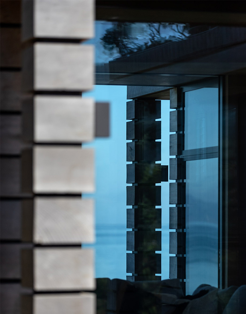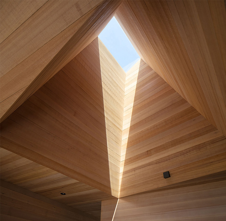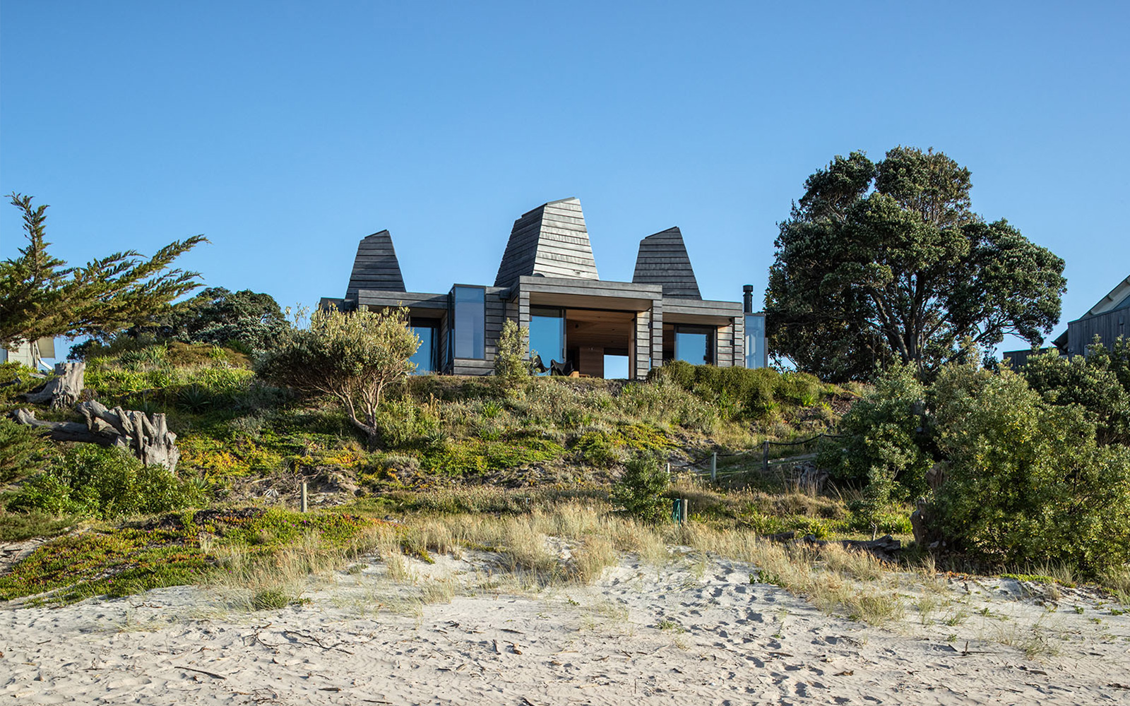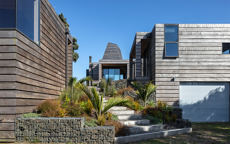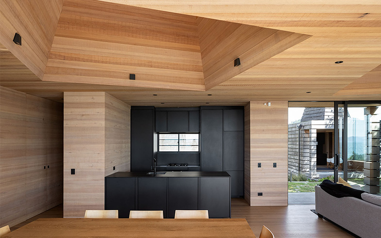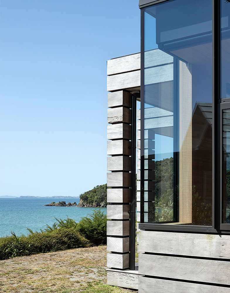 The cladding is reclaimed totara from a swamp, reused as a rainscreen. This timber, imbued with the colours of the coast, is a contrast to the rich and highly crafted light timber interior.