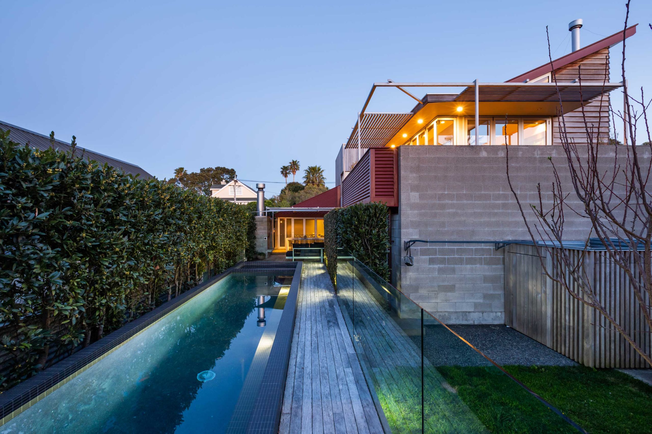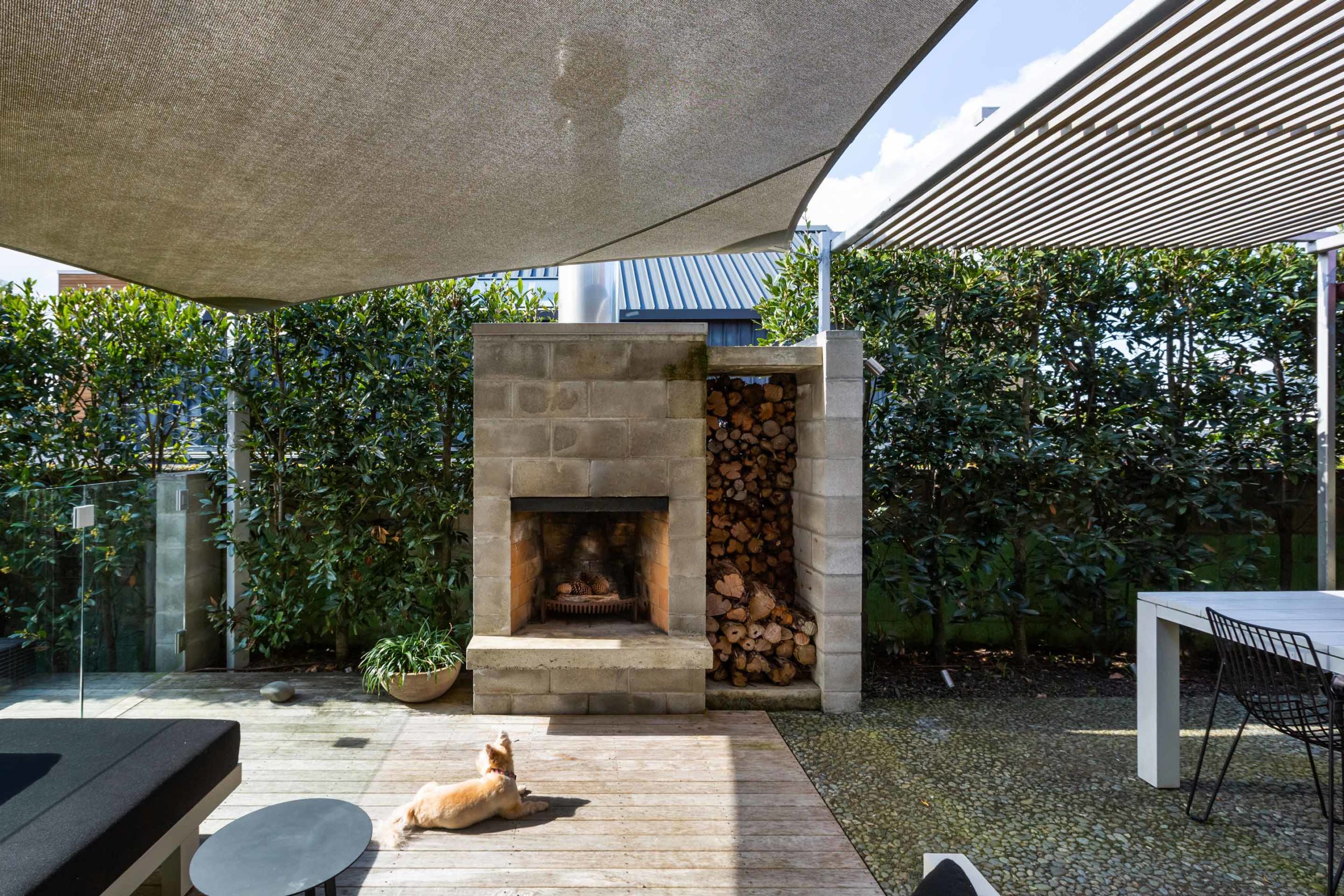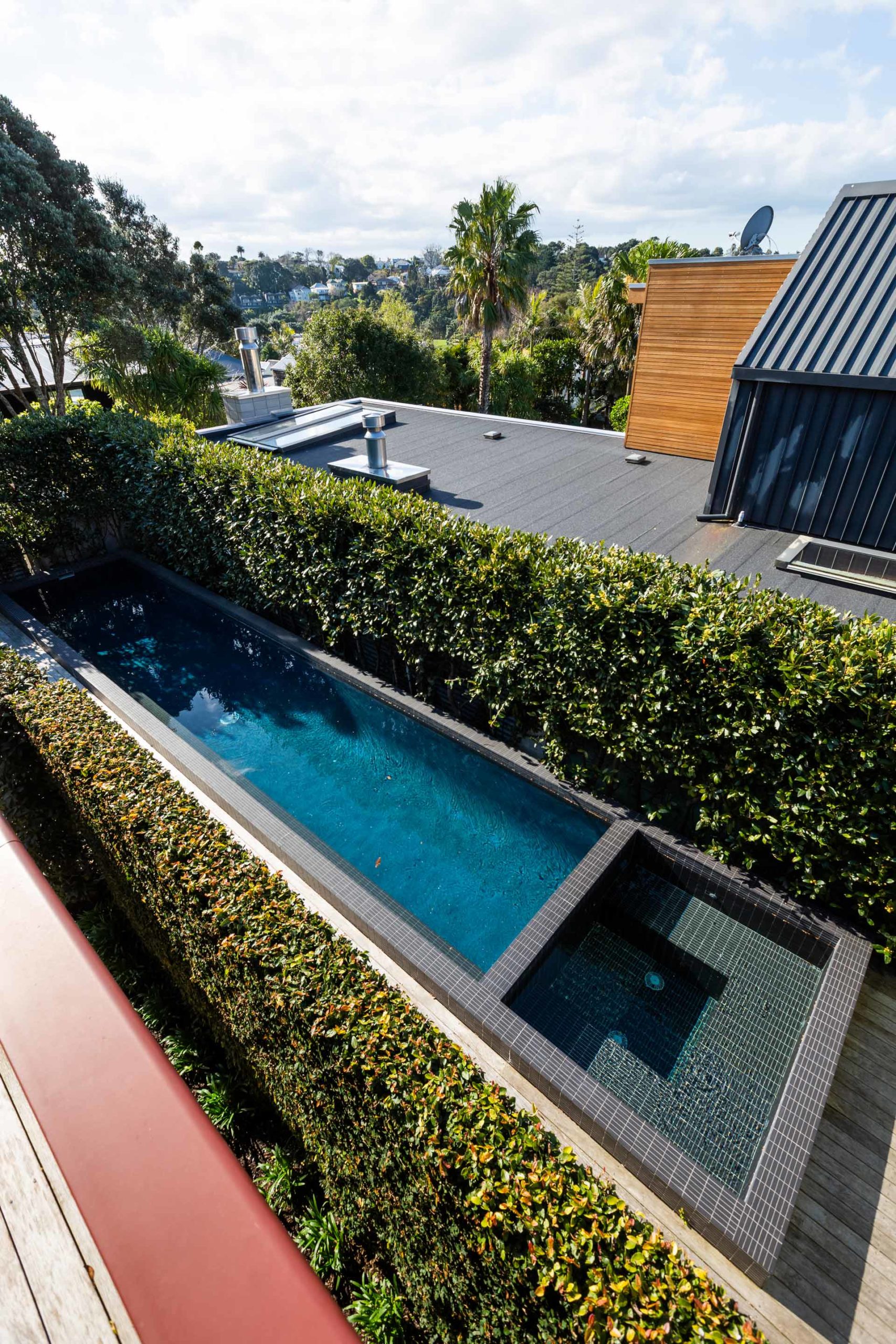 The concrete swimming pool and spa pool form a long element in the garden, contrasted by softer hedging & timber decks, along with a concrete block outdoor fireplace, battened pergola & shade sail.