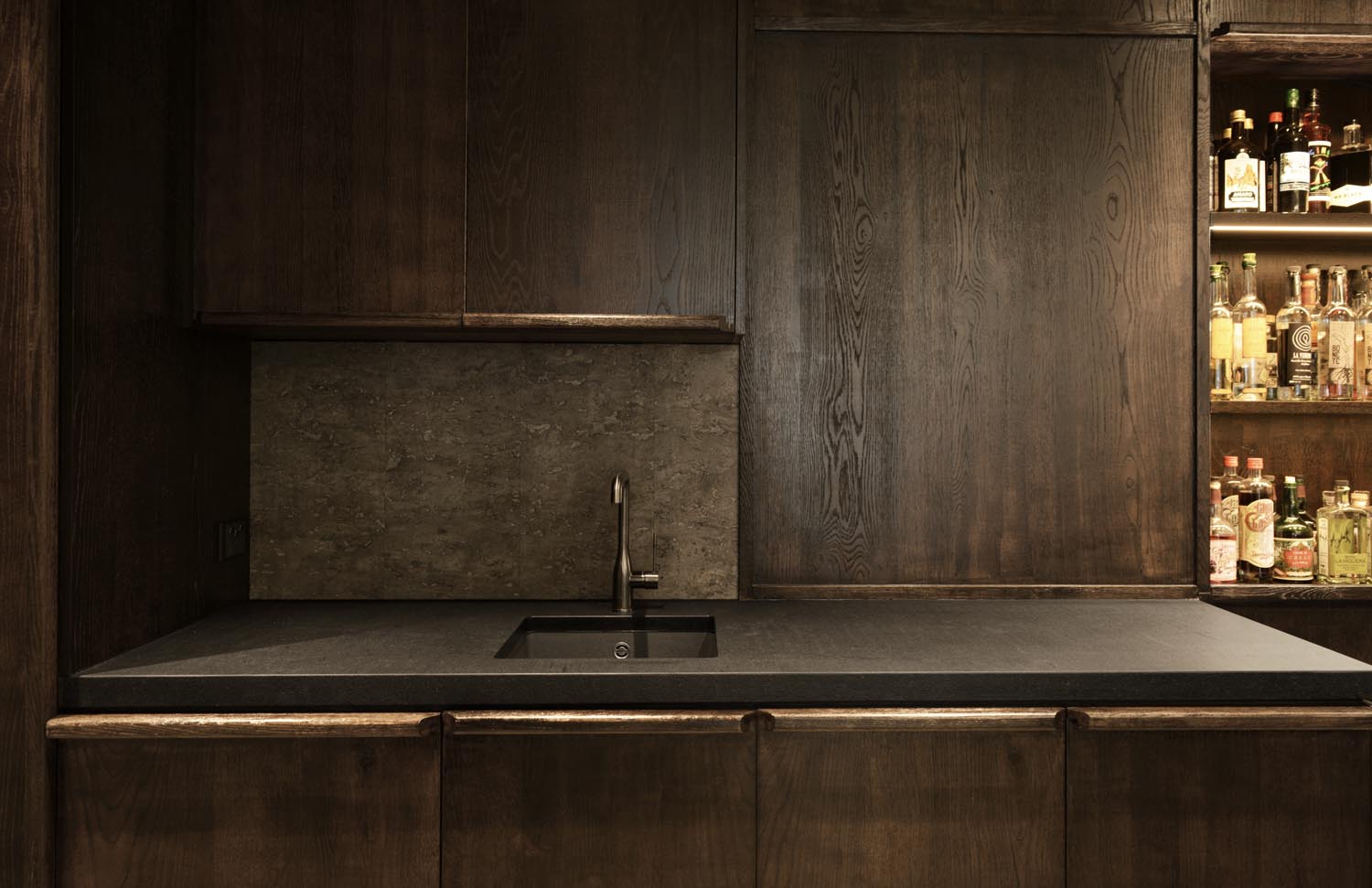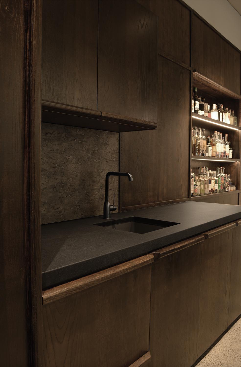 A darkened zone at the rear draws one into its intimate space and allows for a comfortable bar-like atmosphere used for client tastings. All appliances are integrated within this kitchenette. Dark-stained rough-sawn oak, leathered black granite and cork splash back are a dense layering of highly textured and monochromatic finishes. This darkness ensures the lit bottles remain the focal point. Additional storage is concealed within the wall paneling.