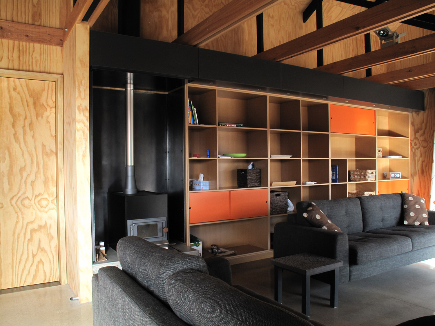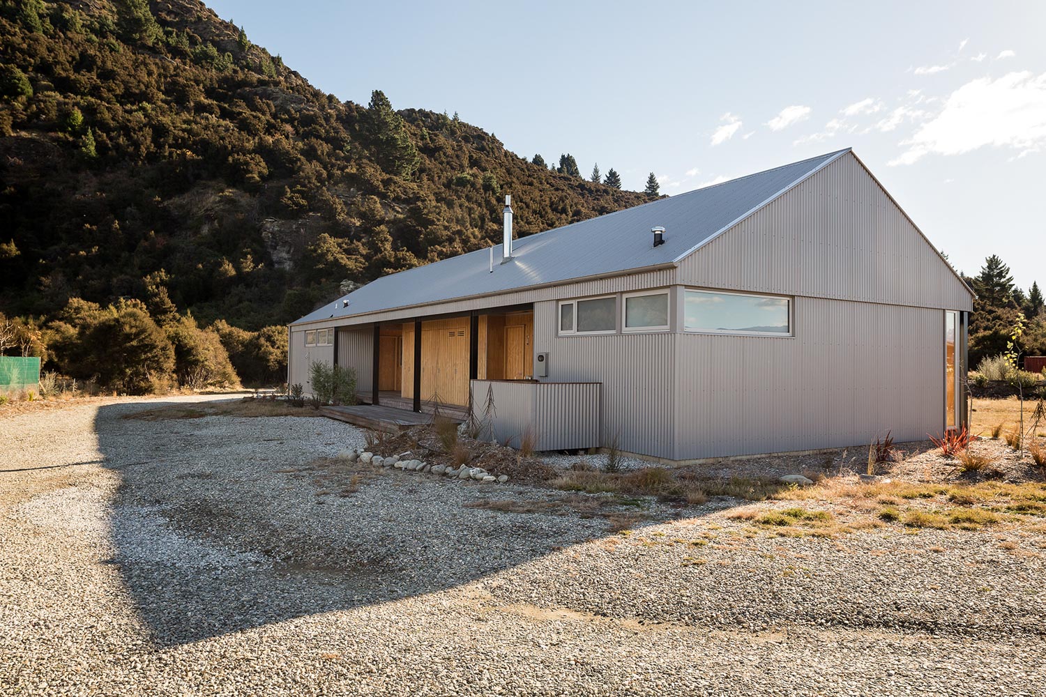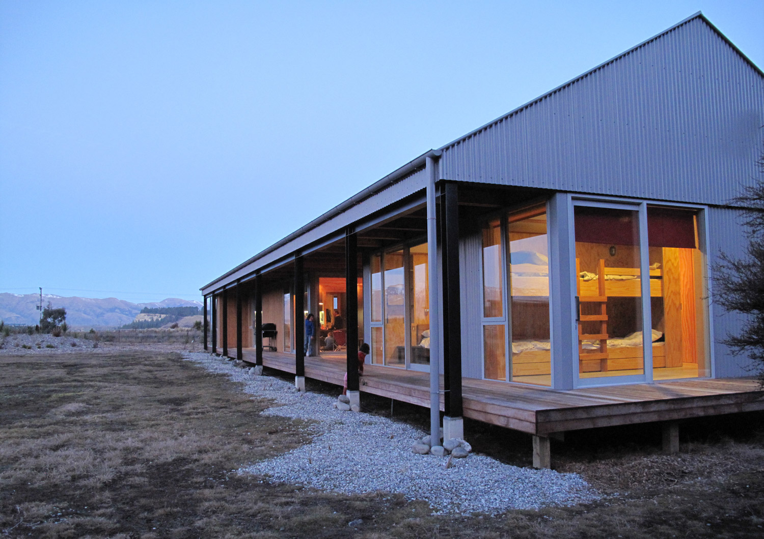 The client, a relative of the architect, responded to this natural beauty, which includes views over neighbouring houses to the stunning mountain vistas beyond, and selected the site as the location of a family crib to be used for both winter and summer recreation. The site provided an opportunity reminiscent of camping, an expanse of grass and bare land on which to pitch the “tent” and shrubland that offers the potential of individual secluded camping spots located within the kanuka. A base camp for the family.