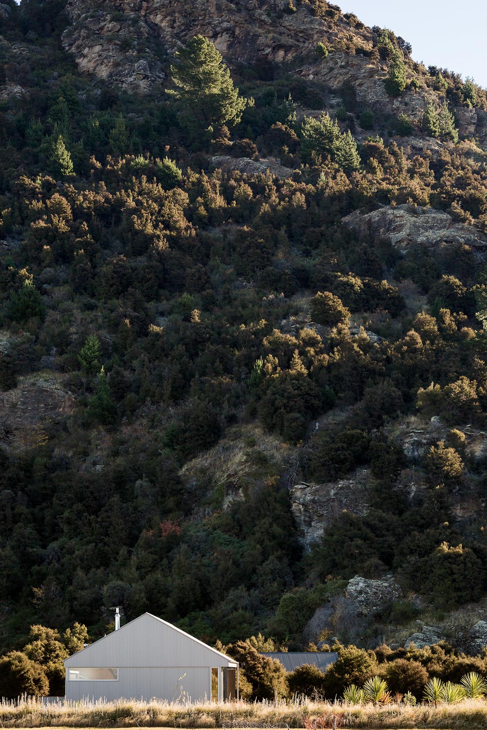 Located under the partial shadow of the bare schist outcrops of Mount Iron, the site, though within a medium-density subdivision, retains natural elements of this foothill grassland with kanuka scrub and the long dry grasses distinctive of the region.