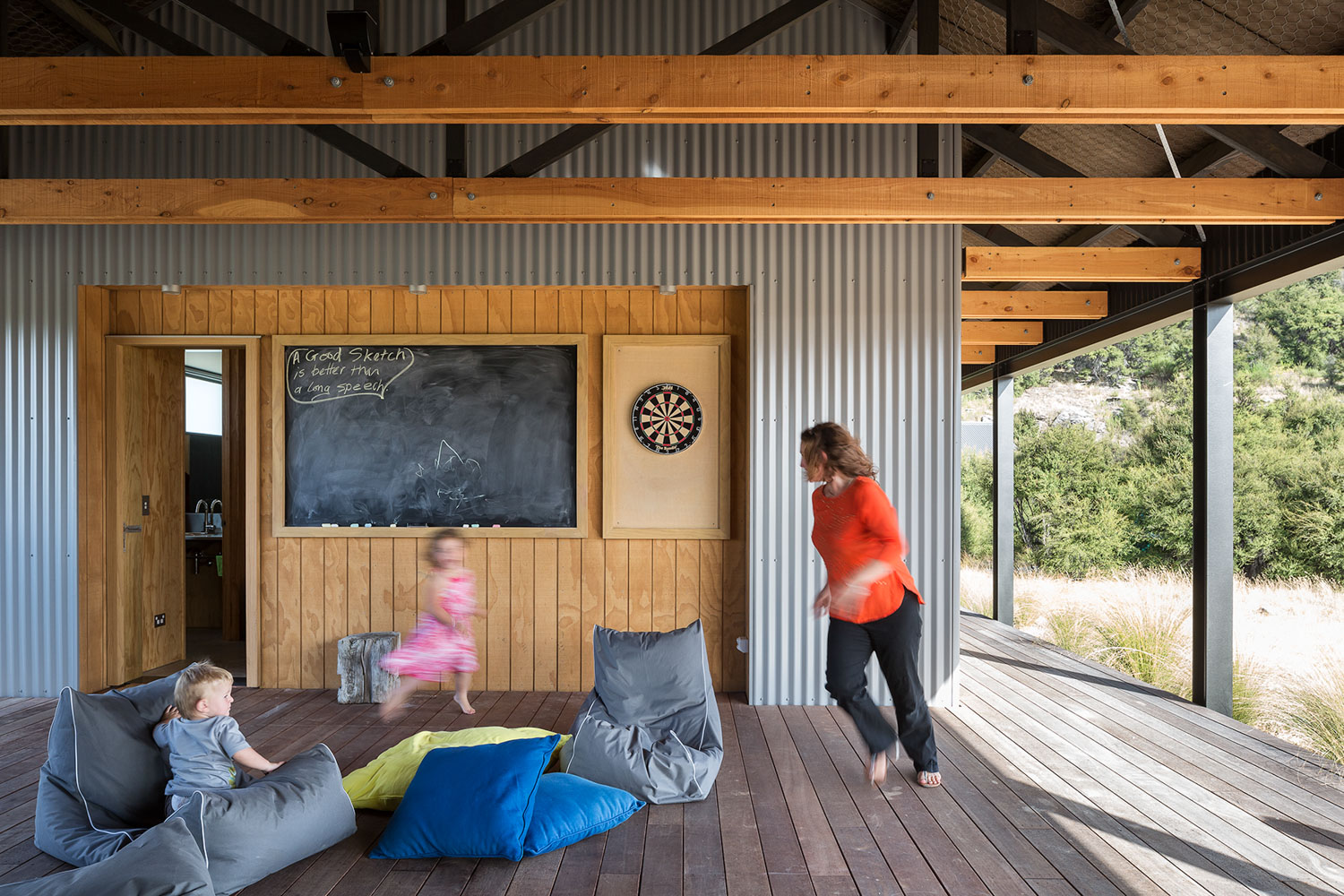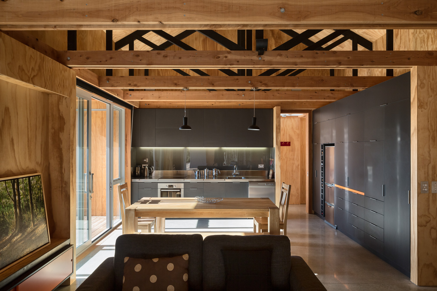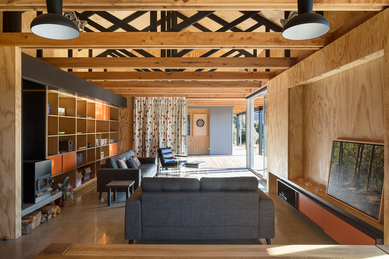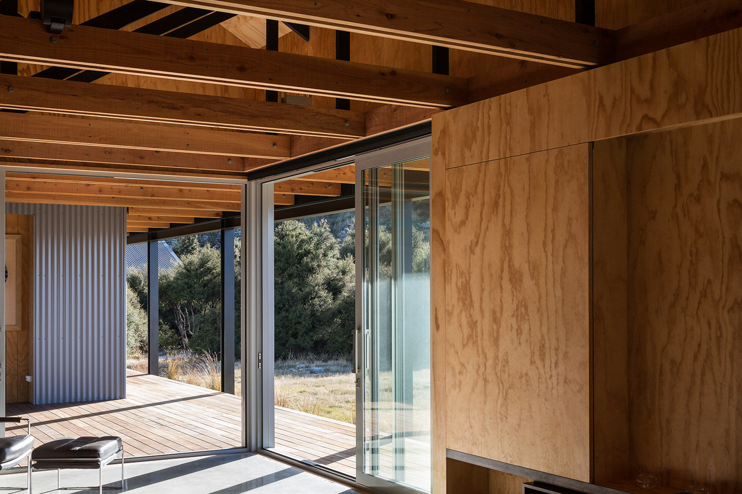 The architecture, in planning, form and materials, is reminiscent of the shearing shed; a structure both connected to and familiar in its natural surroundings. Consisting of two separate tin and plywood buildings, housing owner and guest ‘pods’ connected by an oversailing gable-form tin roof and an apparently floating ground plane of timber decking. This decking cleverly links the two elements and creates extensive outdoor verandahs for both owner and guest elements, as well as a covered inner courtyard shared by all. The simple, proprietary truss roof structure is left exposed to the outdoor decking areas and within the skillion-ceilinged Living area, creating a sculptural spatiality totally recognisable as the shed.