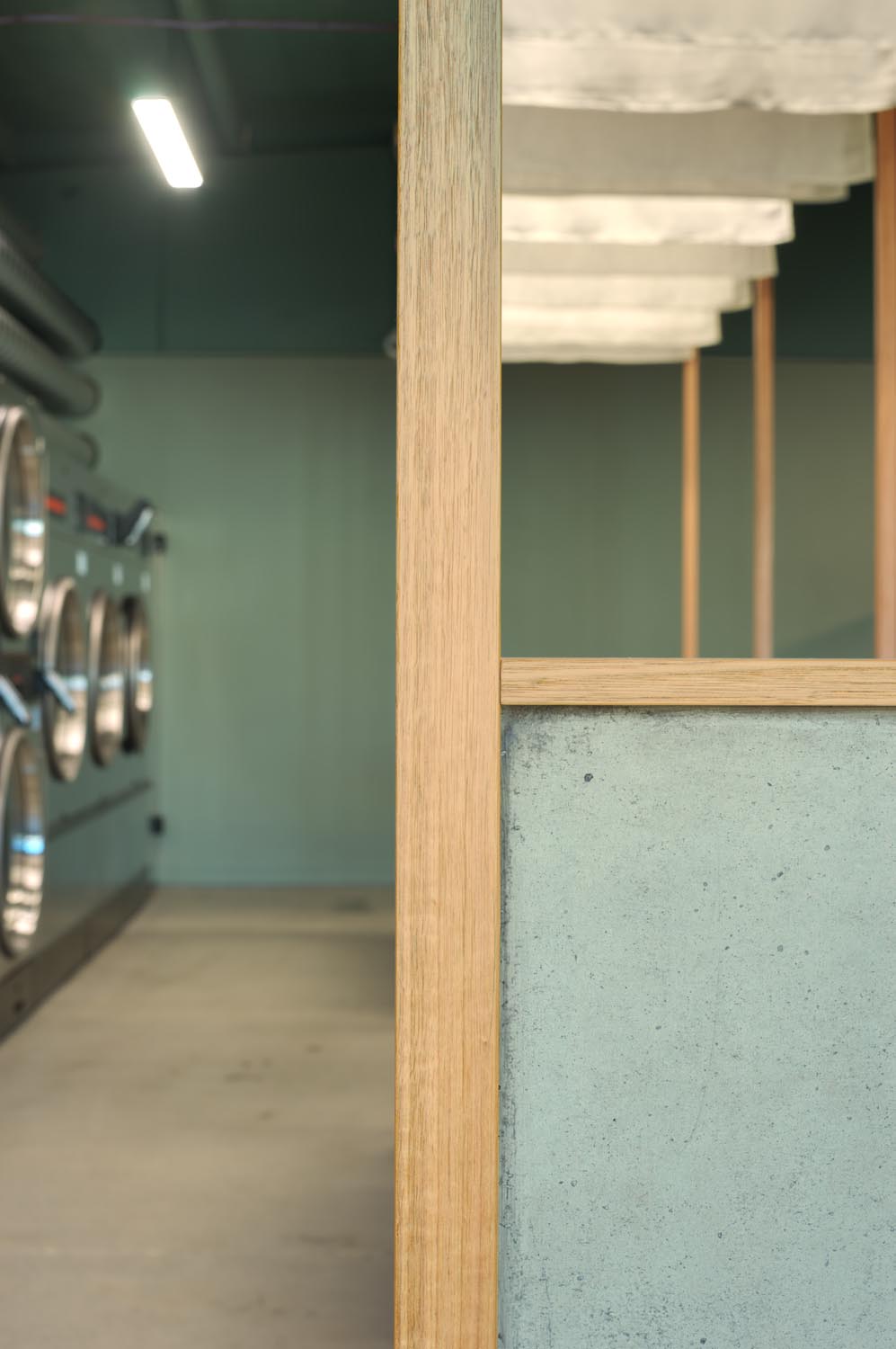 A center structure provides focus, functioning as a reception with hidden lockable storage and integrated folding tables for sorting serviced orders. Concrete faced ply- wood is used here and in the bench seating to keep the overall material pallet cohesive & simple, while breaking up the wood texture and avoiding a too solid & dominat- ing feel.