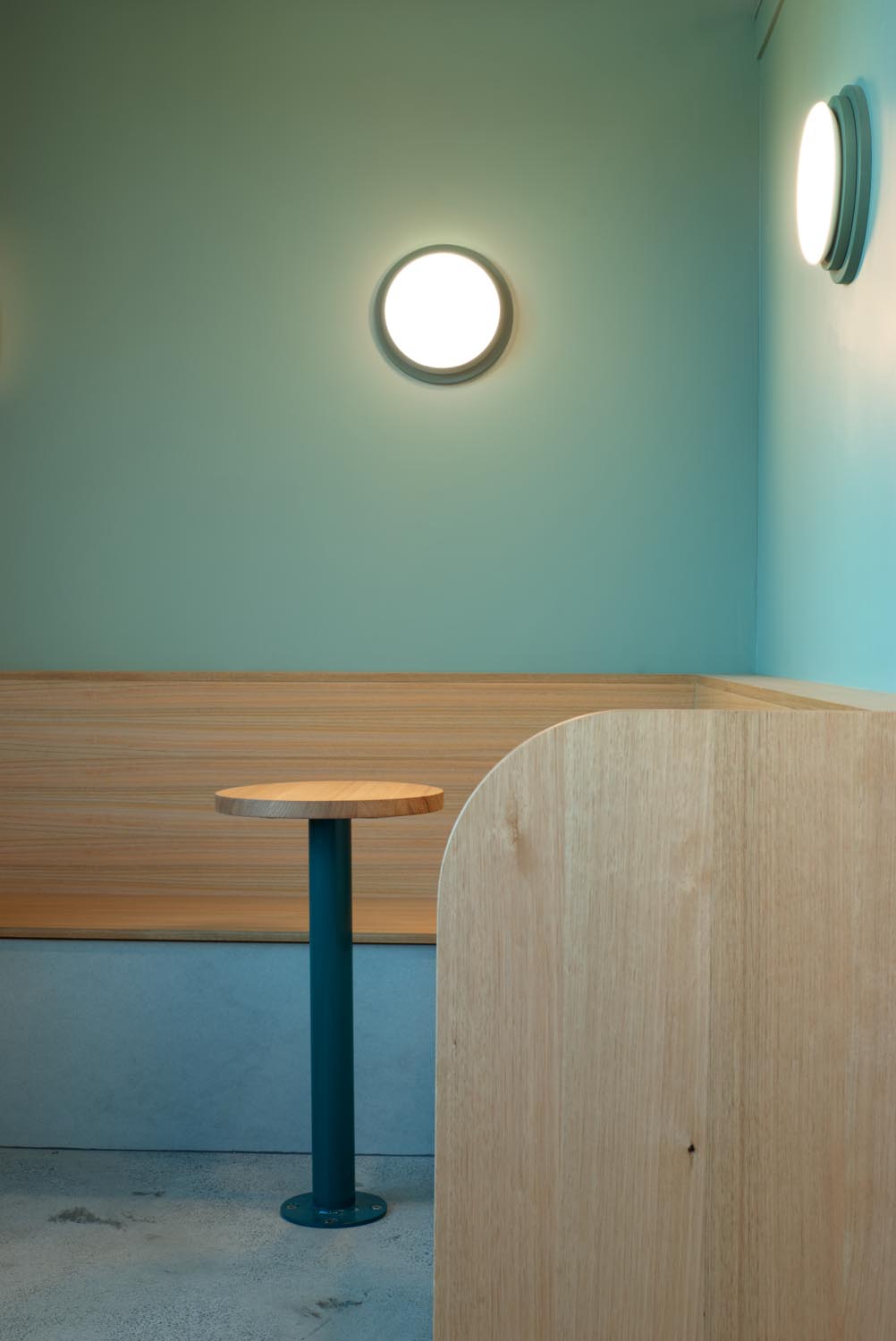 To complement the softer form language as well as practicality and comfort, I used round side tables, curved bench seat ends and custom round wall lights. Additional fittings were powder coated green to complete the pallet of the walls.