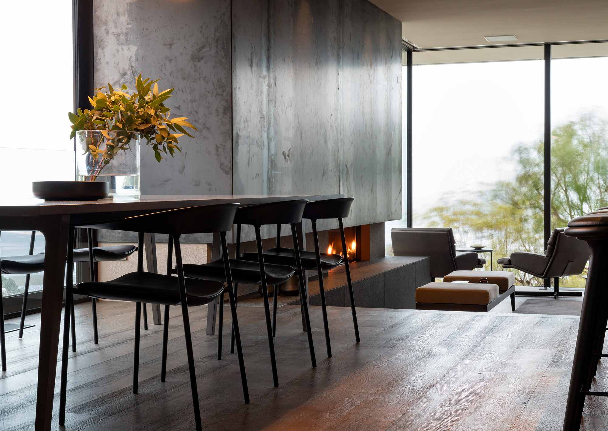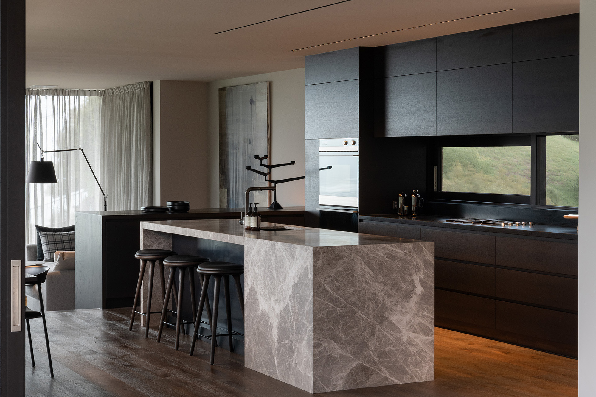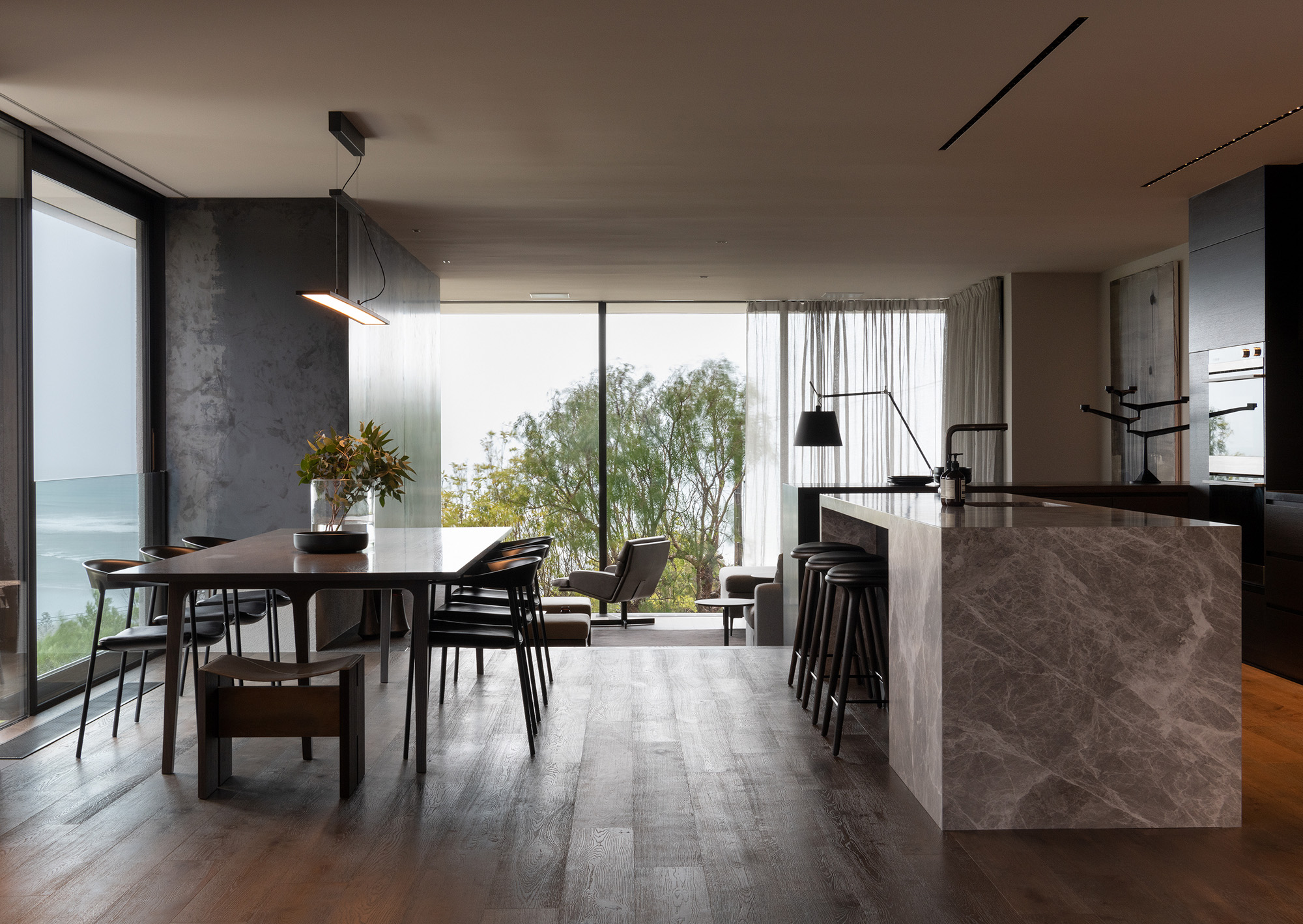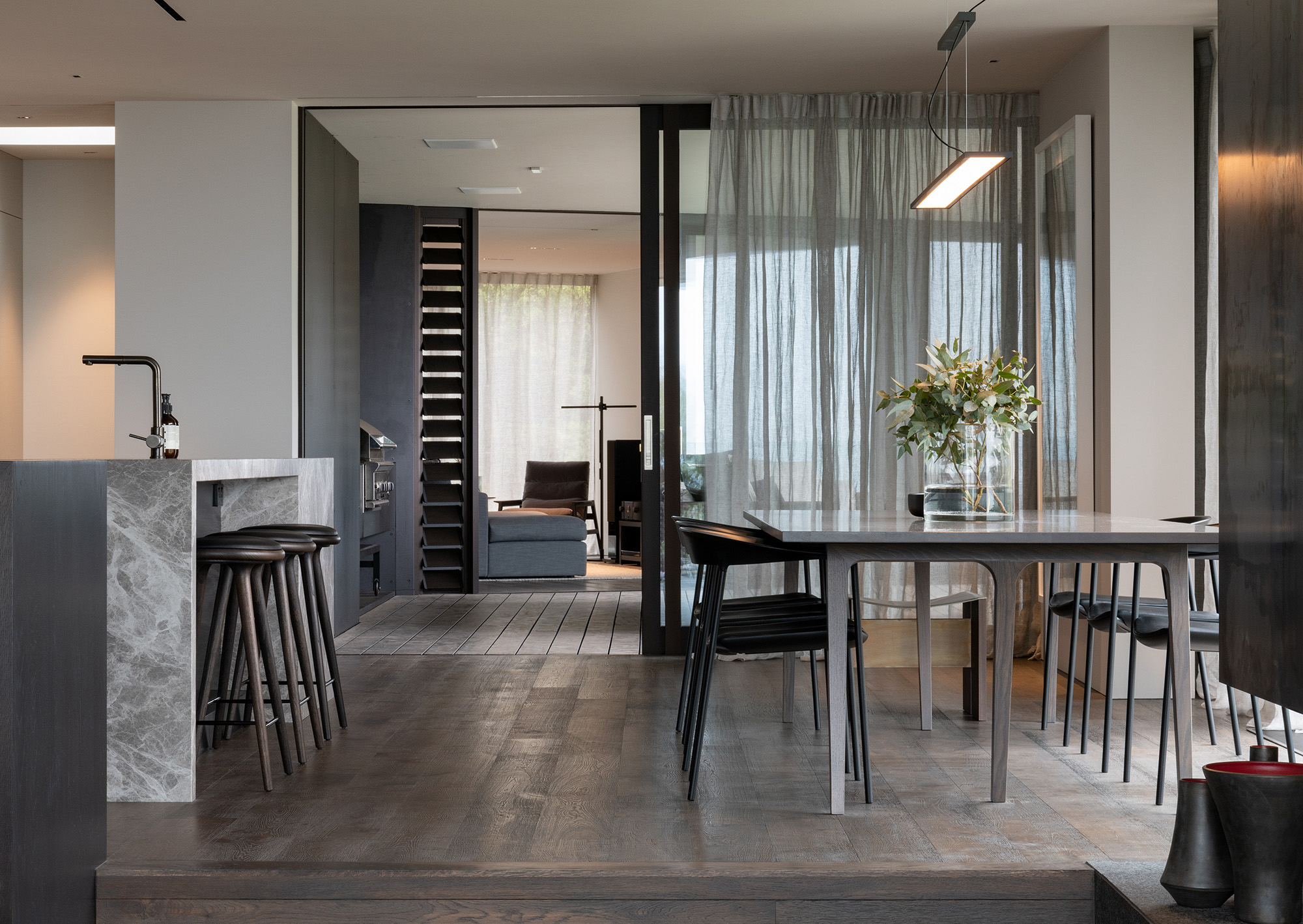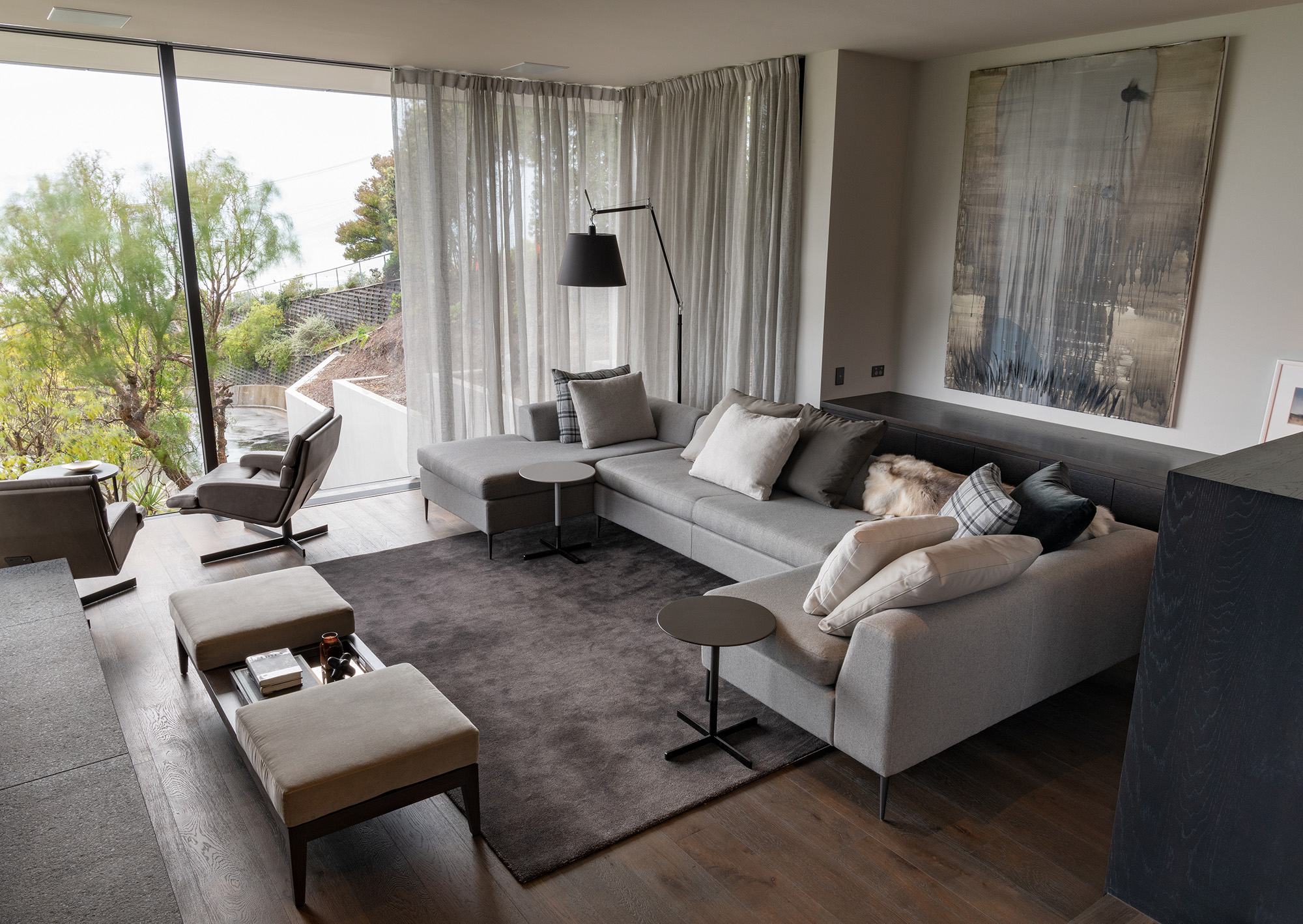 The architectural features and sophisticated interior palette blend seamlessly creating a rich, luxurious and timeless design. Stone, timber and mild steel are some of the materials used in this project, complimented by a subtle palette of oyster whites, black stained oak cabinetry and Italian mosaic tiles. We were careful in the selection of finishes, fixtures and materials to maintain a consistency between the exterior and interior. We repeated these exclusive finishes throughout, keeping the palette minimal and raw. A well thought out selection of furniture, lighting and art was an important factor in complimenting the hard fit out finishes and fixtures. A combination of Italian signature pieces and custom designed, New Zealand made sofas, tables and accessories, created well composed, elegant living spaces.