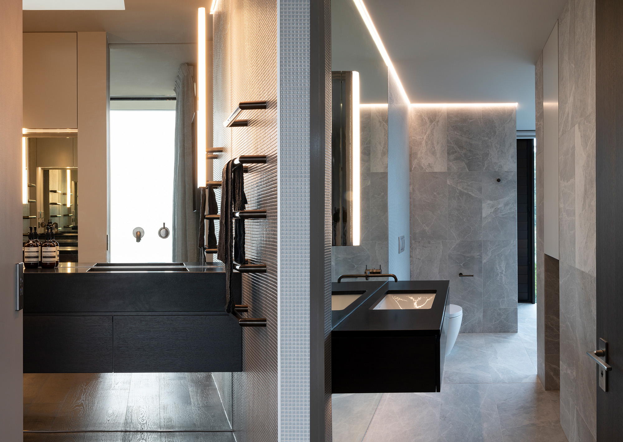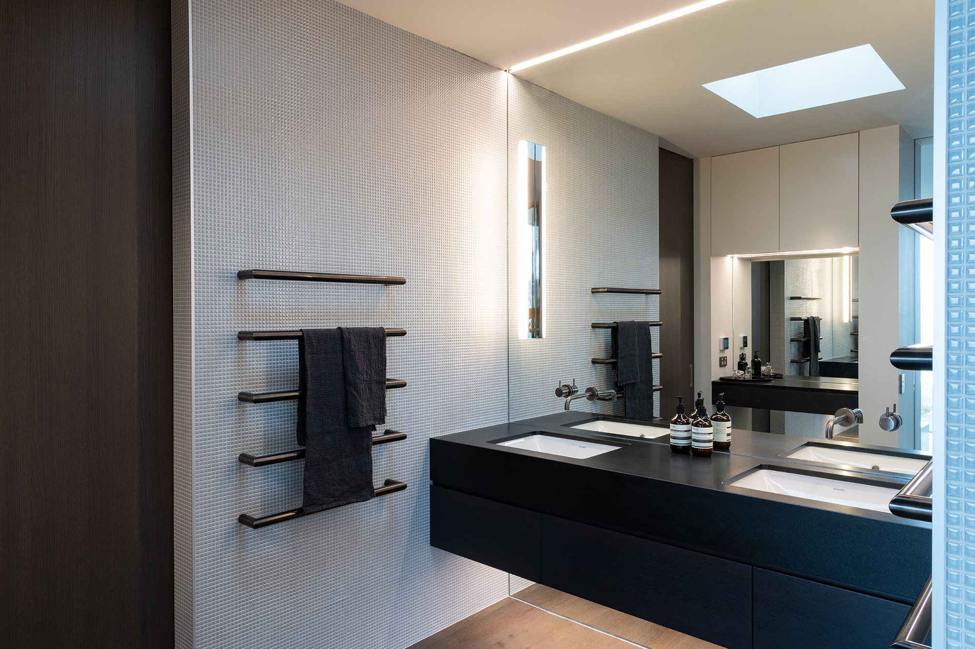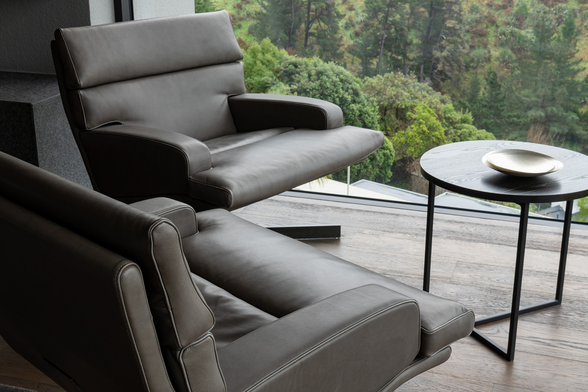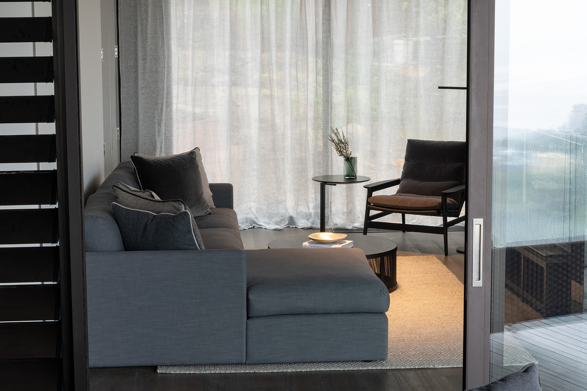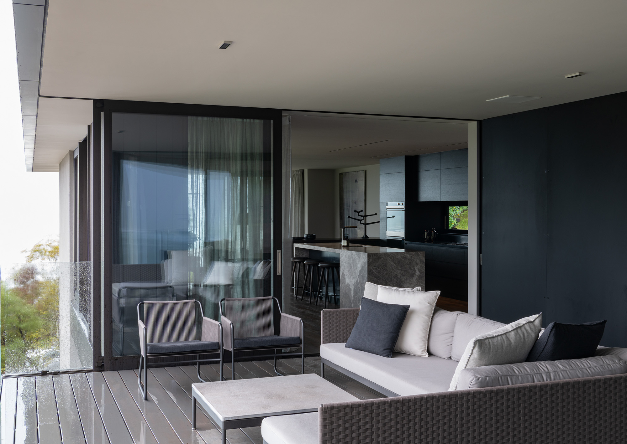 The architectural features and sophisticated interior palette blend seamlessly creating a rich, luxurious and timeless design. Stone, timber and mild steel are some of the materials used in this project, complimented by a subtle palette of oyster whites, black stained oak cabinetry and Italian mosaic tiles. We were careful in the selection of finishes, fixtures and materials to maintain a consistency between the exterior and interior. We repeated these exclusive finishes throughout, keeping the palette minimal and raw. A well thought out selection of furniture, lighting and art was an important factor in complimenting the hard fit out finishes and fixtures. A combination of Italian signature pieces and custom designed, New Zealand made sofas, tables and accessories, created well composed, elegant living spaces.