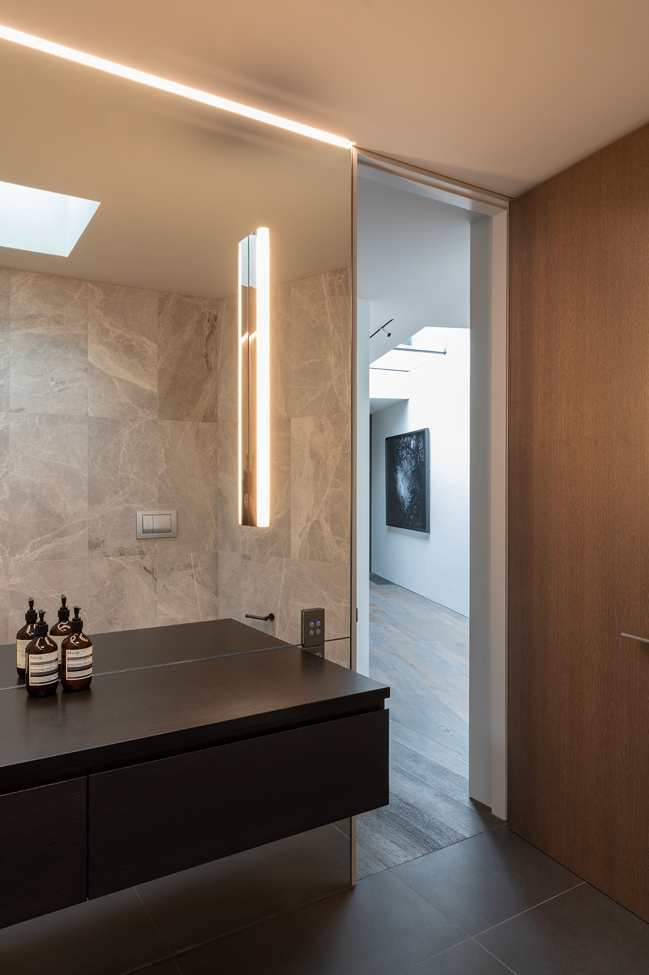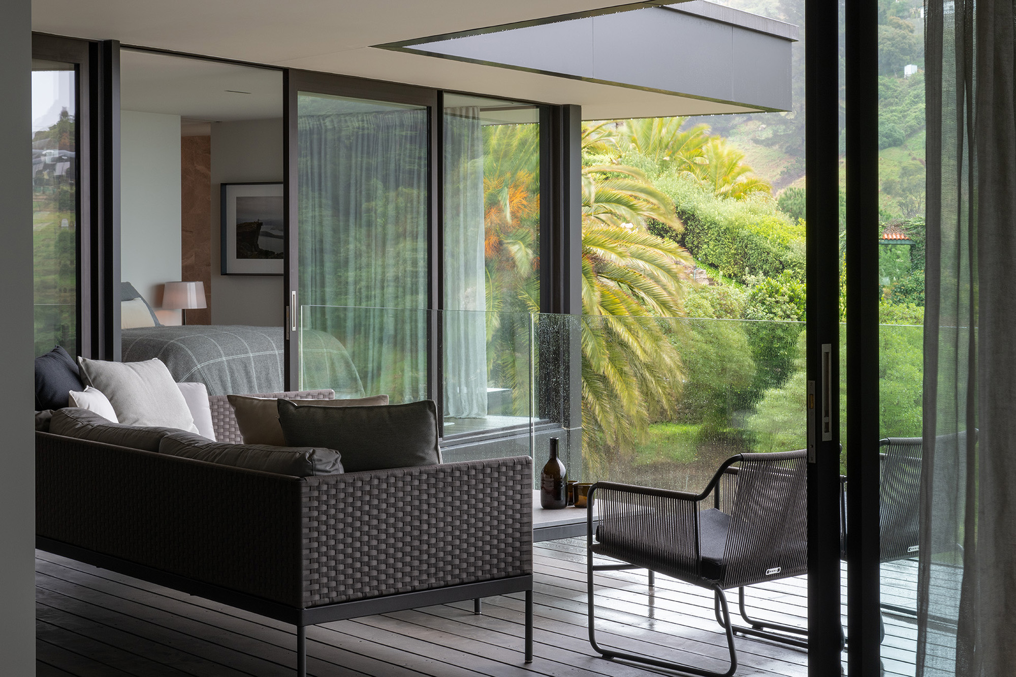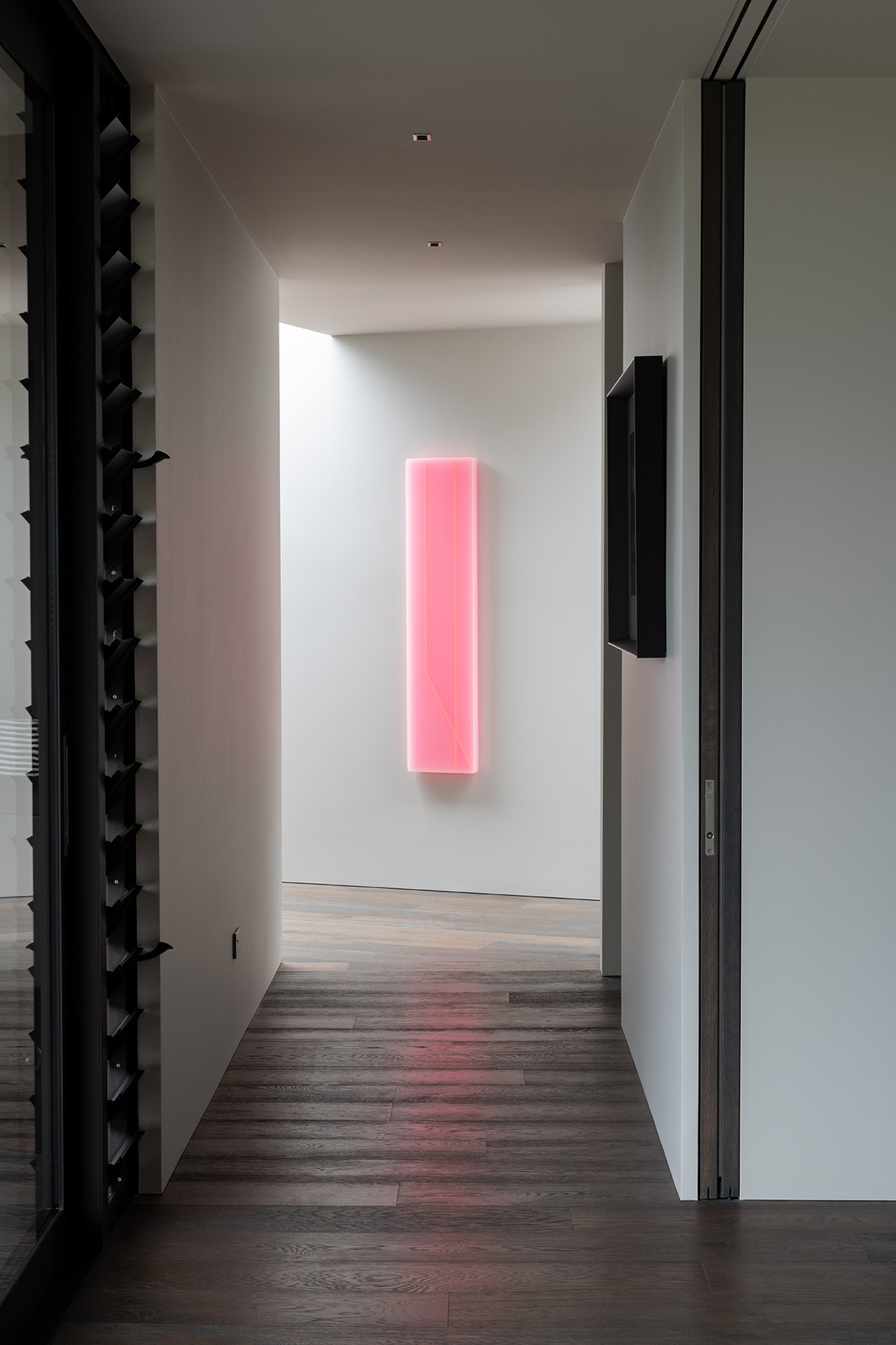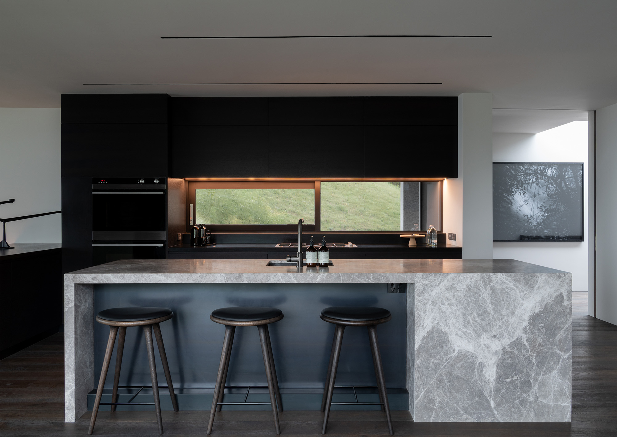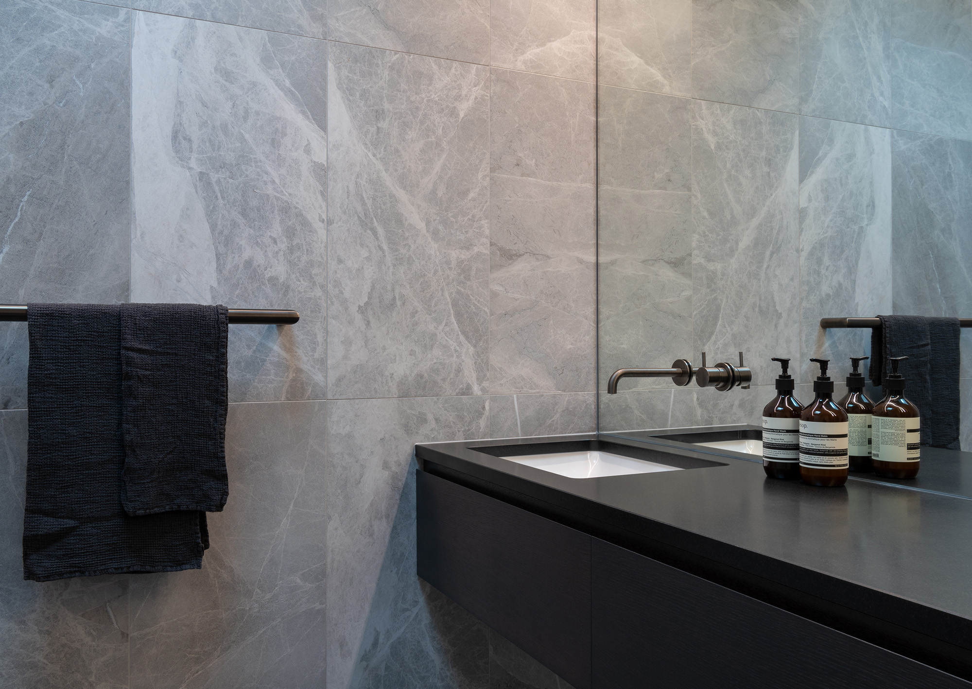 The architectural features and sophisticated interior palette blend seamlessly creating a rich, luxurious and timeless design. Stone, timber and mild steel are some of the materials used in this project, complimented by a subtle palette of oyster whites, black stained oak cabinetry and Italian mosaic tiles. We were careful in the selection of finishes, fixtures and materials to maintain a consistency between the exterior and interior. We repeated these exclusive finishes throughout, keeping the palette minimal and raw. A well thought out selection of furniture, lighting and art was an important factor in complimenting the hard fit out finishes and fixtures. A combination of Italian signature pieces and custom designed, New Zealand made sofas, tables and accessories, created well composed, elegant living spaces.