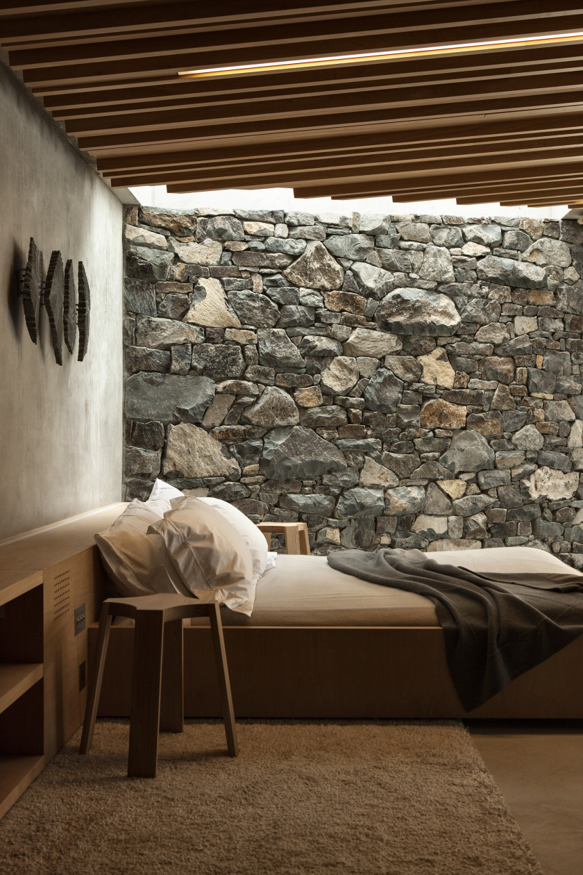 This retreat is built using all local materials and is constructed largely from rock quarried near its site with in-situ poured concrete floors and an earth turfed roof. The structure is integrated into the escarpment above to protect occupants from falling debris. The cottage is self-sustainable with respect to on-site water harvesting and wastewater treatment. The project incorporated an extensive reforestation and re-vegetation subproject.