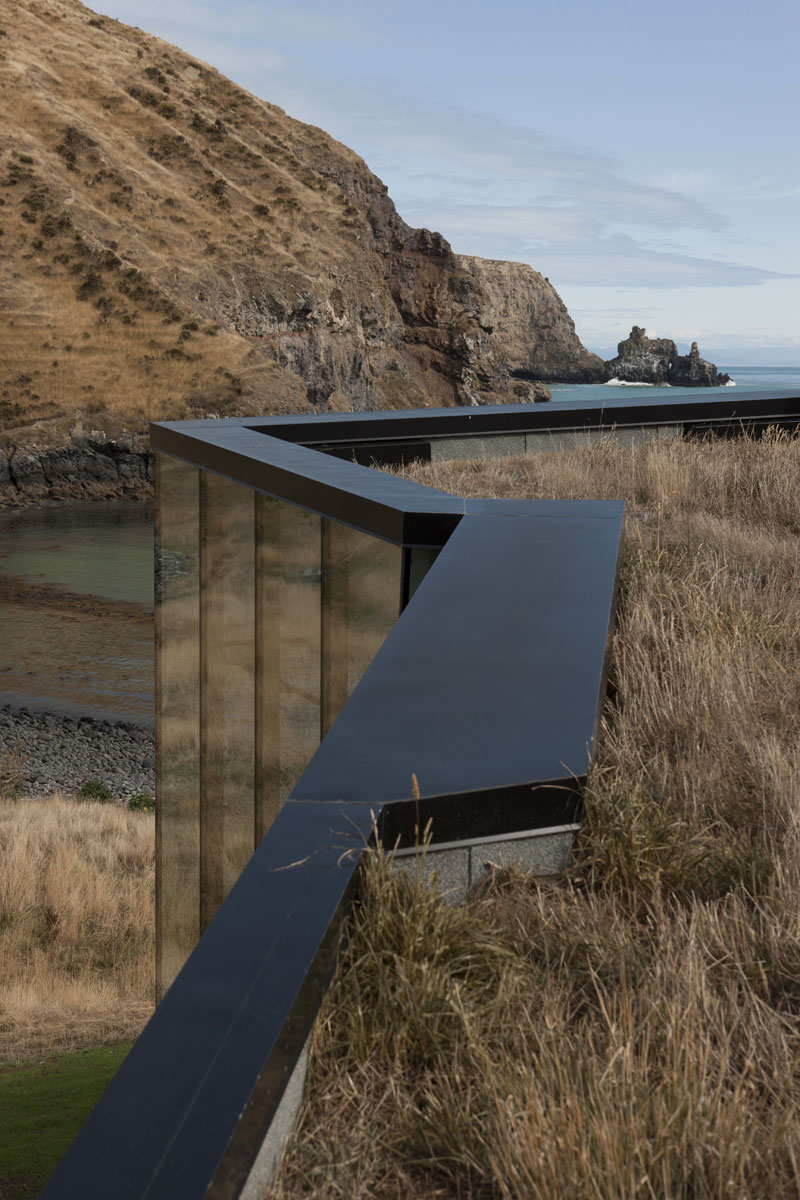 Its plan is an interlocking geometry responding to both near views of the Bay and far views out to Rocky Spires. It is lined with horizontal macrocarpa wood, this timber forms integrated joinery, wall and ceiling panels behind double glazed low e-glass in storm and shatterproof steel mullions which utilise earthquake resistant sliding heads.