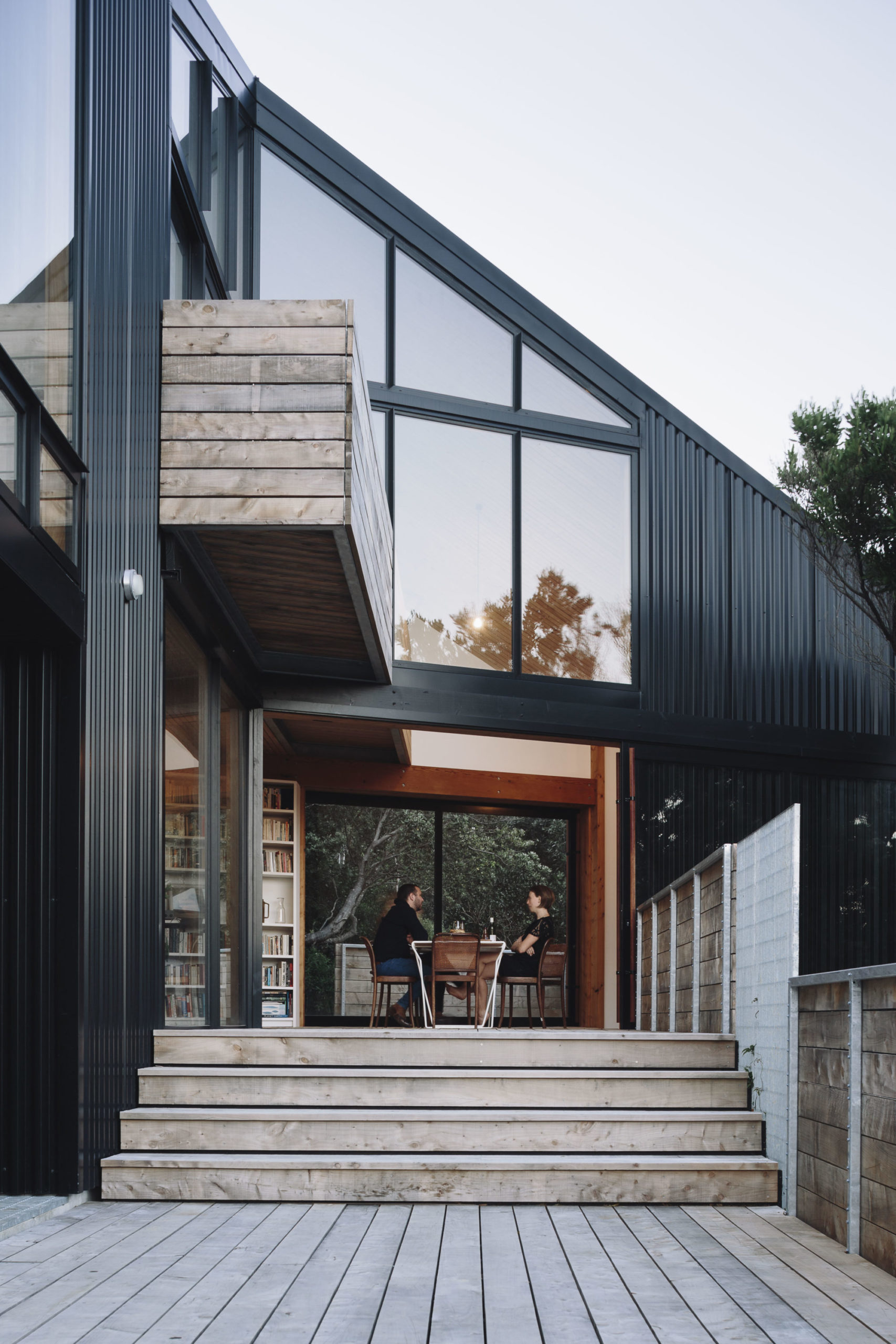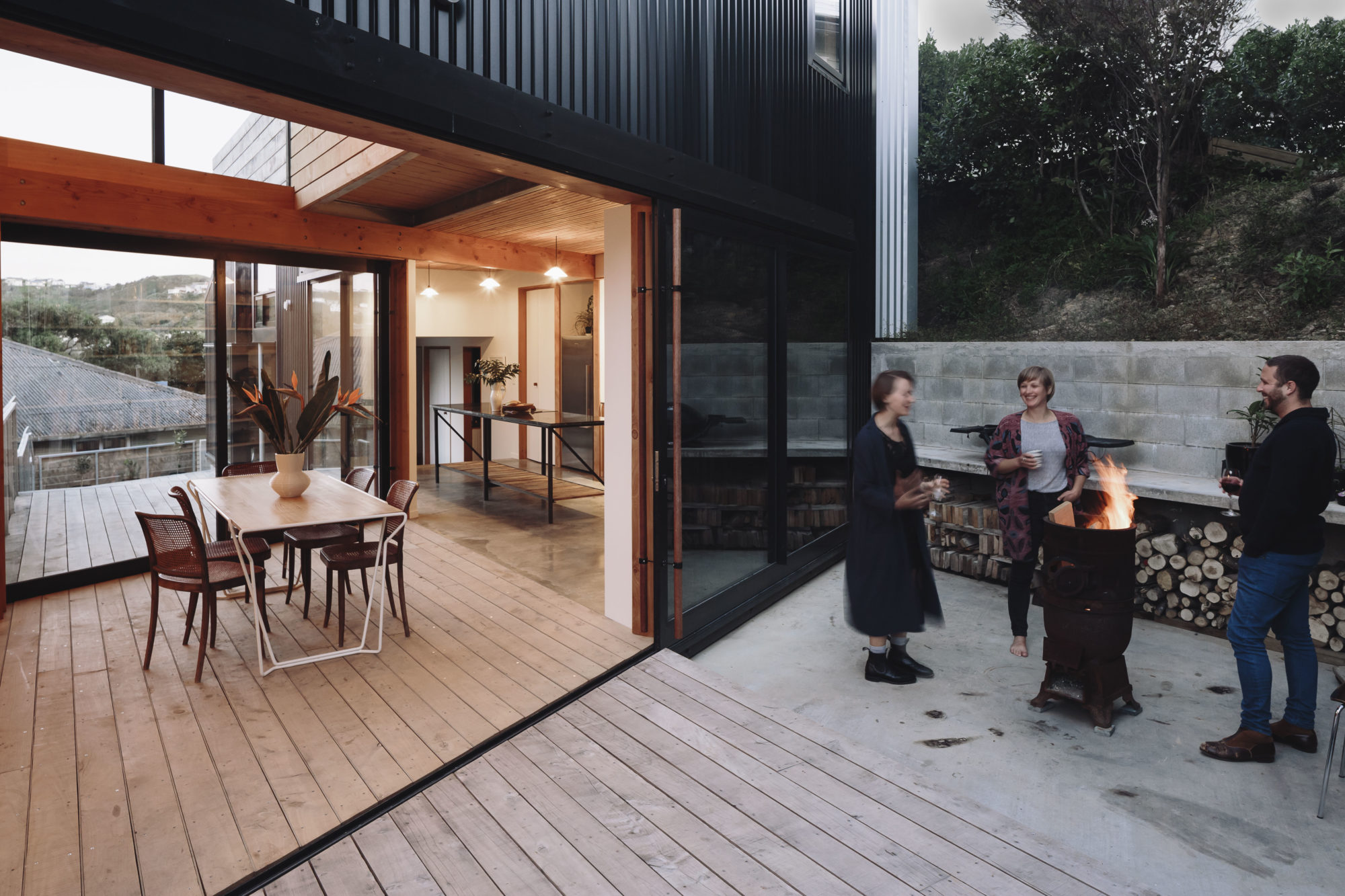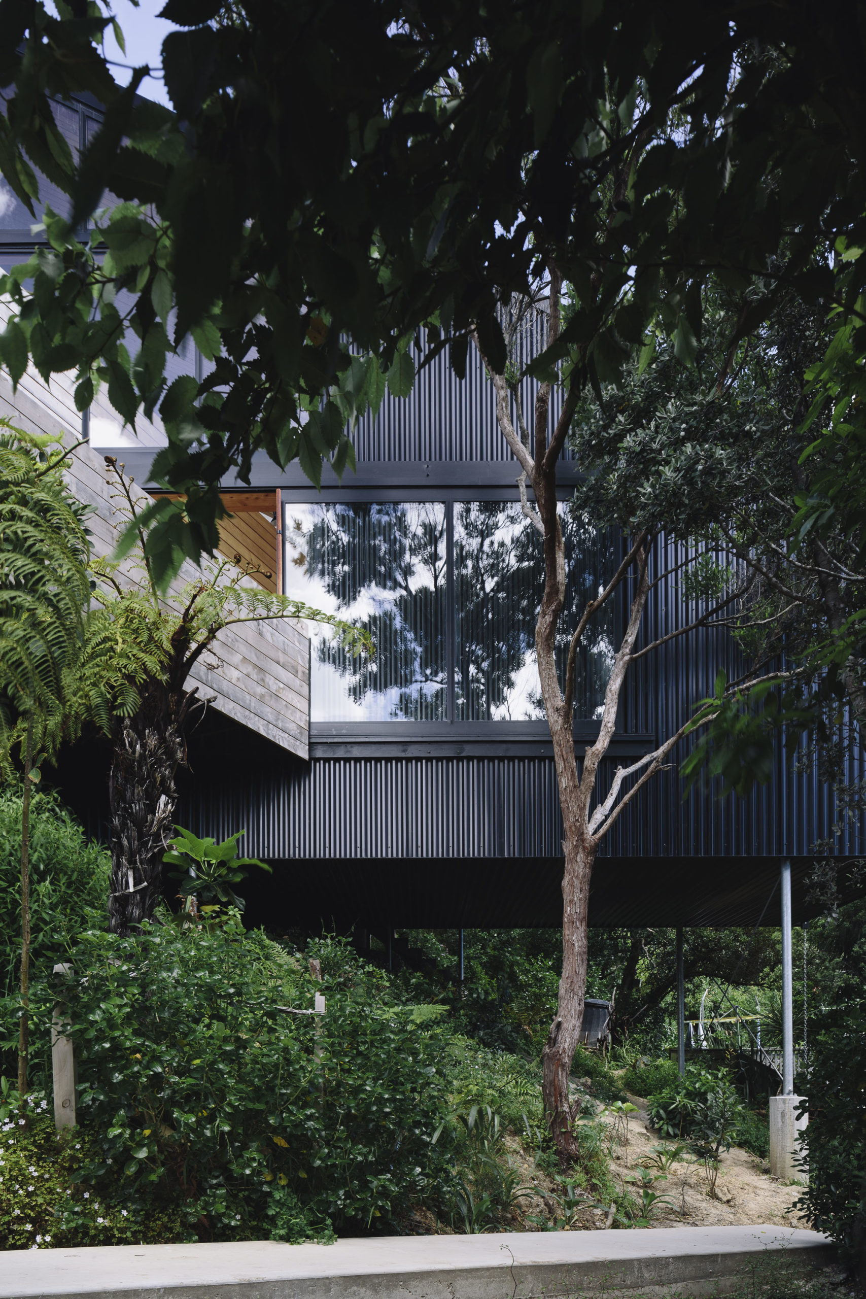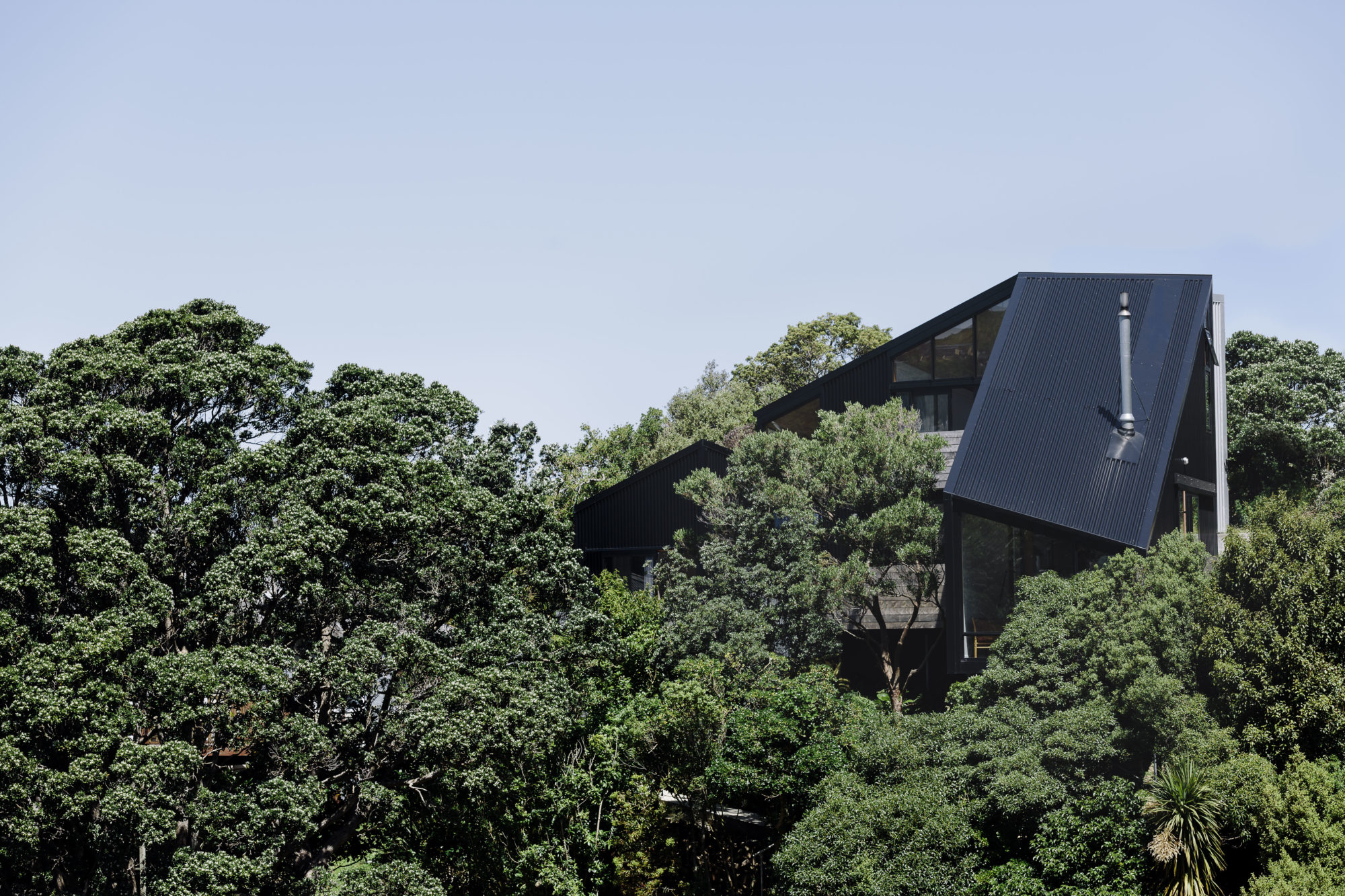 This 135 square metre house is located in an inner-city Wellington suburb. Tight sunlight planes from all four neighbours, luscious existing native vegetation and a steep slope on an unusually shaped site determined the folded boomerang shape.