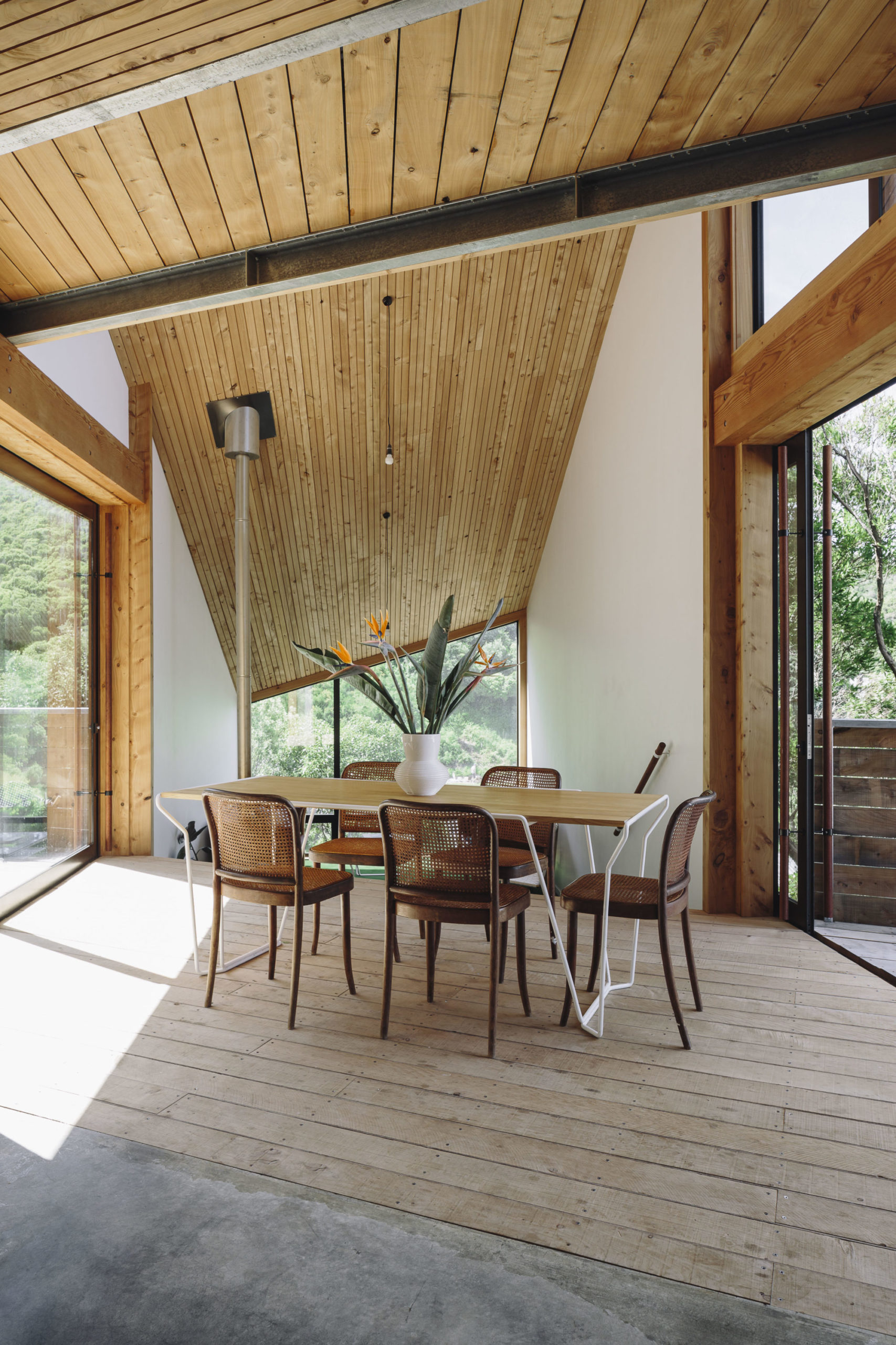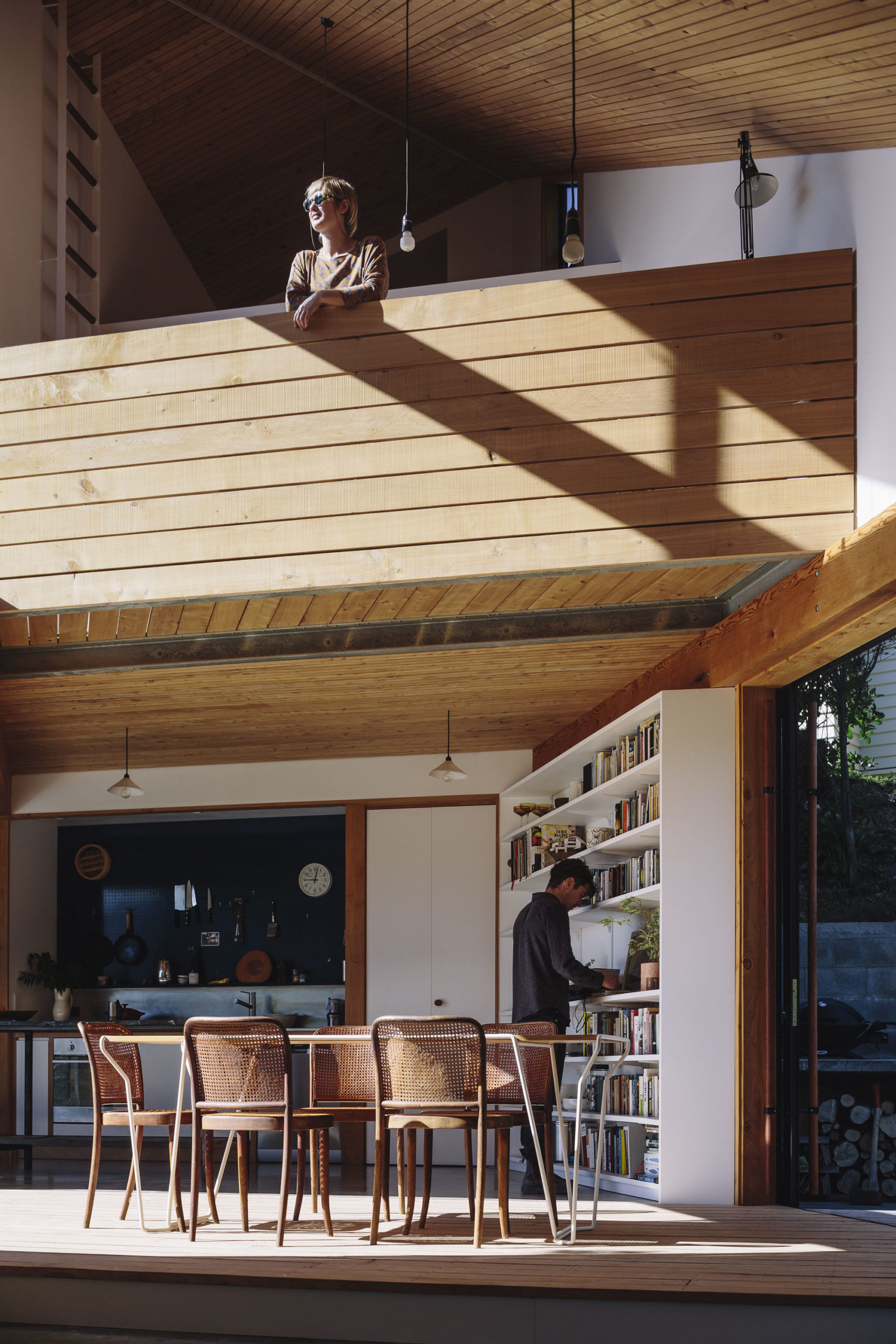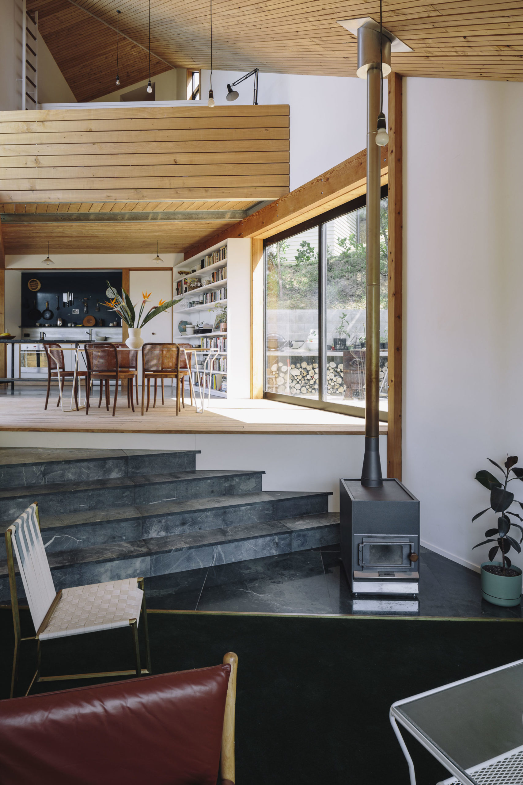 Internal living spaces fluctuate between lofty and voluminous, snug and cosy, with an intimate sunken lounge offering views upward of the two-tiered mezzanine. Large sliding doors on both the east and west face open up to connect the sunlight catching decks with the central dining. Three bedrooms have varied views, from the immediate garden, to distant hills. Found and recycled elements throughout the house add rich textures – with the use of one tonne of free green marble in various guise from hearth to shower, Oregon beams and even an old jam pan for a bathroom sink.