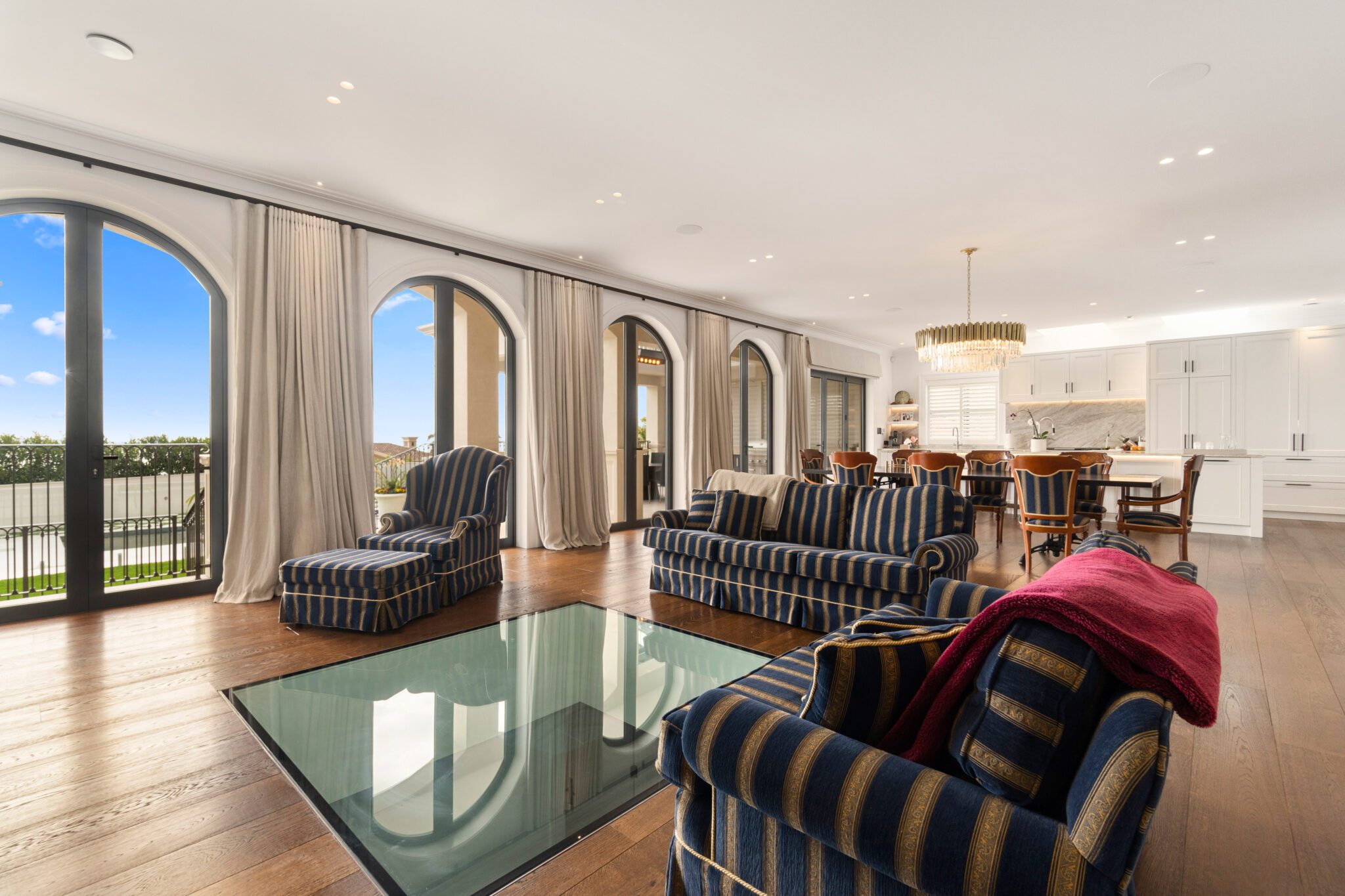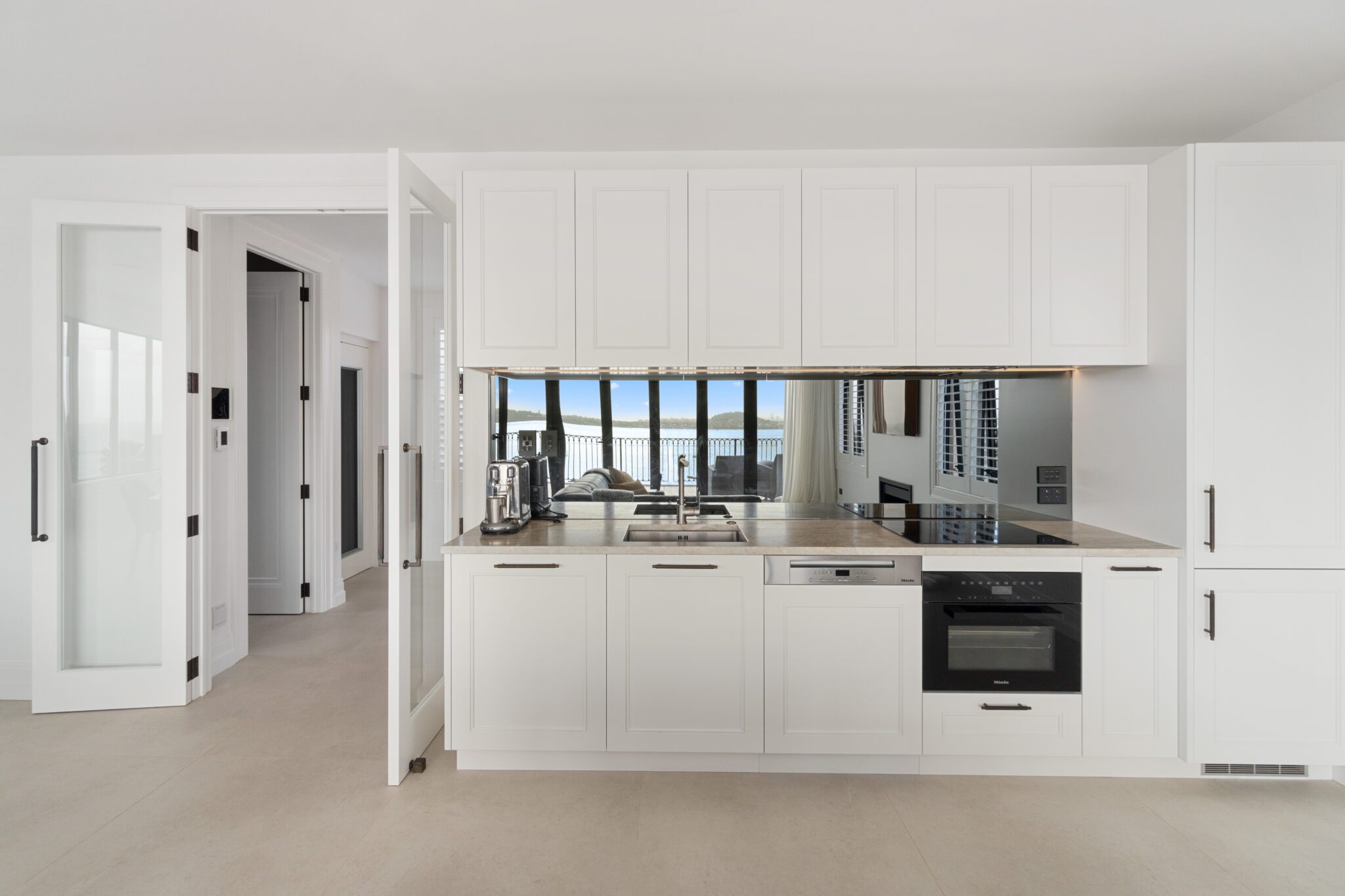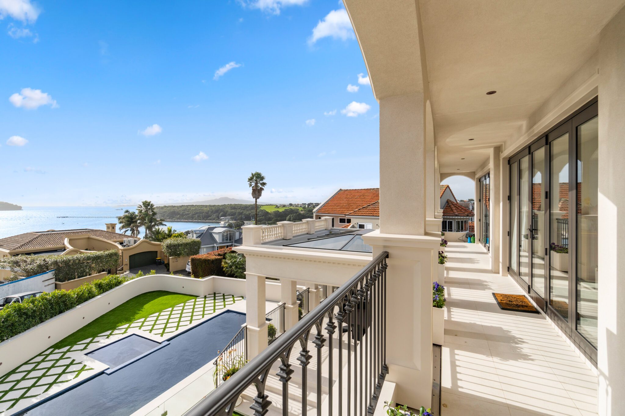 The Italian-style home sits on a stunning site that looks out to Rangitoto, with breathtaking water views from every level. Balustrades wrap from the top floor down to the basement, and our clients can choose to take the elevator or walk the stairs between floors.