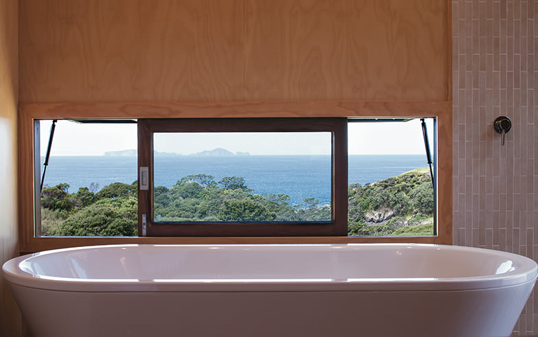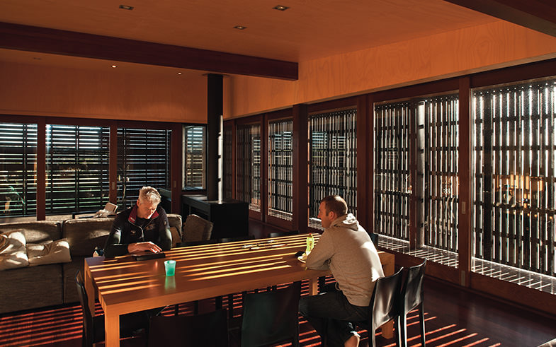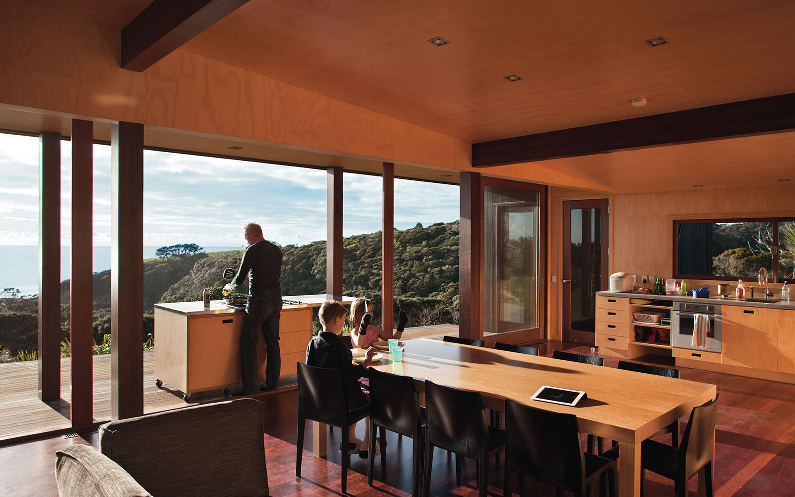 The plan is organised around a central spine, with spaces oriented to specific views. The open-plan living area flows onto a generous northern deck open to the view, and also to an alternative sheltered space with barbecue and outdoor fireplace to the north-west. The bedrooms are more protected, with shutters that lift up to provide protection from summer sun, maintaining cooler temperatures.