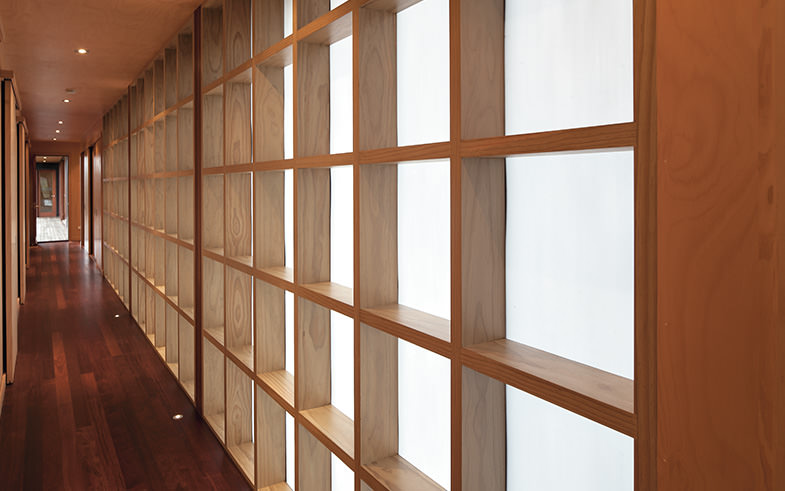 Materials are almost exclusively timber: stained cedar shiplap cladding and hoop-pine plywood wall and ceiling linings. The exposed structure is saligna, and flooring is kwila. Translucent elements are used in parts of the roof and cladding, introducing a delicate light quality to the circulation space and outdoor fire area.