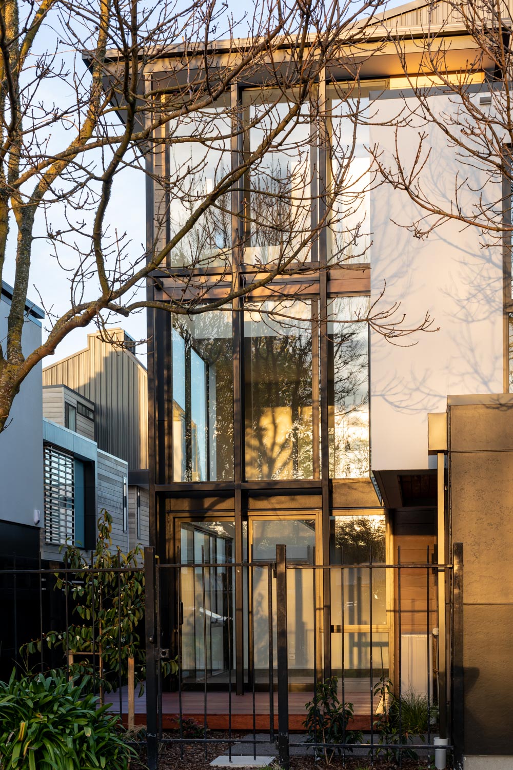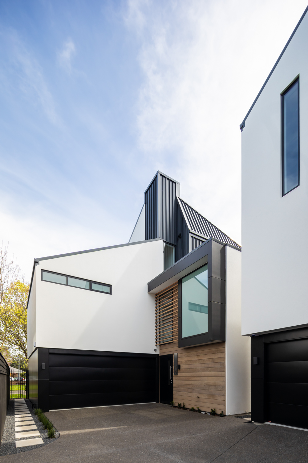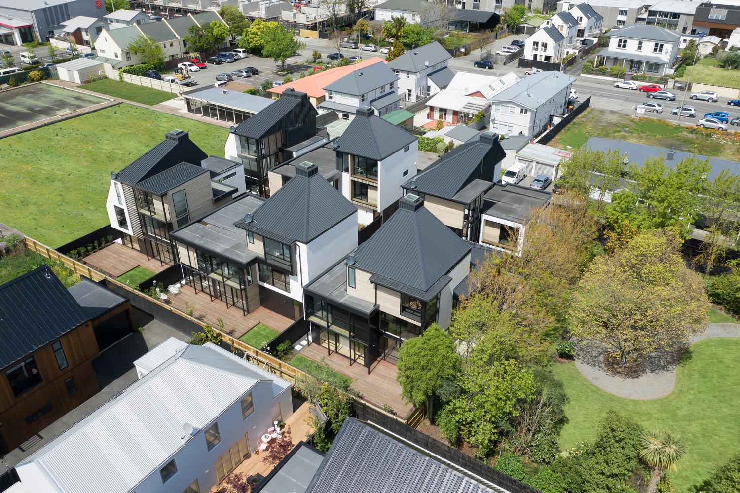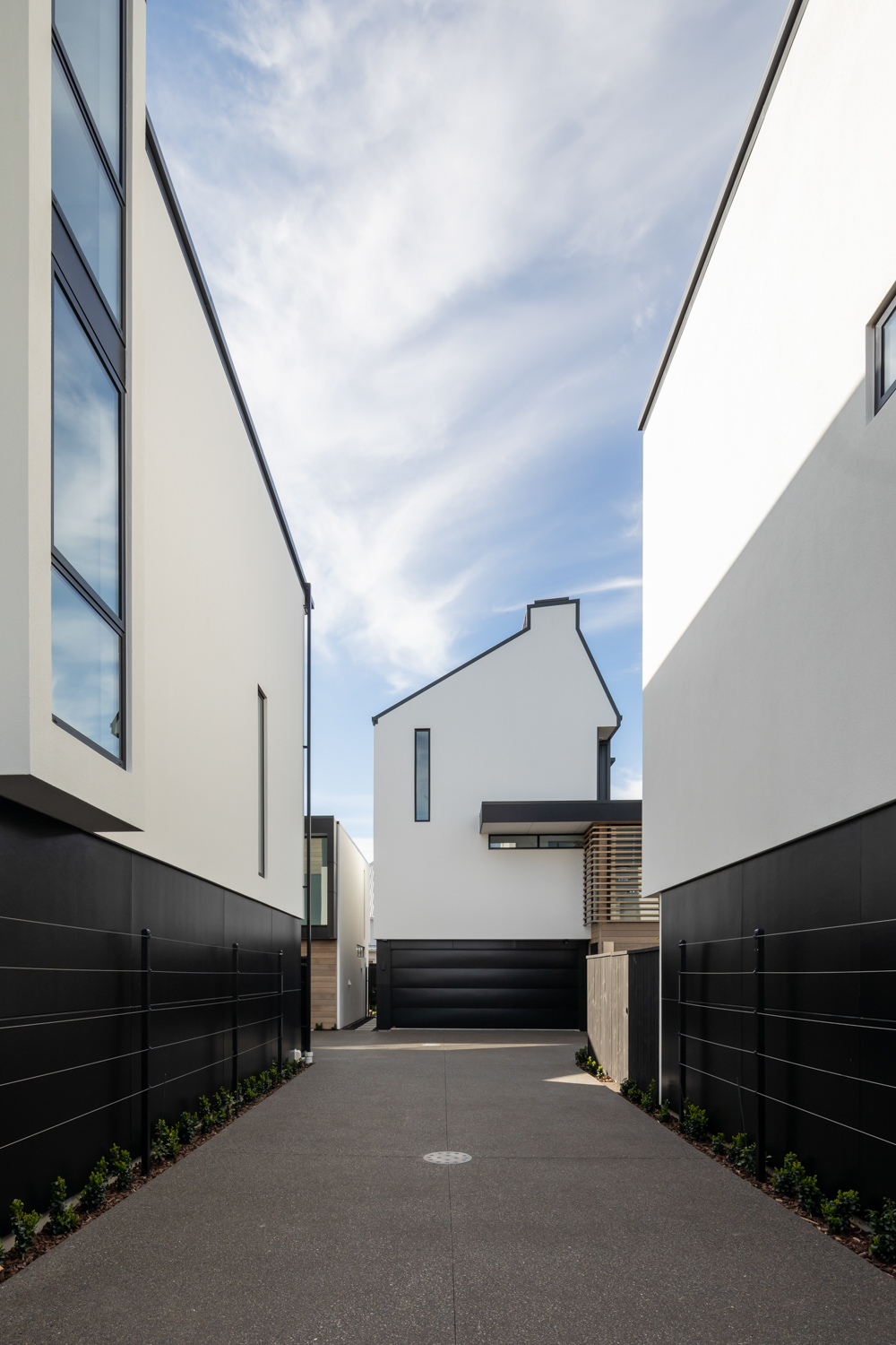Located near Christchurch central city, the Urban Village Townhouses are designed for medium-density urban living. The brief was to provide 6 triple floored free-standing townhouses that would capture the sun and provide private indoor-outdoor living away from the street edge. The design concept was focused on creating a ‘village-like’ atmosphere with pathways between units, upper floor living with access to views, and a shared ‘courtyard’ of sorts at ground level. A strong connection to the neighbouring reserve was important, this was achieved by providing shared pedestrian access that links directly into the central courtyard area.