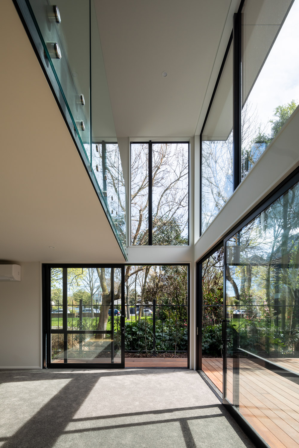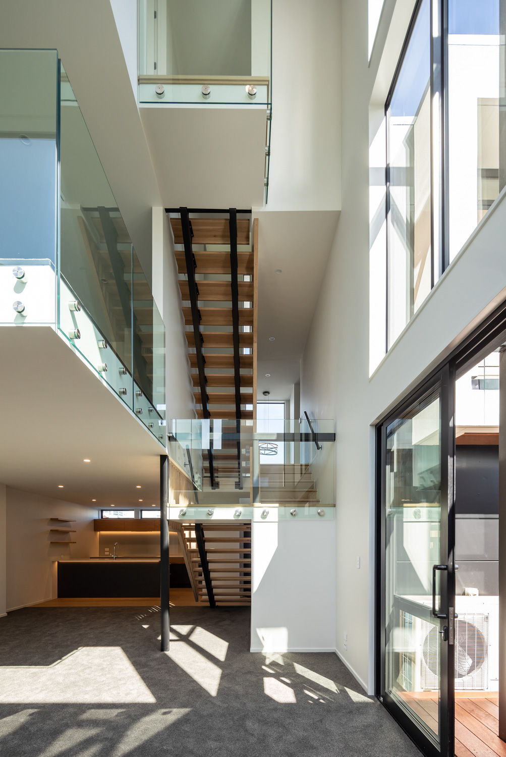 The playful arrangement of space continues into the building interiors, where tall atrium-style entrance halls and lofty timber feature stairs showcase the full height of the Units. The internal spaces are equipped for modern living, with well-appointed kitchens and open plan living areas and generous mezzanines. The building elements combine to create a connection with the local surroundings while also ensuring a sense of seclusion within, the fully glazed voids in the living areas open out to the views but are oriented carefully to provide privacy.