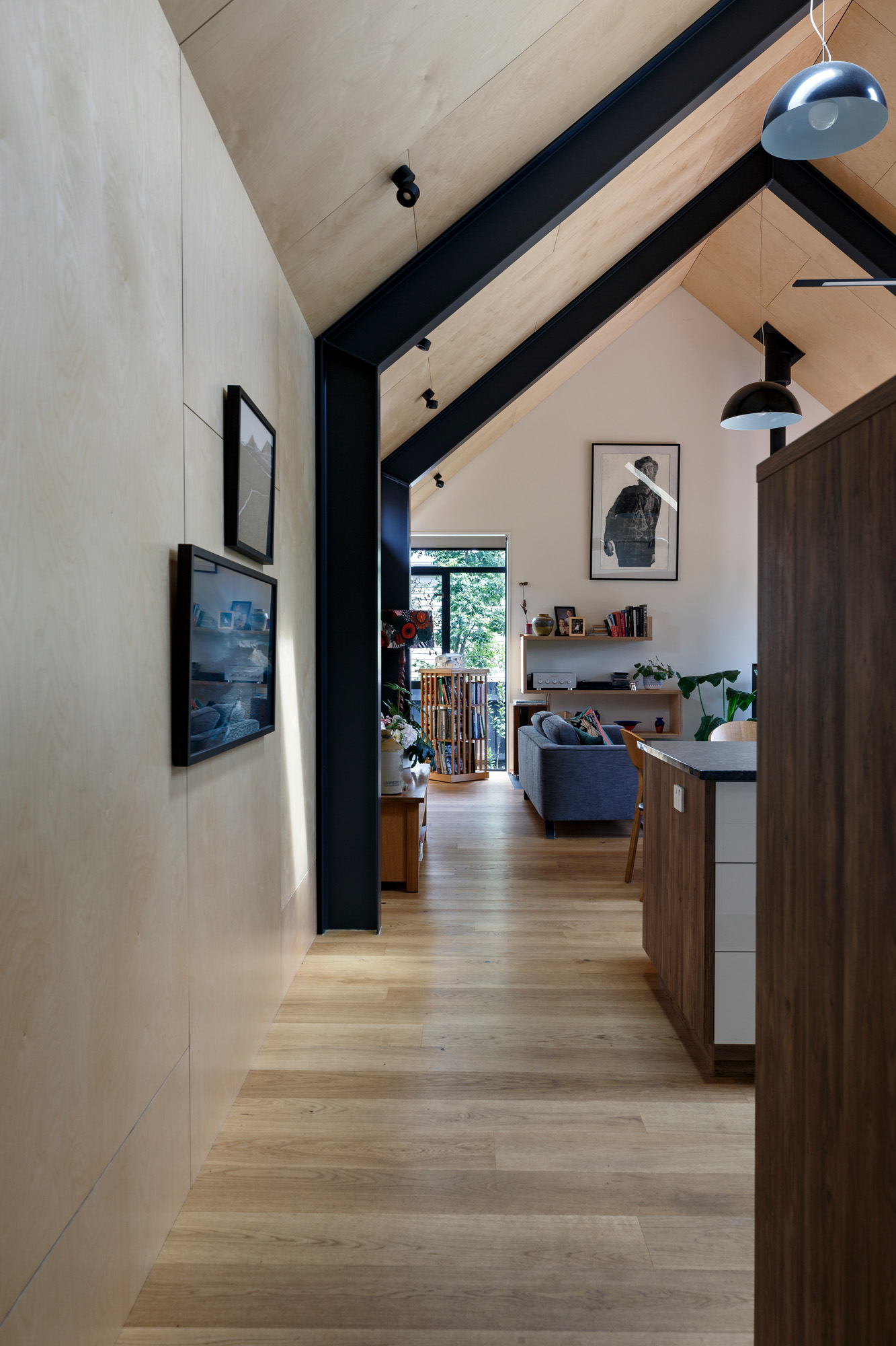 The design creates a large double height family room, including the kitchen, dining and living. A library / reading room can be accessed from the same space, as can two separate small home offices. The layout includes a gallery space that links the main living and work areas to the bedroom wing, affording long views through the house to the street and gardens beyond.